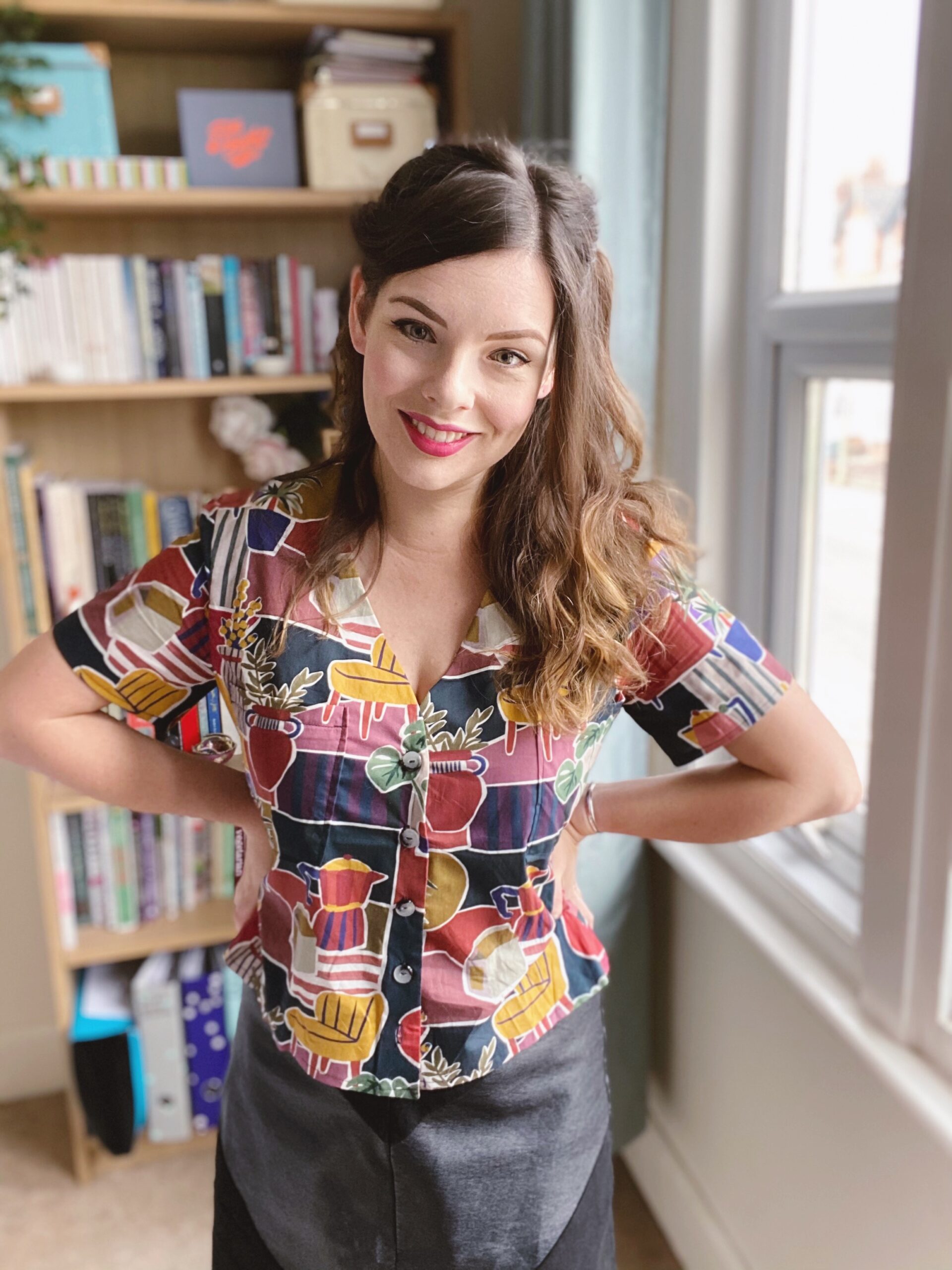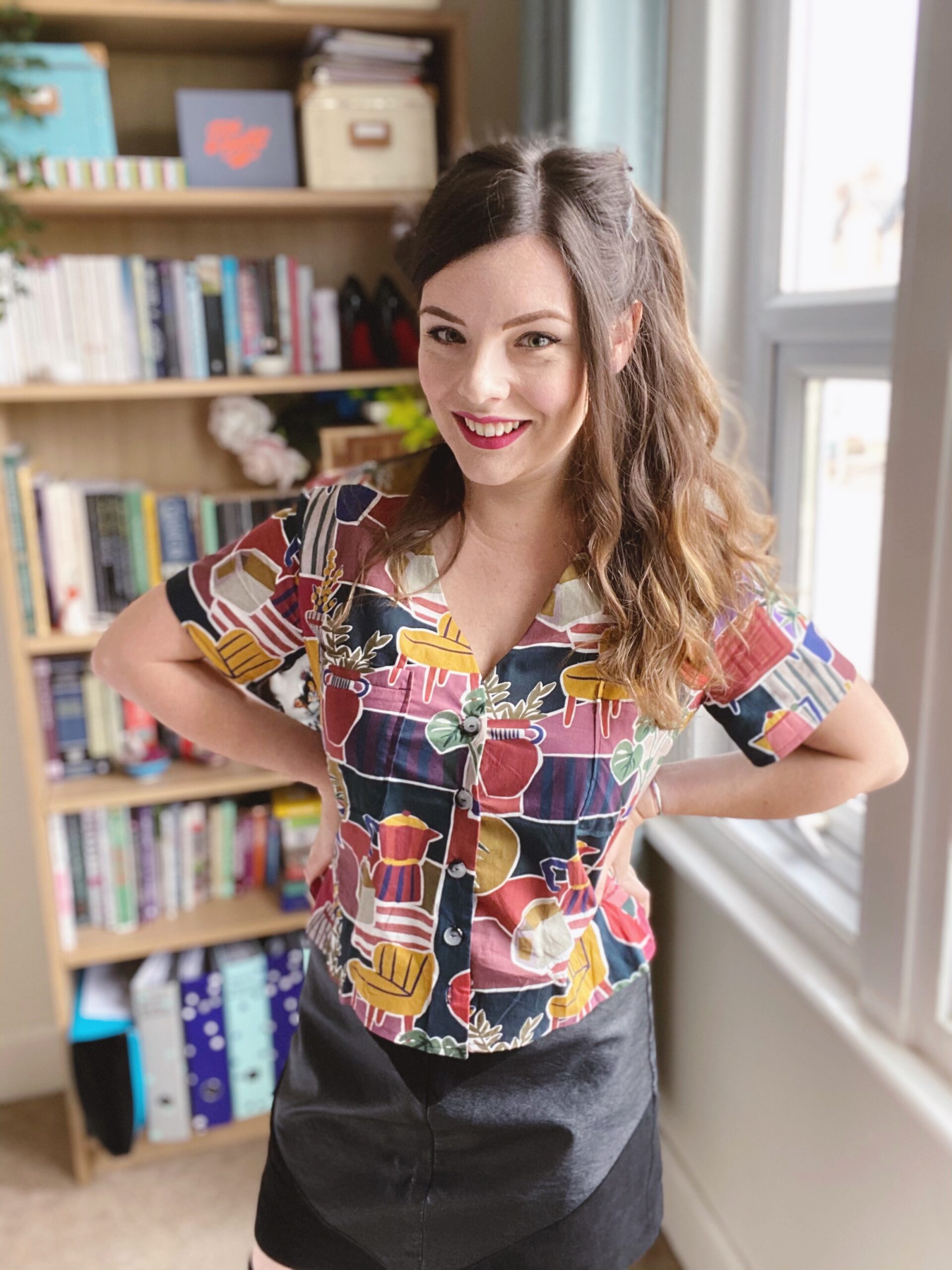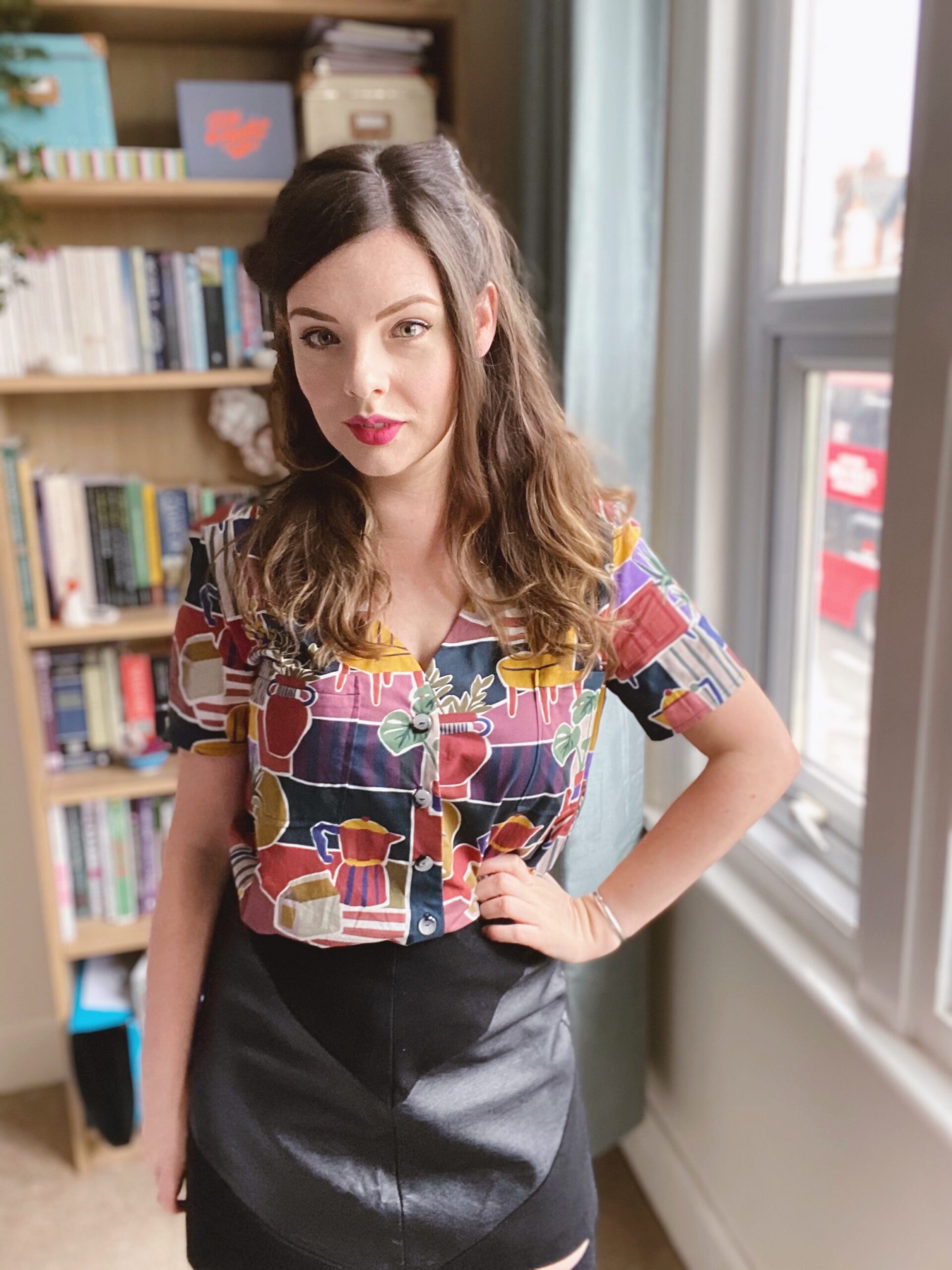 Although I tend to favour fancy additional design elements (collars! ruffles! gathering! pleats! ridiculously OTT sleeves!), I knew this print alone was enough to suit a more understated pattern design — no bells and whistles this time. I was leaning towards a classic button-up shirt, as I keep giving myself sewing challenges this year (like learning to sew with stretch fabrics) and I have not made a shirt yet. I decided to go for McCalls 8067 (also known as #LivMcCalls), which is a pretty simple loose-fitting blouse with four options. I went for View A, which is at a cropped length with short sleeves and no collar or lapel, but I will definitely be making the other options in the future; it is a really great little pattern. Despite being a cropped option, I like that this shirt is long enough to be tucked into high-waisted skirts and I like how it looks untucked over jeans. I also like the v-neck isn’t too deep either, which means I can wear this to work.