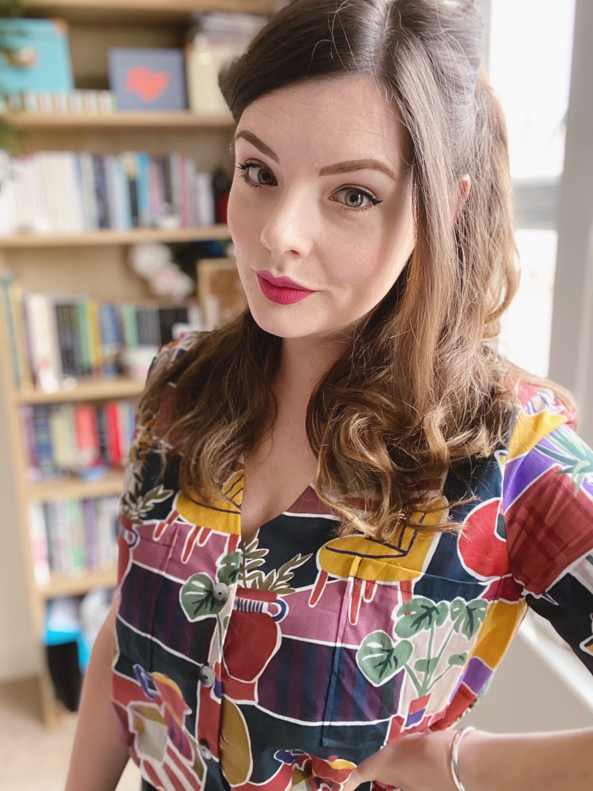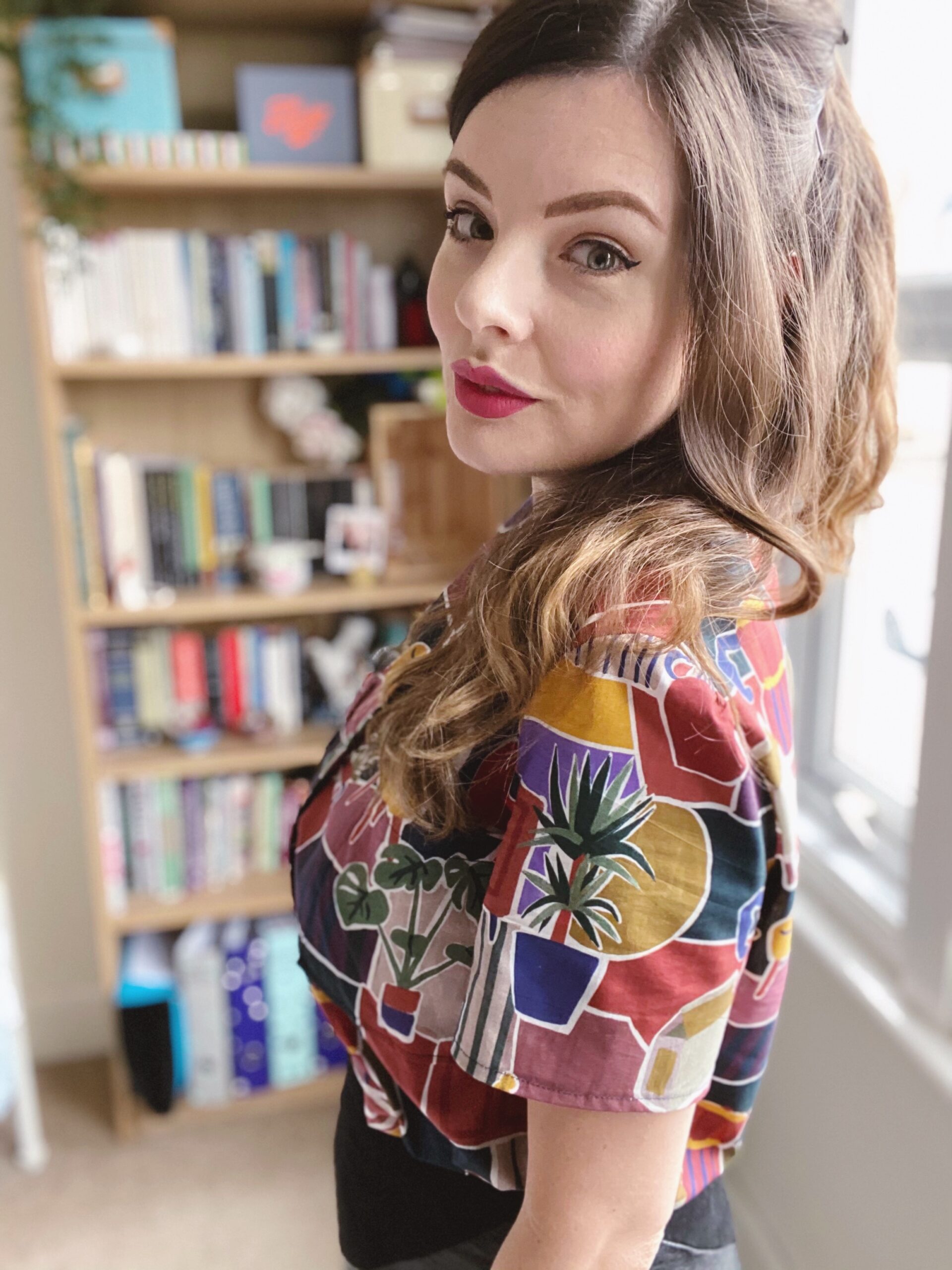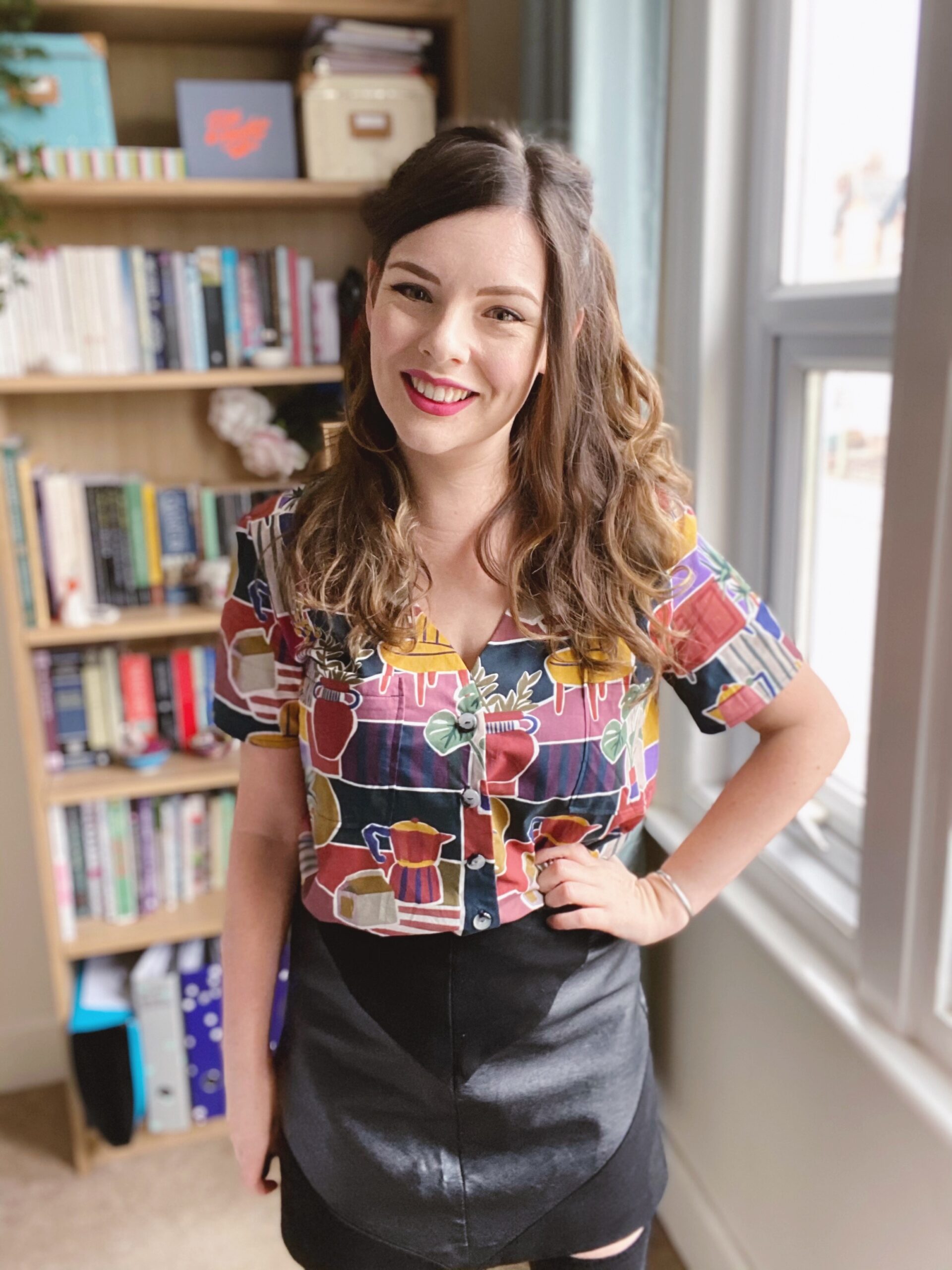 Although I tend to favour fancy additional design elements (collars! ruffles! gathering! pleats! ridiculously OTT sleeves!), I knew this print alone was enough to suit a more understated pattern design — no bells and whistles this time. I was leaning towards a classic button-up shirt, as I keep giving myself sewing challenges this year (like learning to sew with stretch fabrics) and I have not made a shirt yet. I decided to go for McCalls 8067 (also known as #LivMcCalls), which is a pretty simple loose-fitting blouse with four options. I went for View A, which is at a cropped length with short sleeves and no collar or lapel, but I will definitely be making the other options in the future; it is a really great little pattern. Despite being a cropped option, I like that this shirt is long enough to be tucked into high-waisted skirts and I like how it looks untucked over jeans. I also like the v-neck isn’t too deep either, which means I can wear this to work.