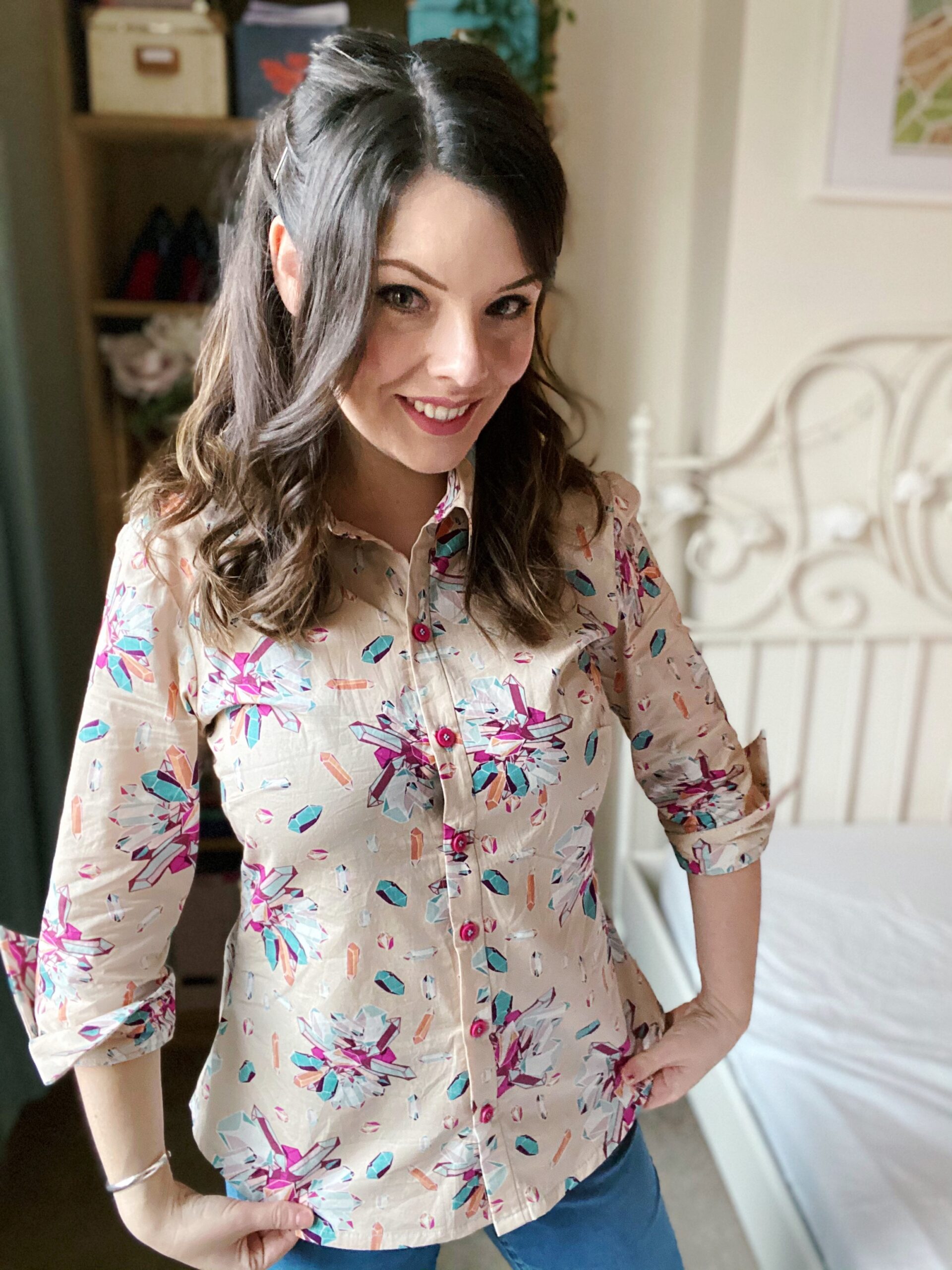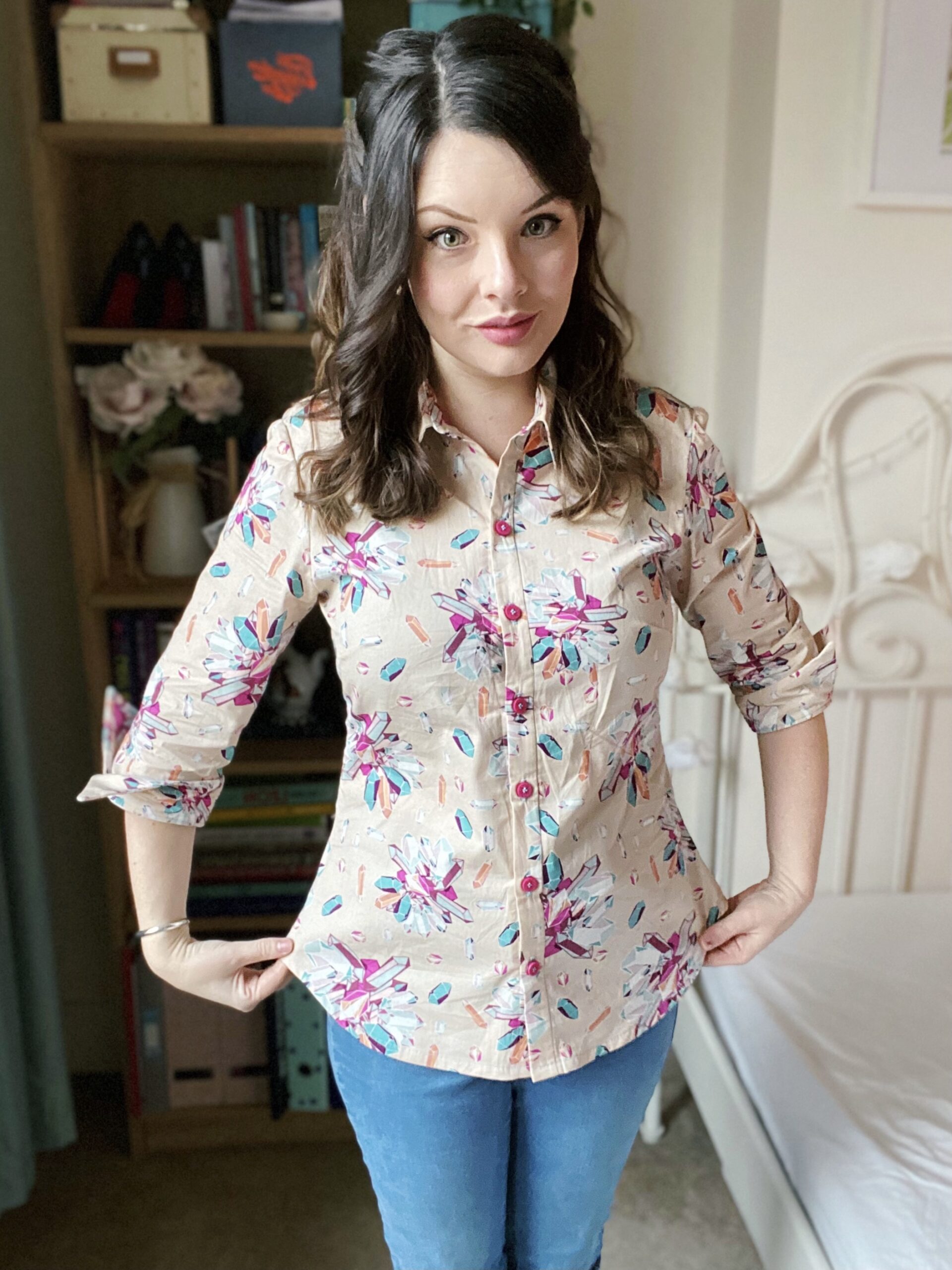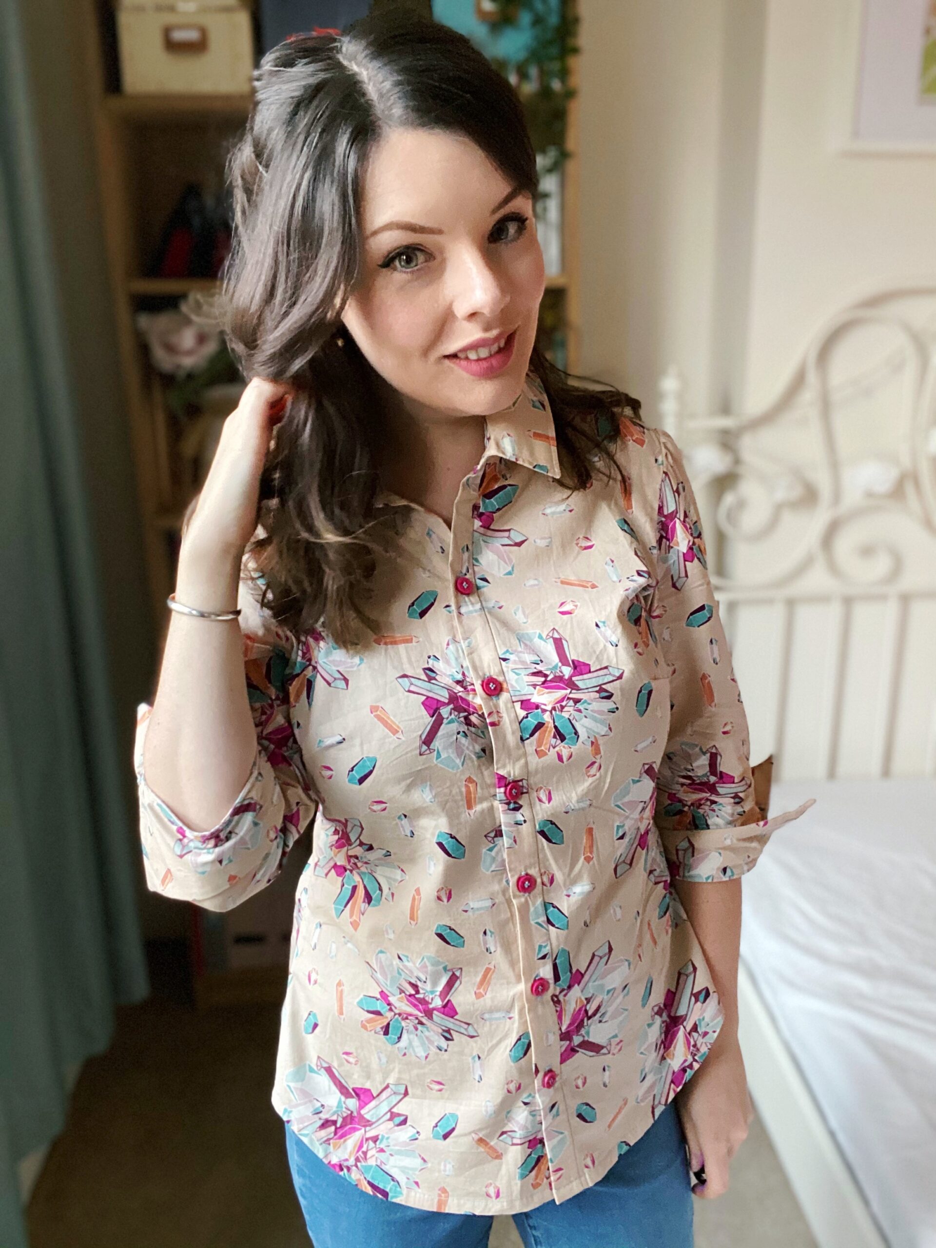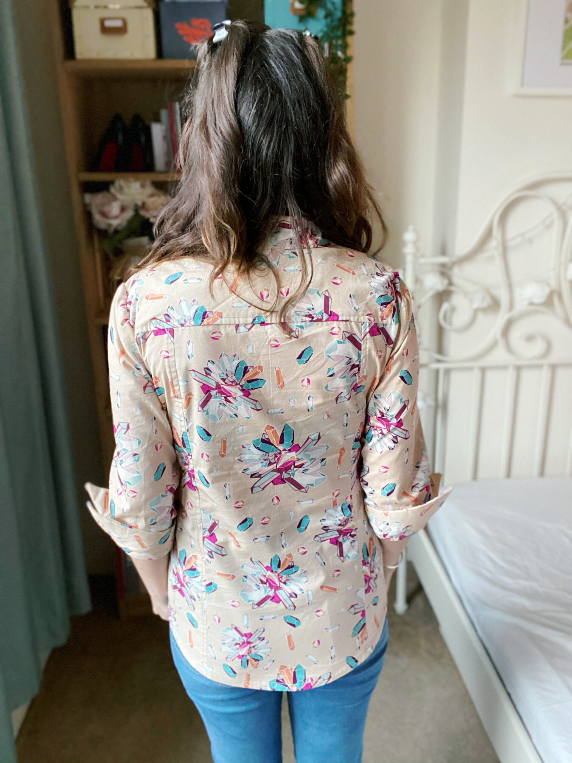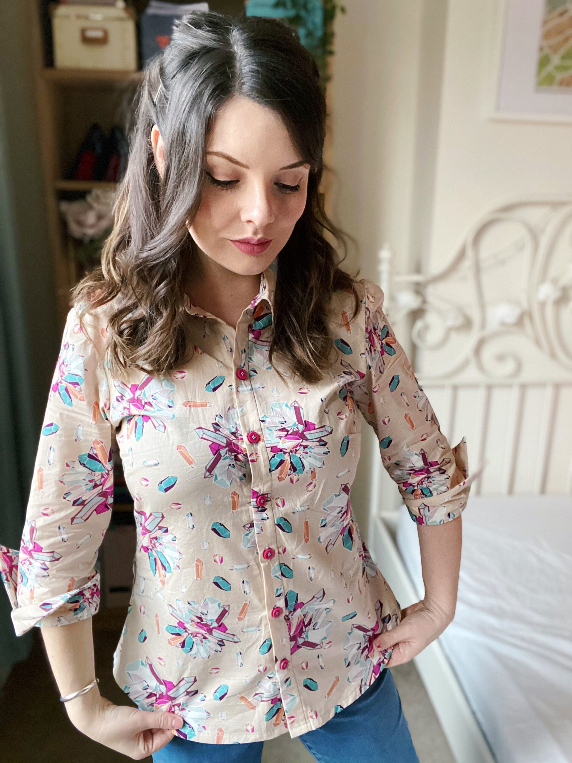 Let’s talk about fabric first, because isn’t this print just so fun? Fun fact about me: my dad is a crystallographer and we once went to a whole museum dedicated to crystals and gemstones in Freiberg when I still lived in Germany (who says we don’t know how to have a good time…?). This Art Gallery Cotton Poplin has such a bold palette of turquoise and fuchsia crystals on a taupe background, and the print is non-directional — as if the crystals have been scattered in all directions! I am a little in love with the Art Gallery poplins (my other #MinervaMake from earlier in December was a floral poplin) as they are really good-quality: soft to the touch, not too weighty, a smooth hand and super-easy to sew with. Don’t forget though that these poplins tend to be on a narrow bolt; this is only a 110cm wide, so I made sure the Granville shirt pattern was also suitable for narrow fabric options.