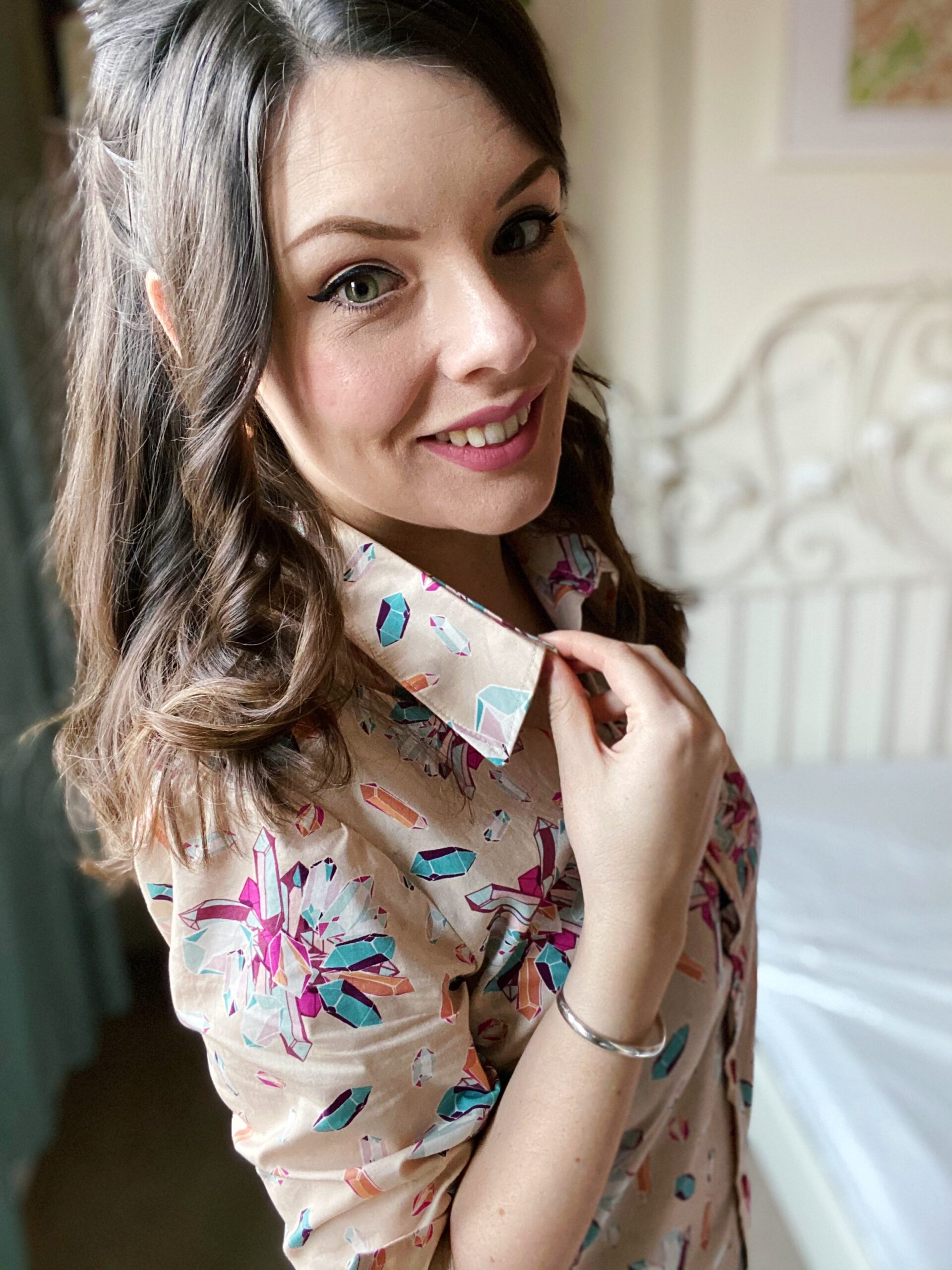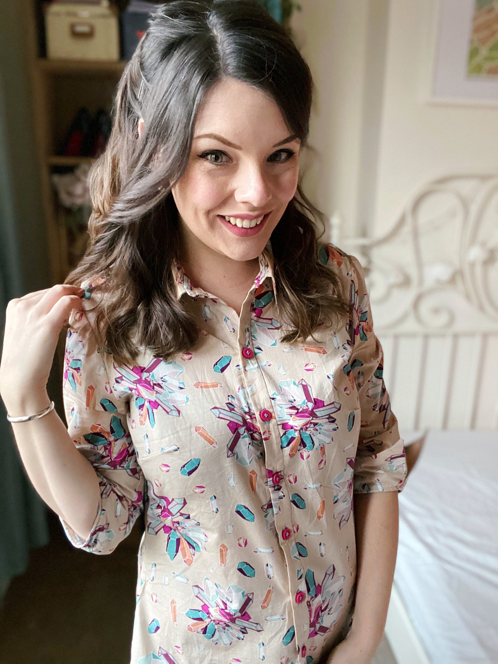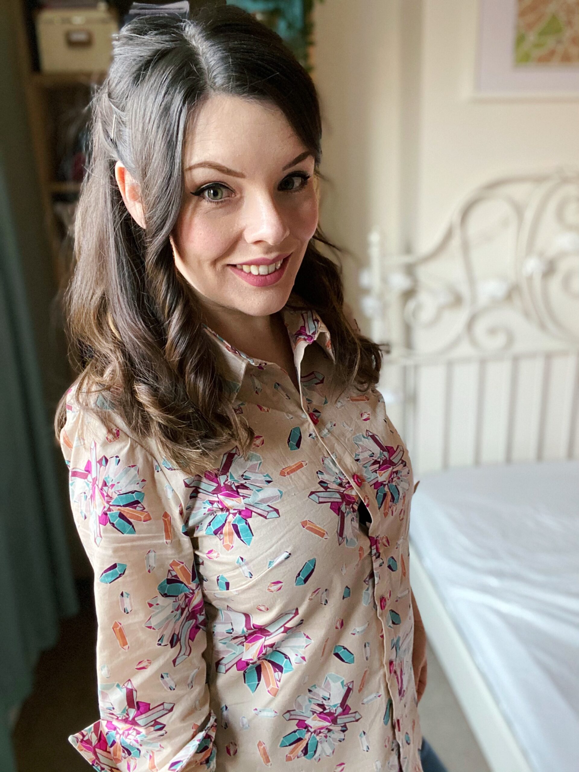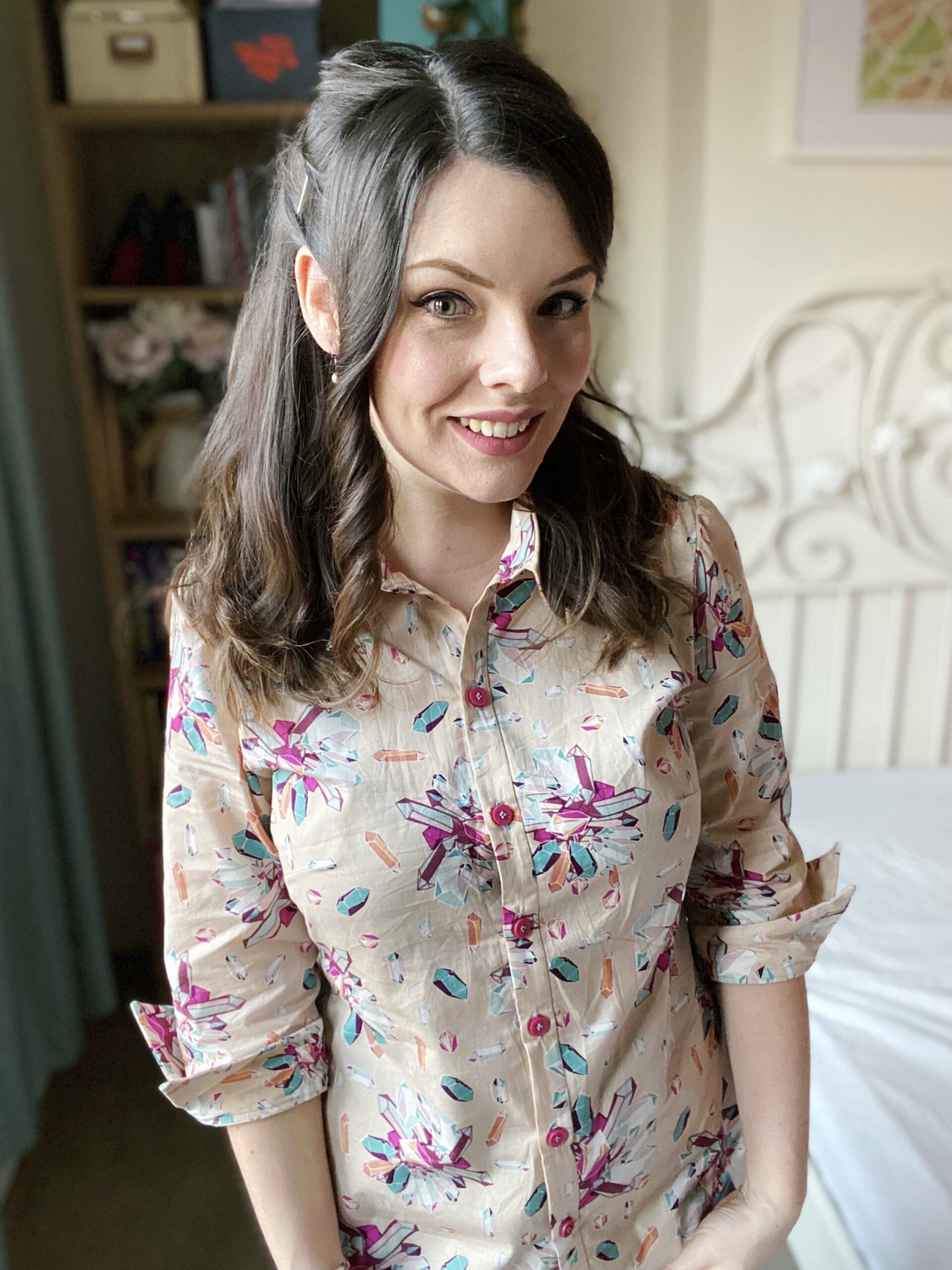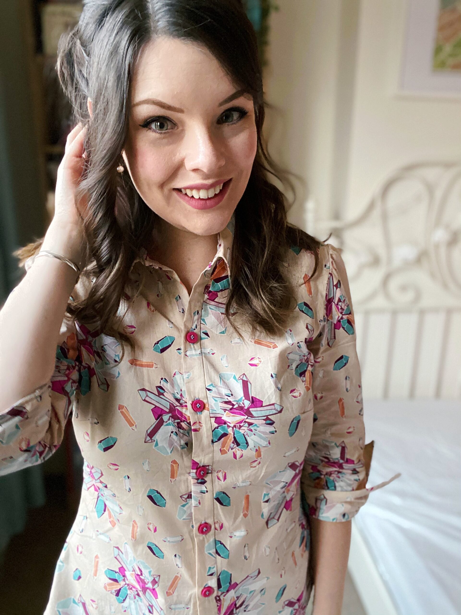 Let’s talk about fabric first, because isn’t this print just so fun? Fun fact about me: my dad is a crystallographer and we once went to a whole museum dedicated to crystals and gemstones in Freiberg when I still lived in Germany (who says we don’t know how to have a good time…?). This Art Gallery Cotton Poplin has such a bold palette of turquoise and fuchsia crystals on a taupe background, and the print is non-directional — as if the crystals have been scattered in all directions! I am a little in love with the Art Gallery poplins (my other #MinervaMake from earlier in December was a floral poplin) as they are really good-quality: soft to the touch, not too weighty, a smooth hand and super-easy to sew with. Don’t forget though that these poplins tend to be on a narrow bolt; this is only a 110cm wide, so I made sure the Granville shirt pattern was also suitable for narrow fabric options.