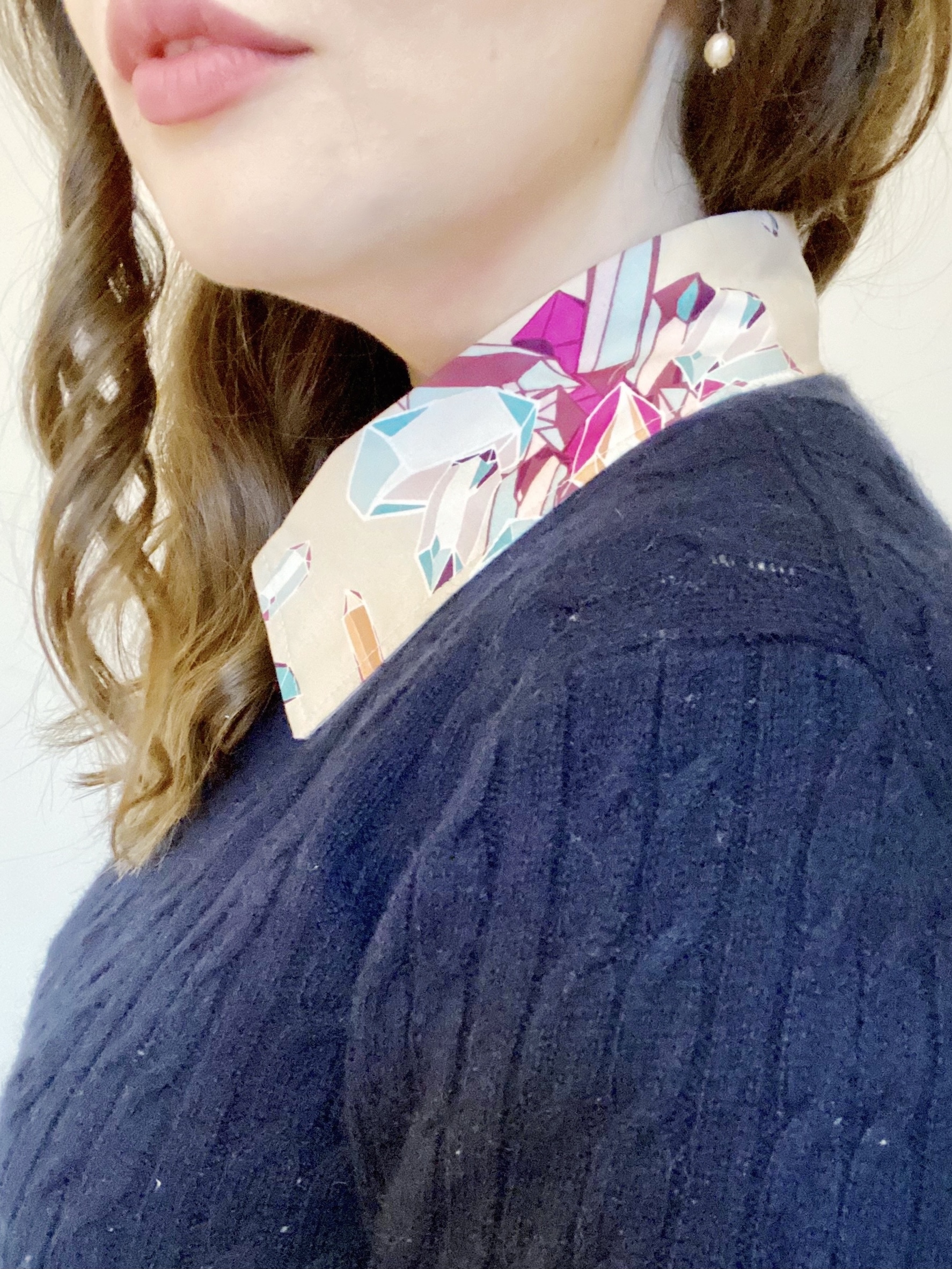 I am loving my finished shirt and I have been wearing it under my snuggly jumpers this winter — having the bright crystals on the collar peak out is a fun look!