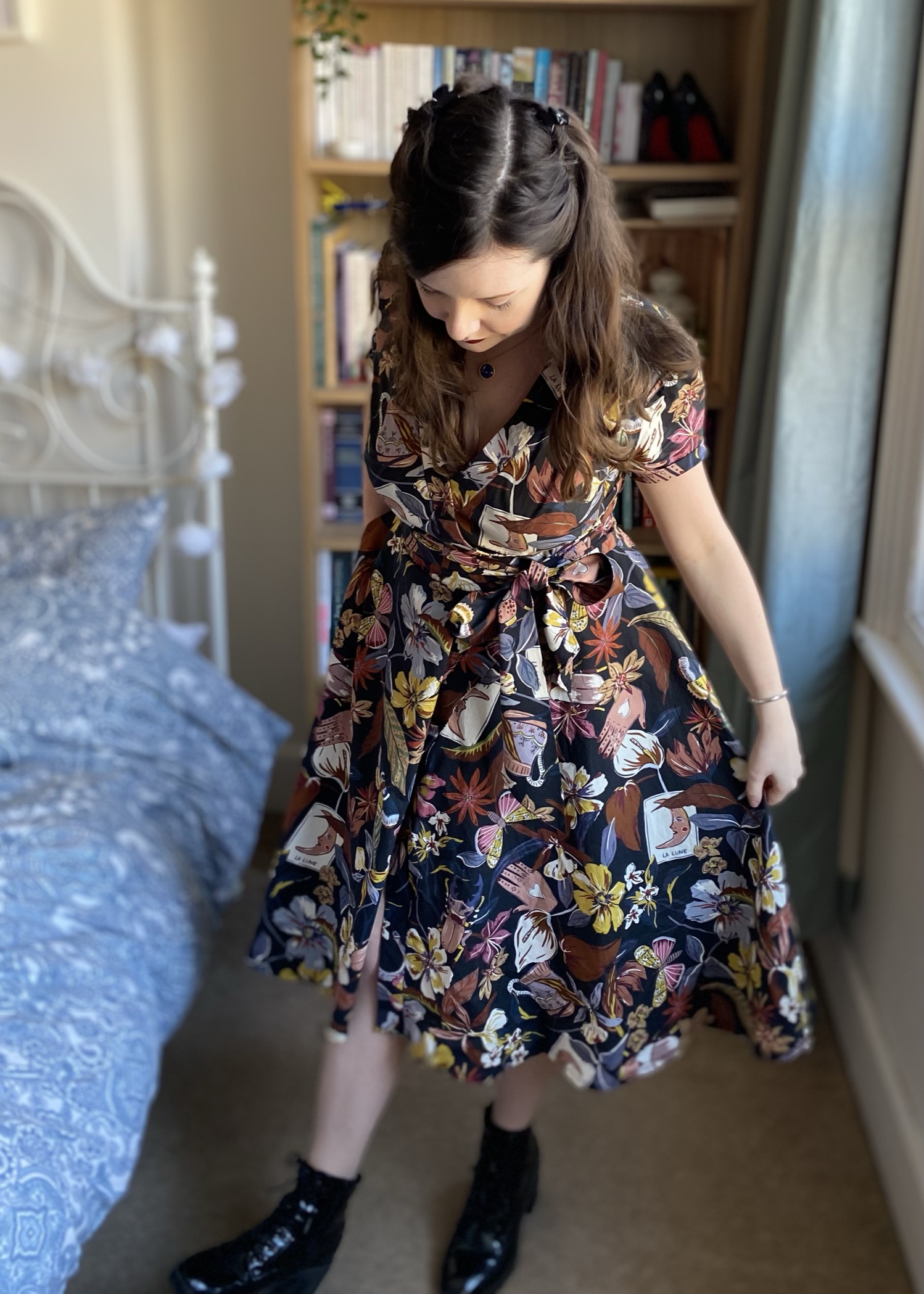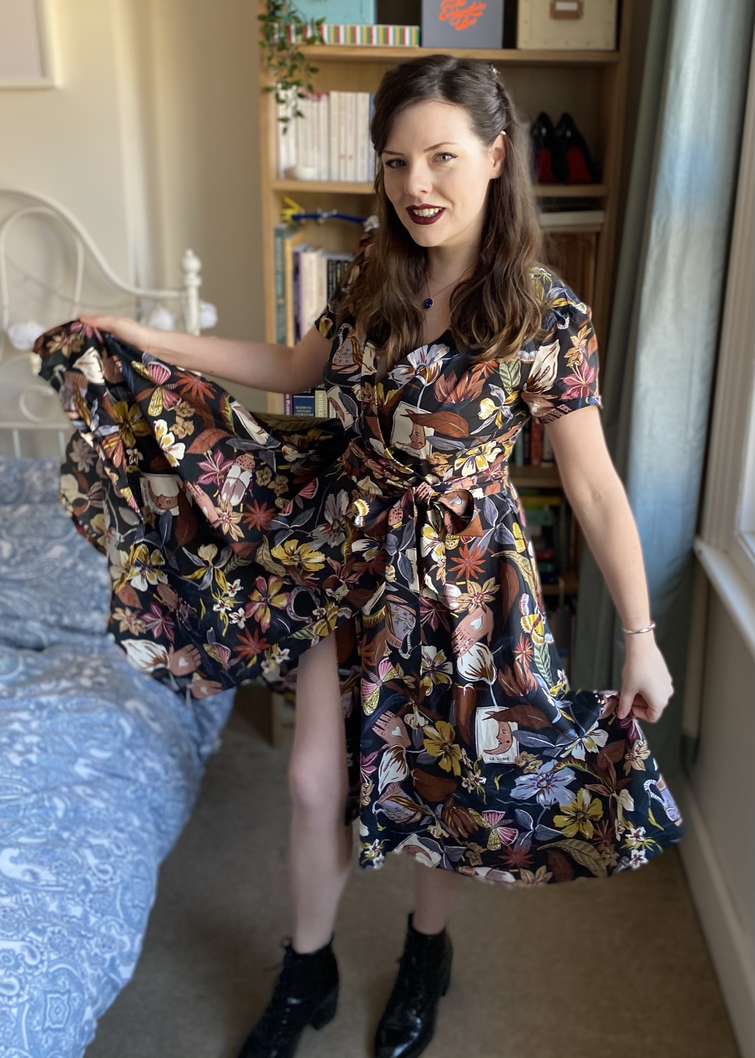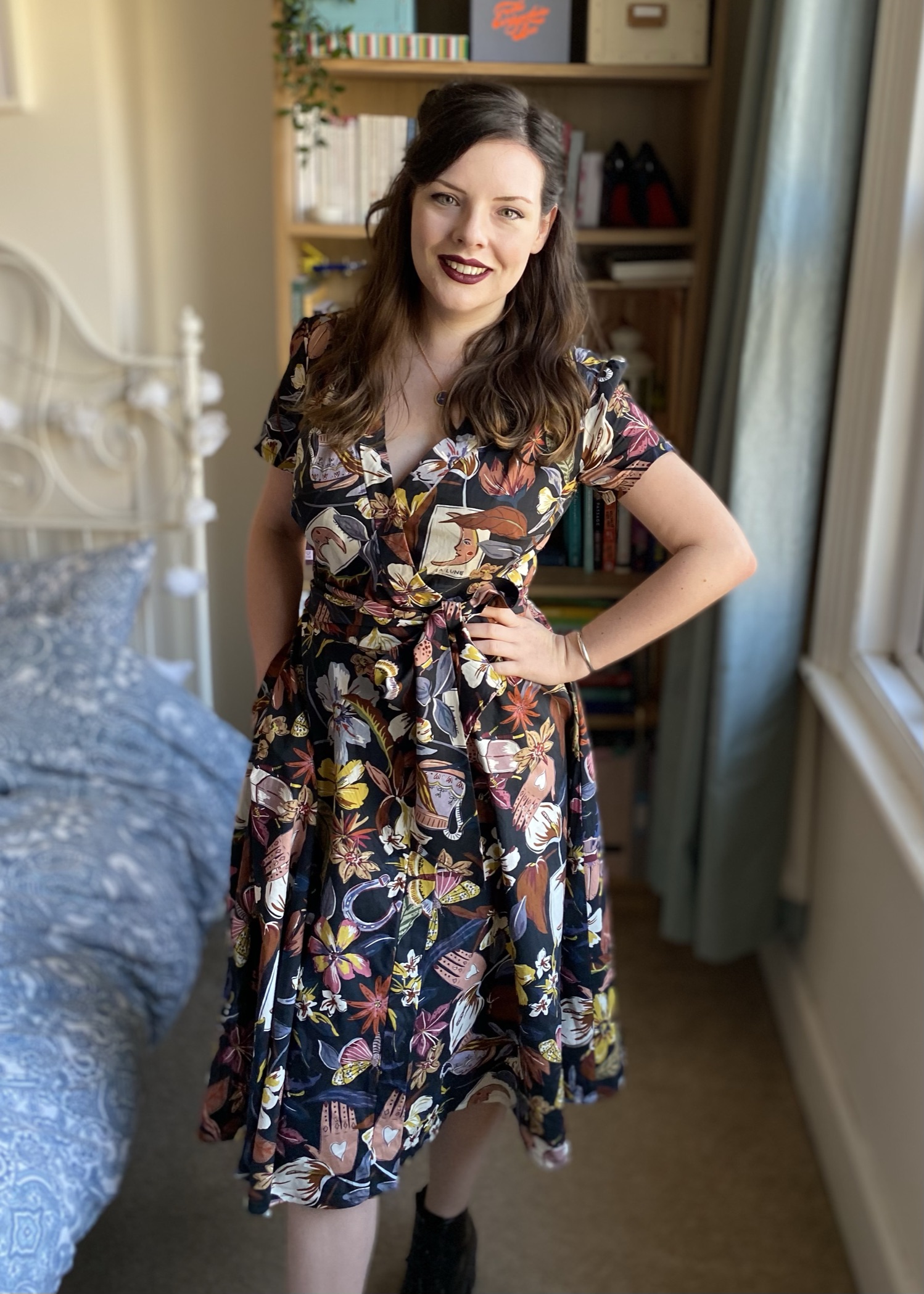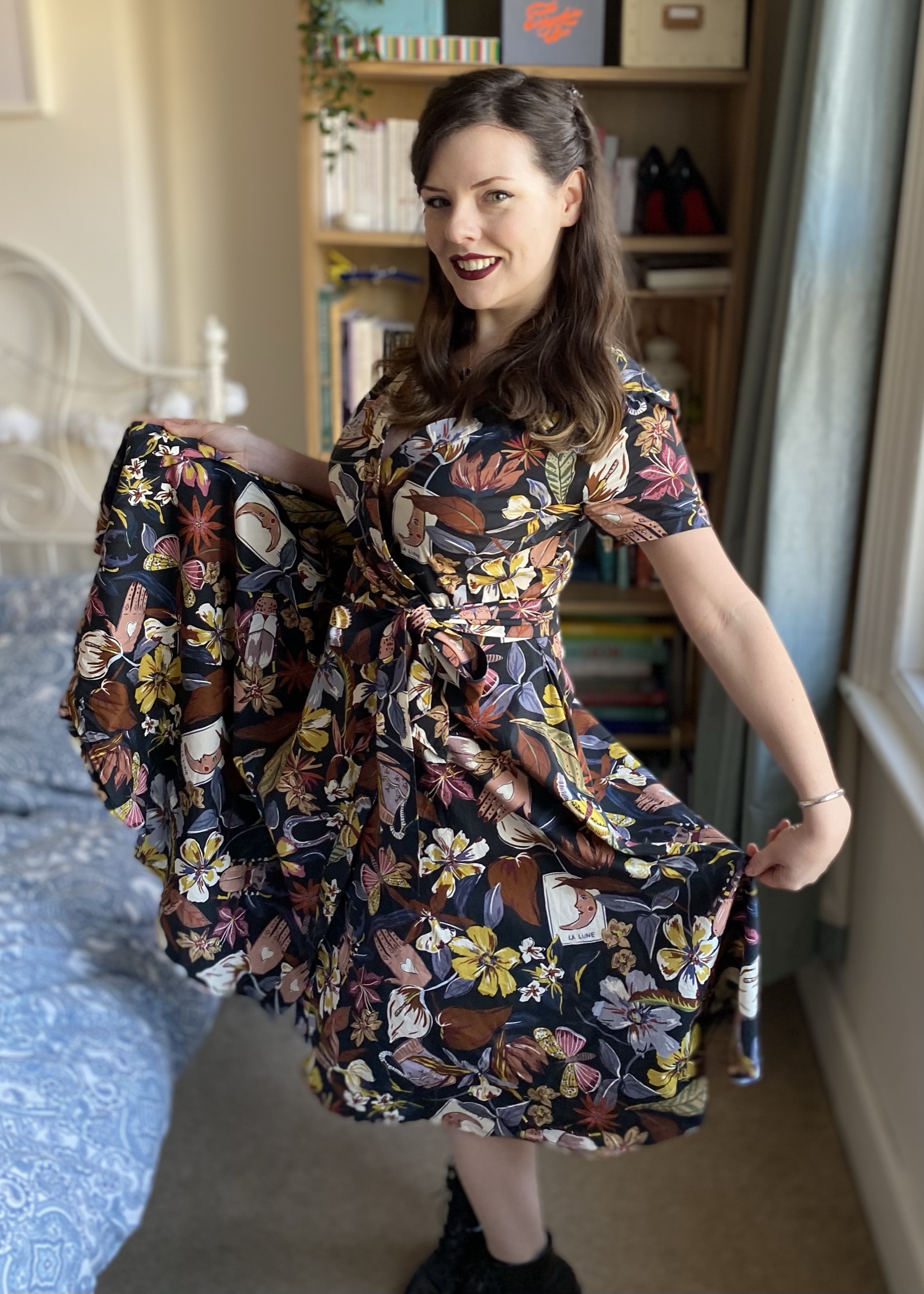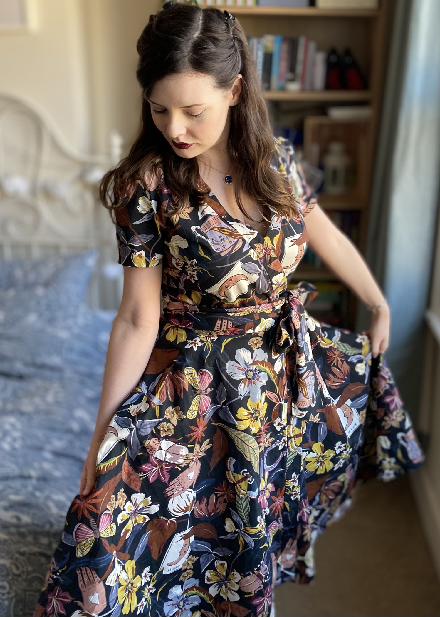 I really amped up some witchy-vibes for my sixth #MinervaMake here! This amazing Lady McElroy fabric was gifted to me from Minerva and I knew I wanted to make it into a fairly dramatic wrap dress with a full skirt; I previously made a wrap dress out of ITY stretch fabric last summer, but I had not yet tried out one made specifically for wovens, so I pulled out Vogue 9313 and set to work. Head over to Minerva to see my blog post or scroll down for more details and photos!