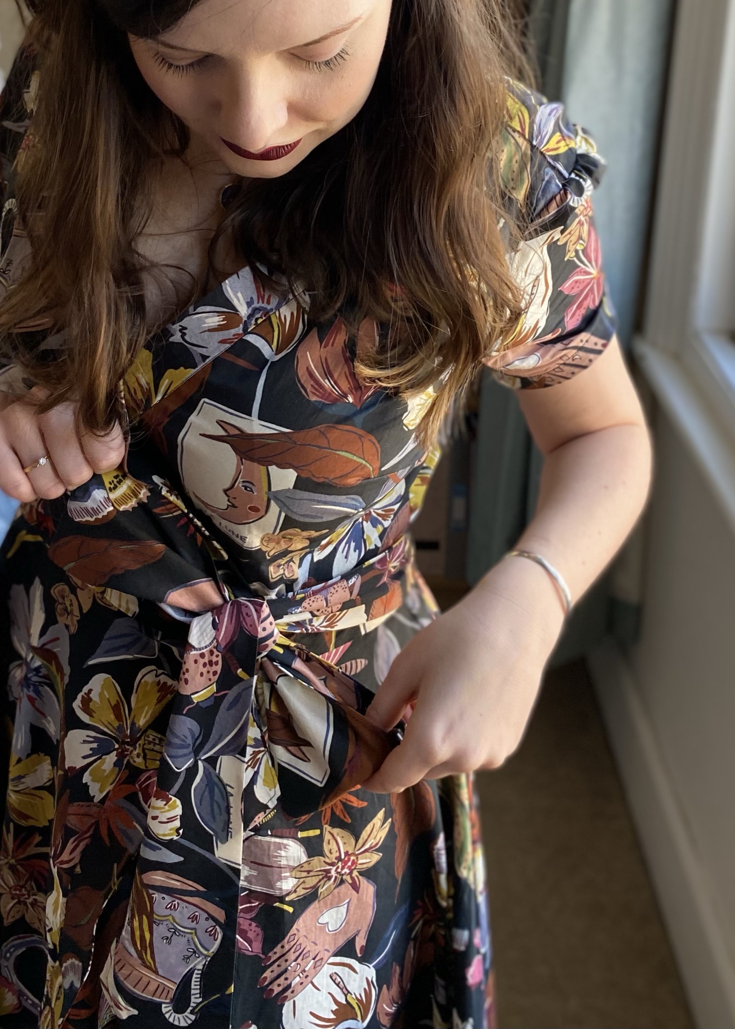 The construction was fairly easy to follow and nothing was particularly tricky. The cotton lawn was a dream to sew with and pressed nicely, which is always welcome. In terms of fit, I didn’t make any adjustments thanks to the separate cup bodice, but I would probably narrow the shoulders a little next time. I really like the faced yoke and waistband, I think that is such a small detail that elevates the garment. I was lazy and didn’t slipstitch anything, instead just topstitching or stitching-in-the-ditch wherever applicable. This isn’t a true wrap dress with tie which can be fed through the waistband; this dress is instead secured with hooks and bars, which I may modify to rouleau loops and buttons if I make this again. I also had to make do with the interfacing I had at hand (grrr, lockdown) which was a little too heavyweight, so the neckband is quite stiff and stands away from my body. Hopefully, this will soften out in the wash!