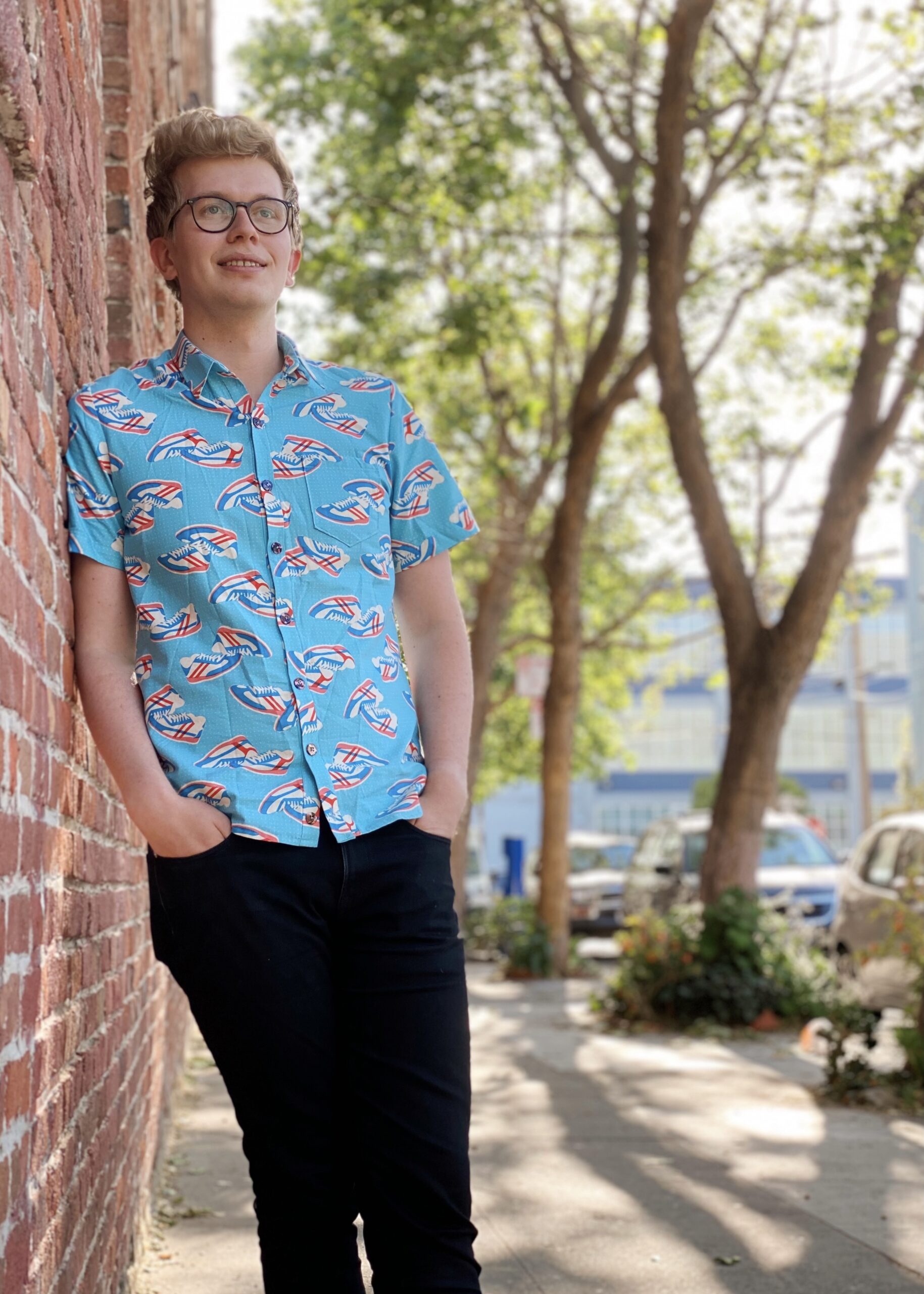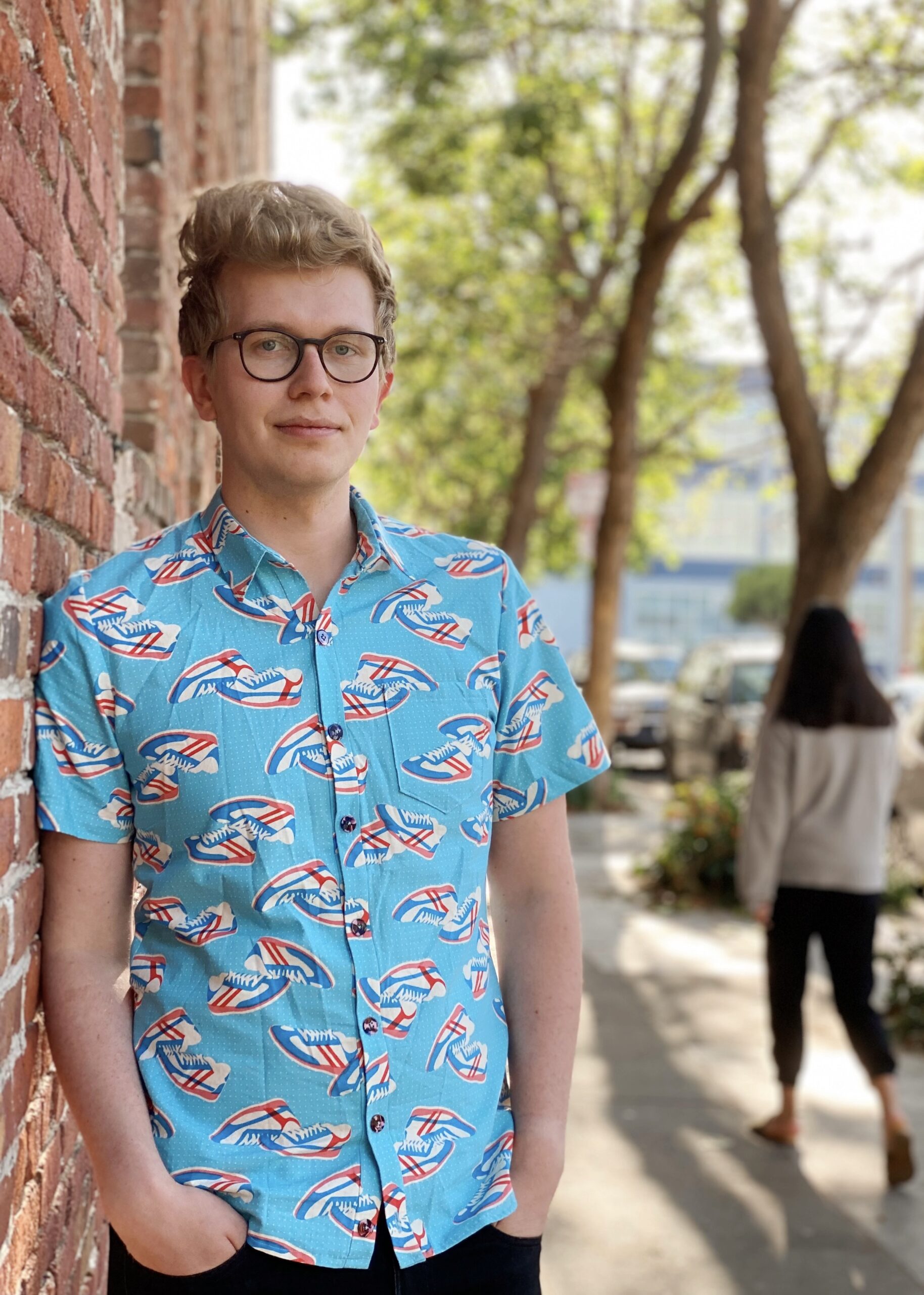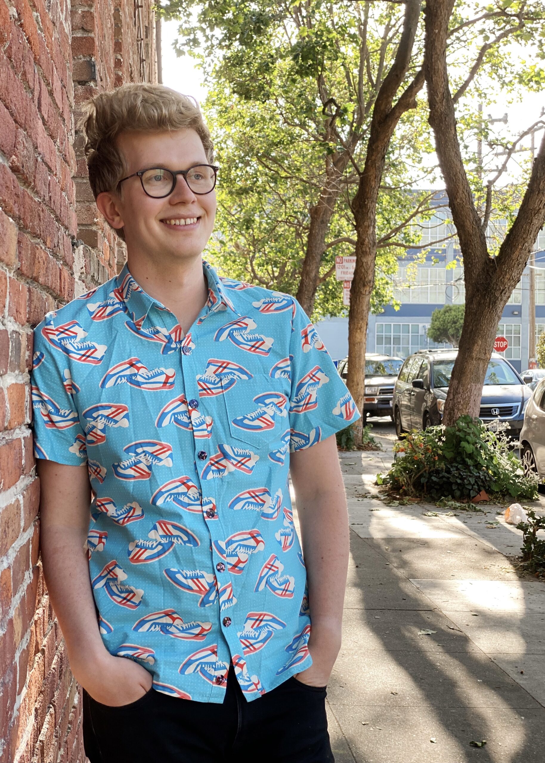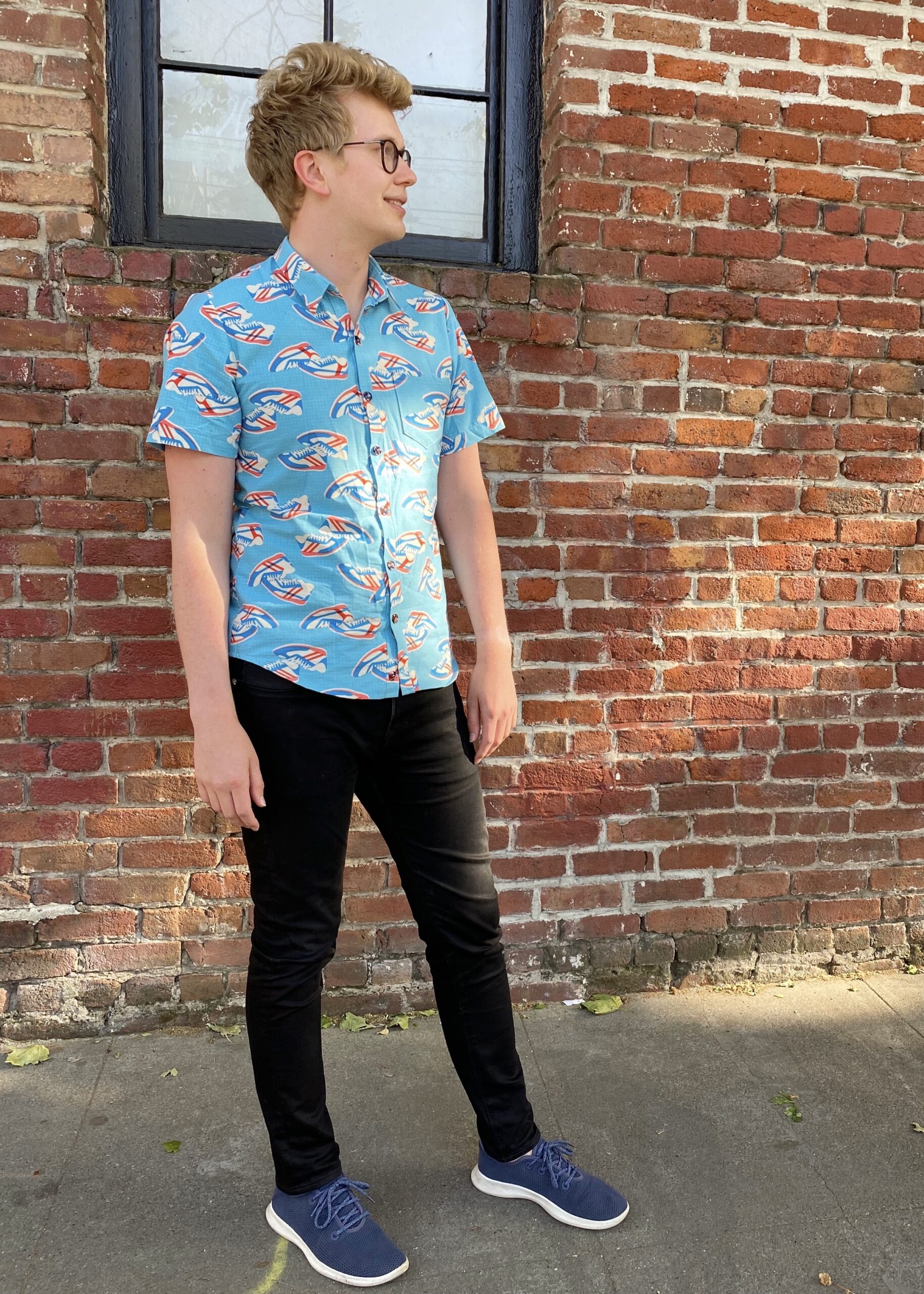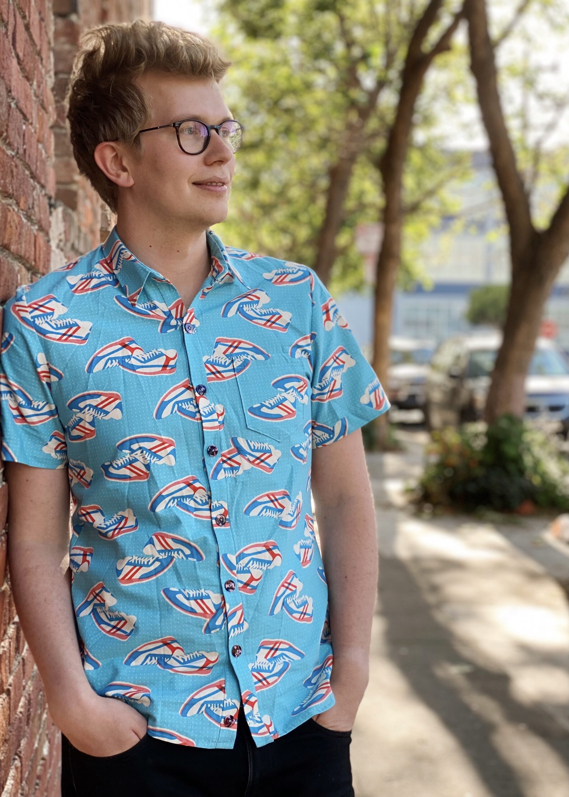 As this was my first time making a menswear shirt, I opted for a stable cotton and picked out this super-cute design called Kicks by Melody Miller from Cotton + Steel. The shade of sky blue is so lovely and I think the sneaker print is very fitting for Simon’s San Franciscan cool vibes 😊 I also really love how straight-up cheerful this print is! It has a vertical repeat and is on a narrow 115cm bolt, so it took a little pattern juggling to get the sneakers running horizontally. Like all Cotton + Steel substrates, the quality of this quilting cotton is fab; the fabric was so easy to cut and sew, which was just what I needed after recently working with some super-shifty silk. I also picked up my favourite Pigeon Wishes resin buttons in Botanical from Hey Sew Sister, which are such a perfect finishing touch — the swirls of the different colours provide a strong contrast against the sky blue.
