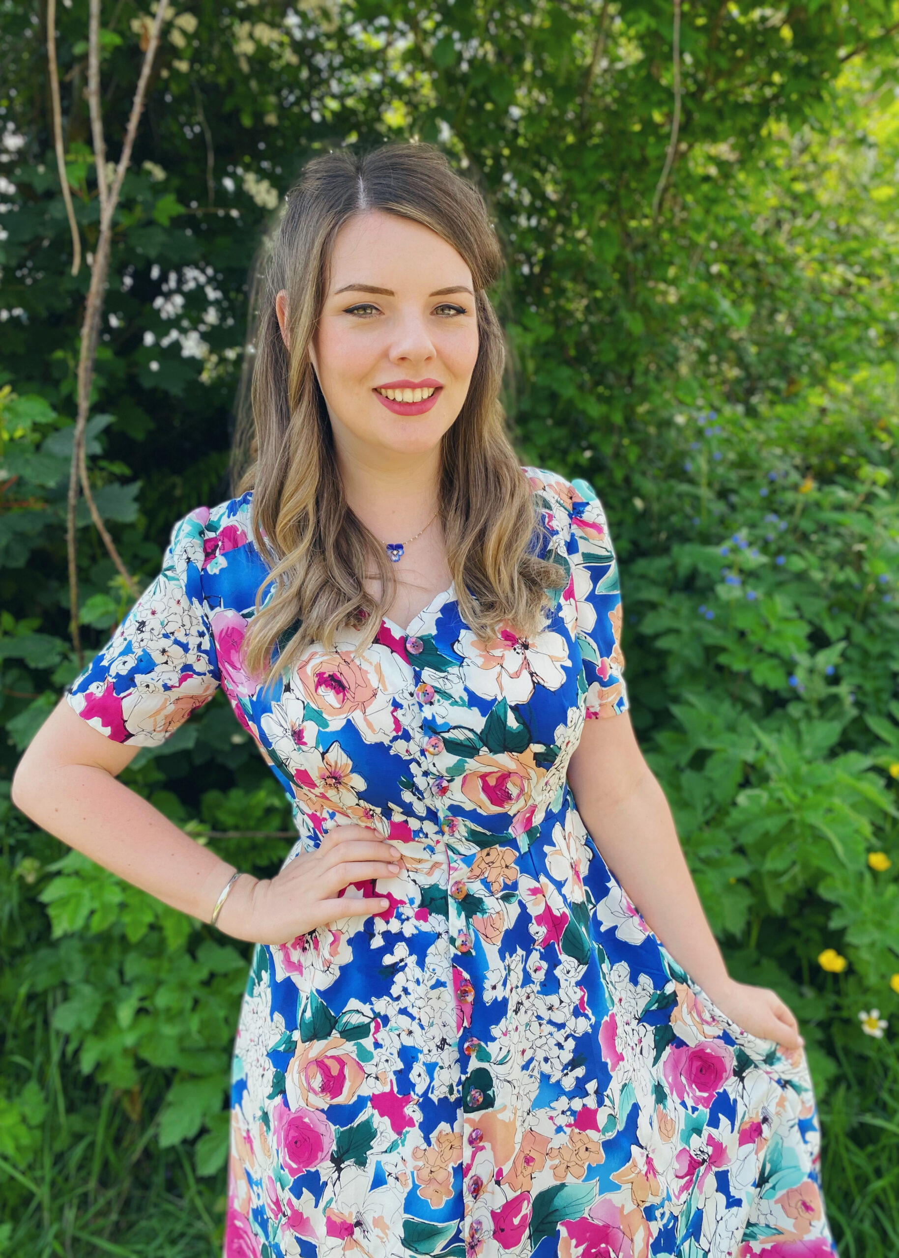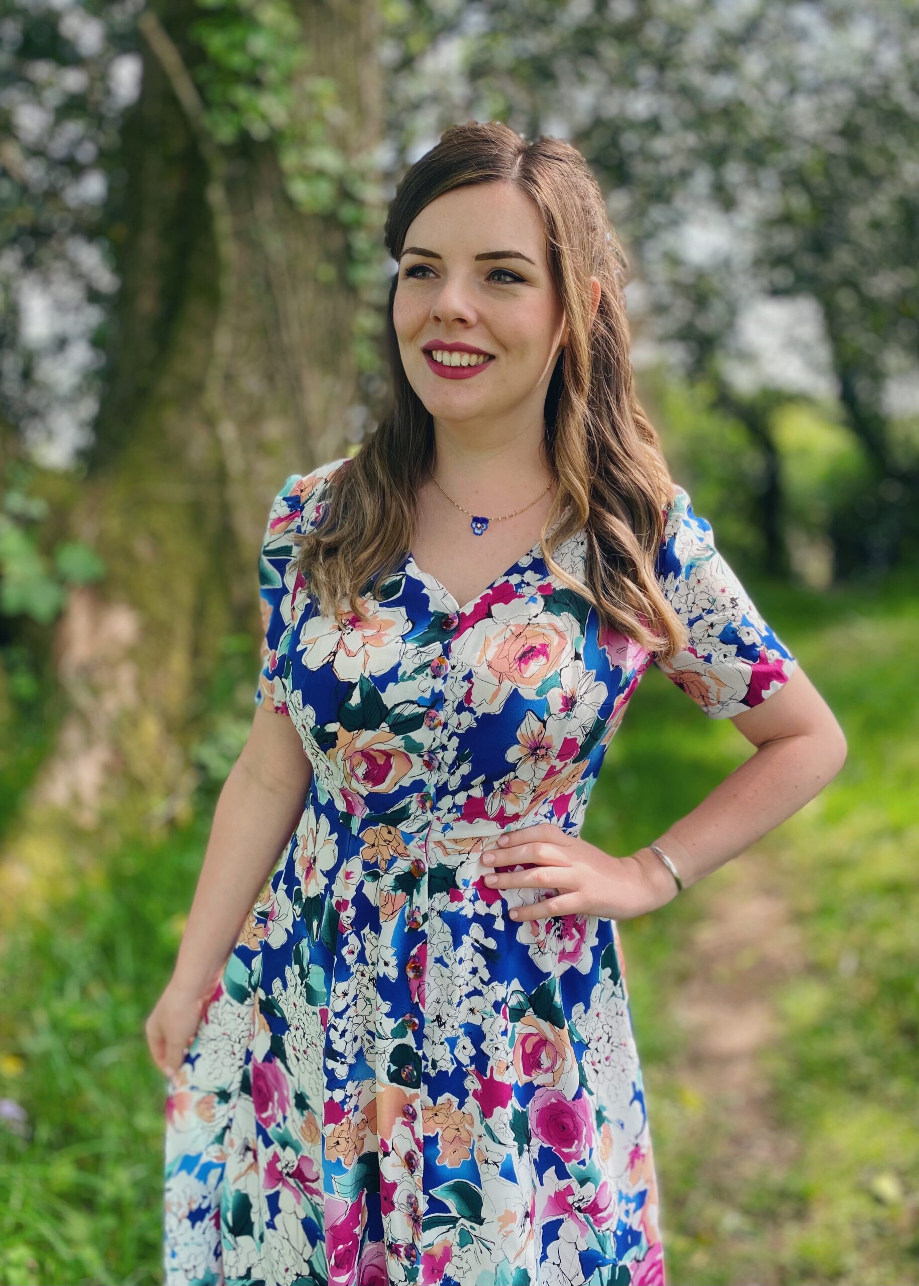 I had a tea dress pattern in mind, which I thought would suit this soft, feminine silk — the Nina Lee Kew Dress (a Christmas gift from my Granny!). I went for Version 1, which looks quite 40s; it has short sleeves, a v-neck bodice and a high-low dipped hem, which is so delightfully twirly! This dress has a button-front closure with fifteen buttons. As the fabric is 140cm wide, I only needed 2 metres to make Version 1 and ended up with only a handful of scraps left. I really like a vintage silhouette and this one is fantastic — I am definitely planning another.