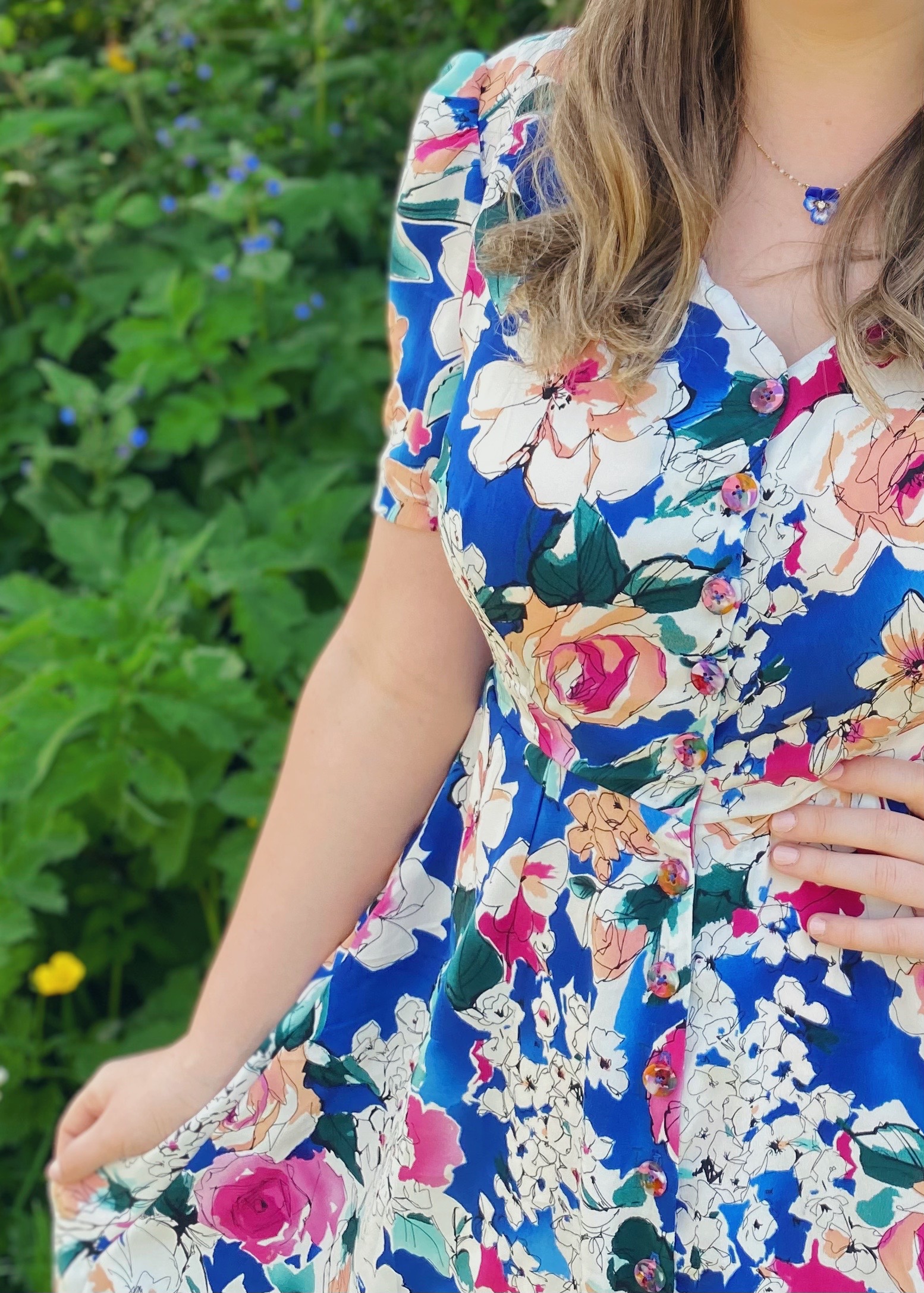 As I said earlier, I really took my time with this make and went slowly. I used a 60 Microtex needle and extra-sharp silk pins throughout, along with my trusty walking foot. As silk is fragile and frays quickly, I finished all the seams as French seams and then slip-stitched the hem of the skirt and sleeves by hand. The Kew dress is finished with a row of buttons and I have never been so tense making buttonholes in my life! Doing fifteen buttonholes in silk was quite overwhelming — each was as nerve-wracking as the last! That being said, these Pigeon Wishes ‘Bloom’ resin buttons I got from Hey Sew Sister are just the cherry on the top; they perfectly pick out all the shades of pink, peach and green shades in the fabric.