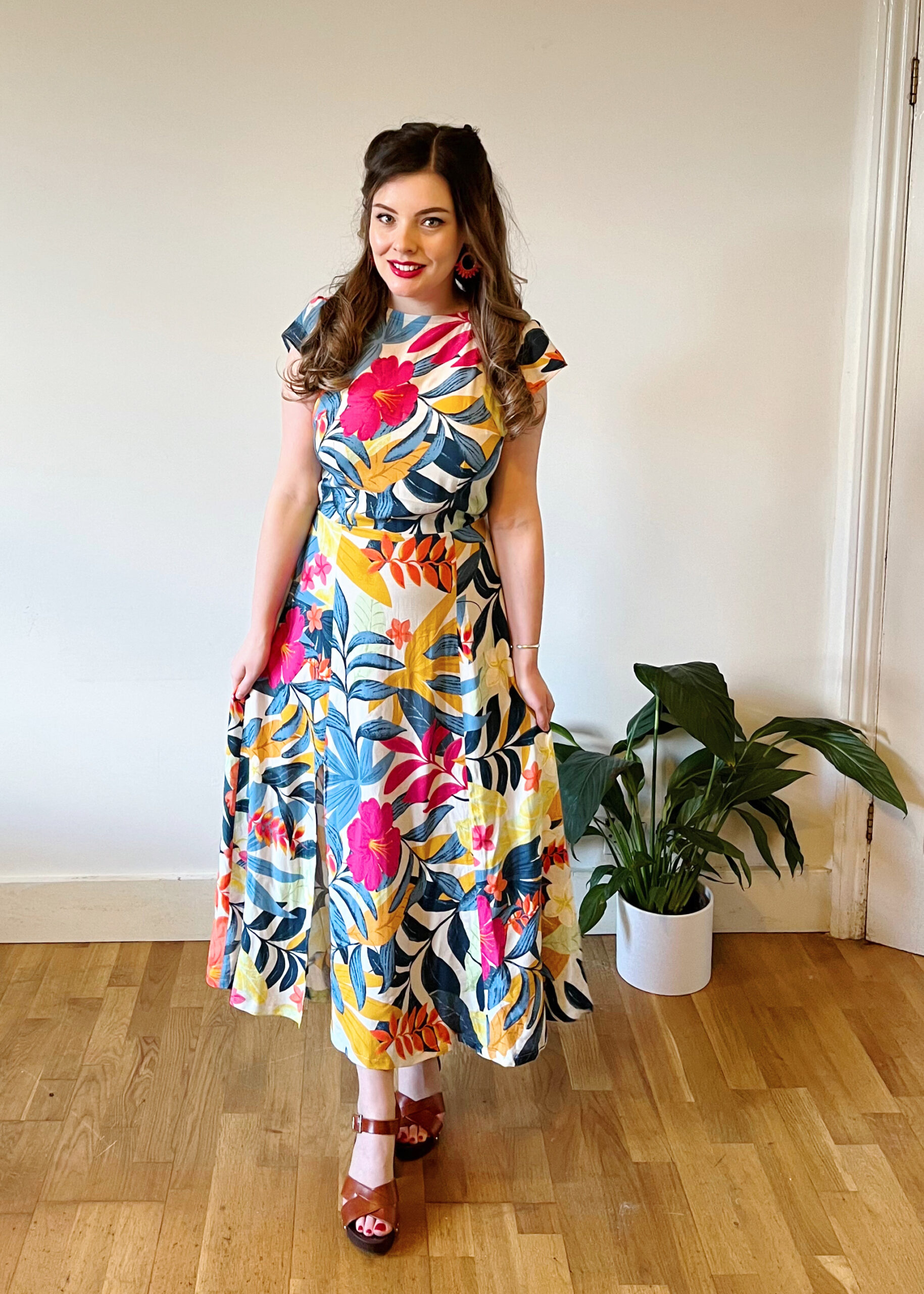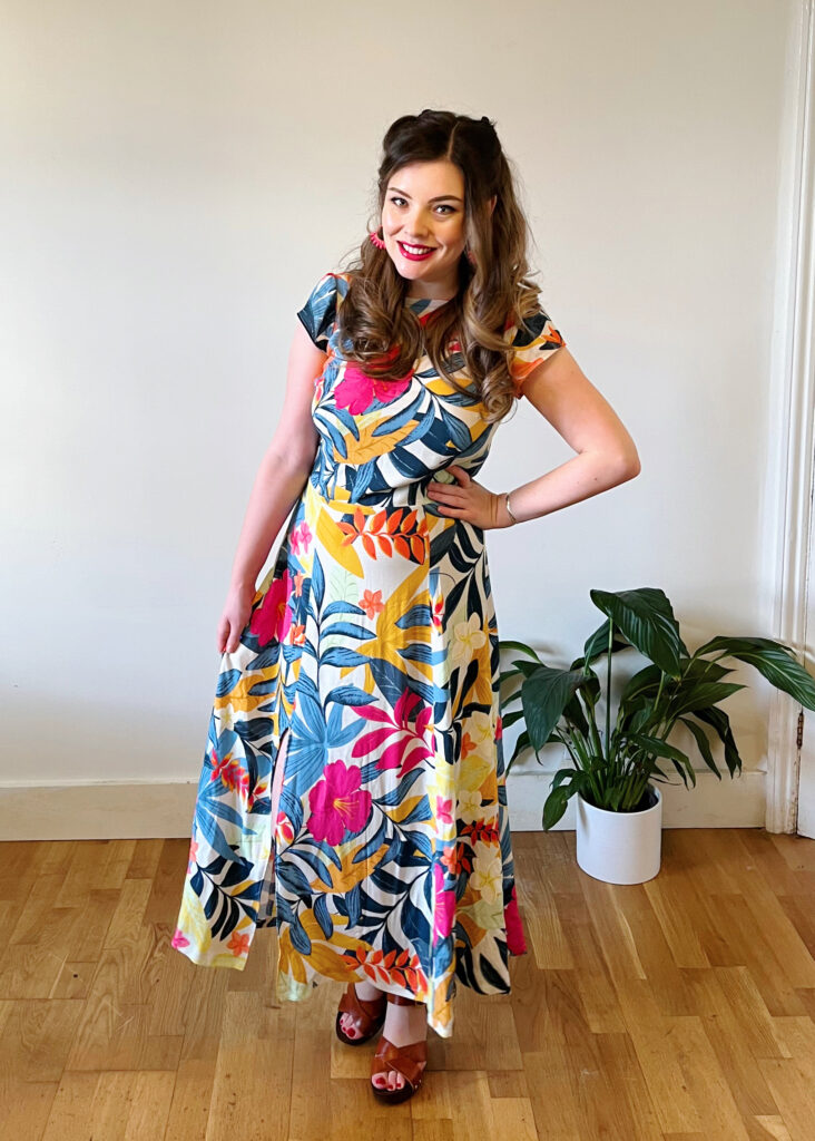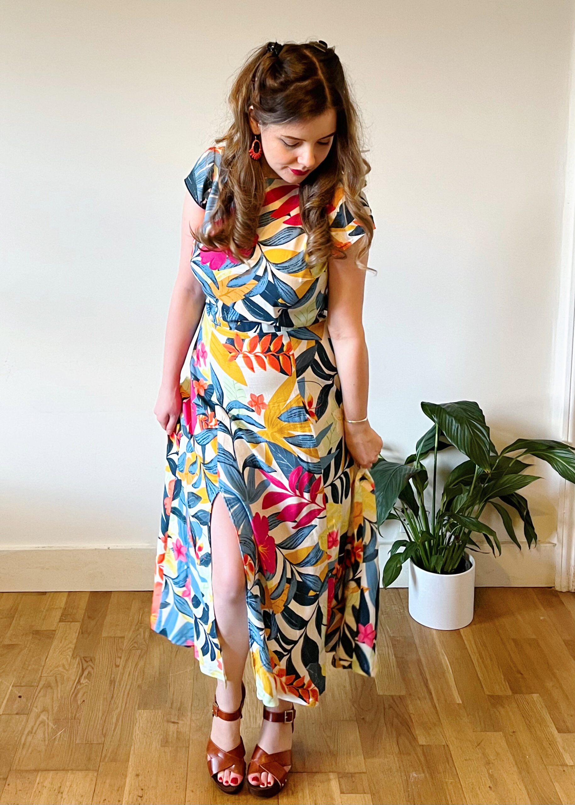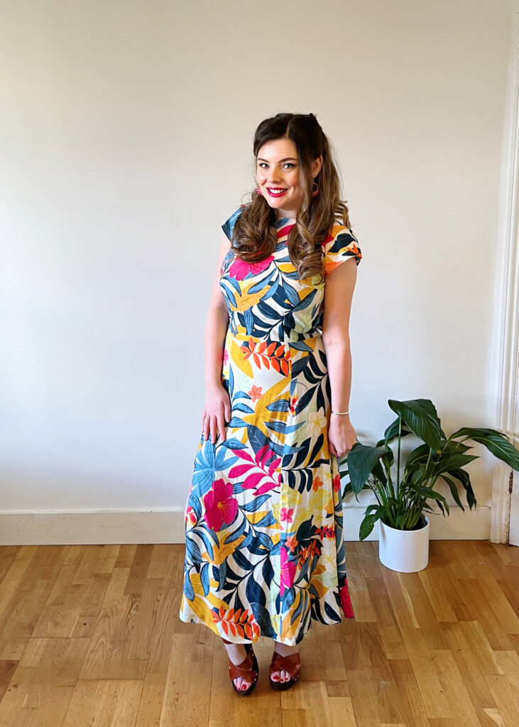 I am so excited to take this tropical maxi dress with me to California! This style of dress always reminds me of the gorgeous Reformation dresses, so I am thrilled I have now got a pattern in my stash that helps me replicate these designs — I am thinking this could be gorgeous in a royal blue crêpe de chine.