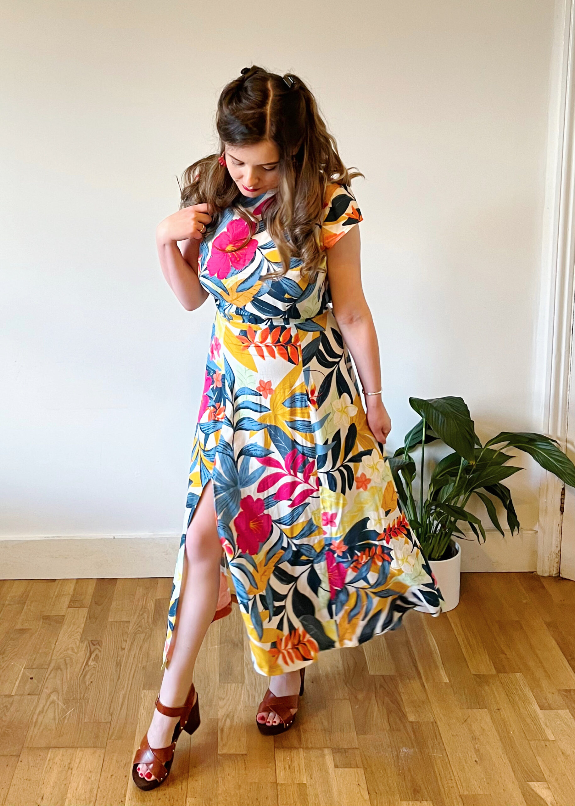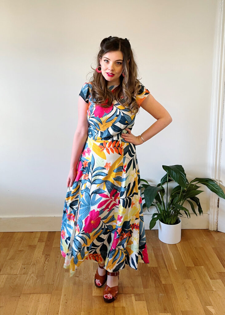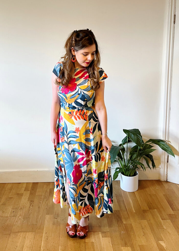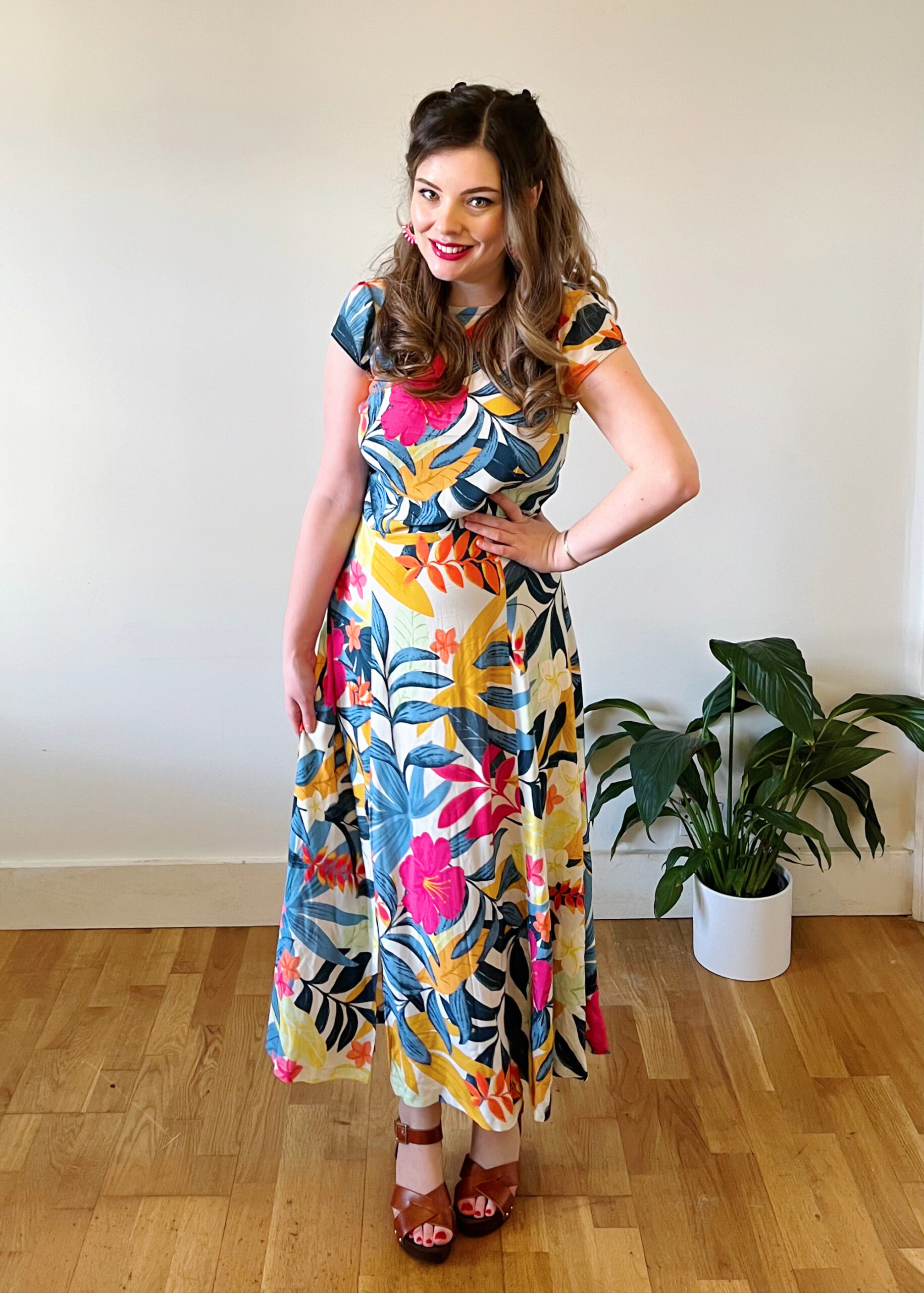 I am so excited to take this tropical maxi dress with me to California! This style of dress always reminds me of the gorgeous Reformation dresses, so I am thrilled I have now got a pattern in my stash that helps me replicate these designs — I am thinking this could be gorgeous in a royal blue crêpe de chine.