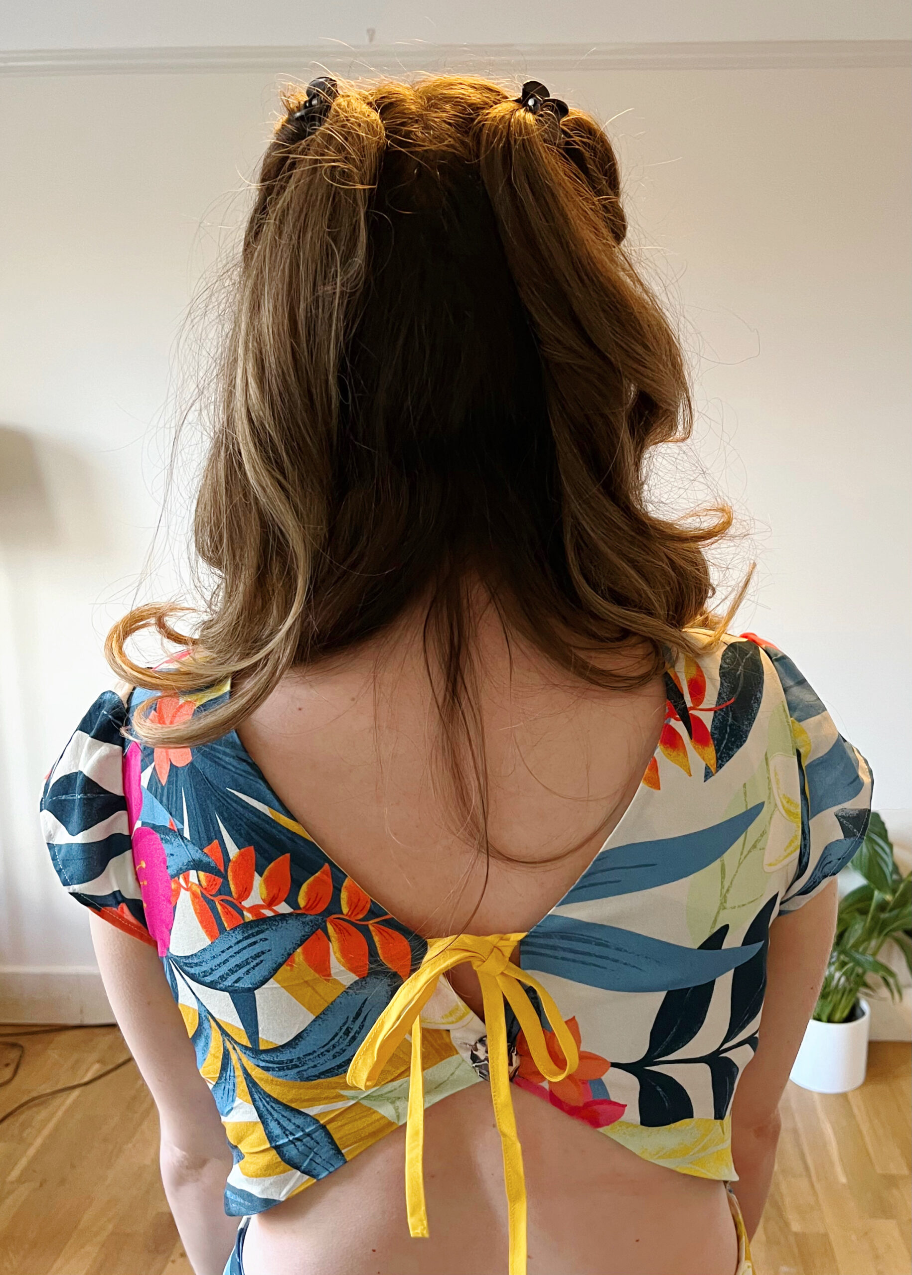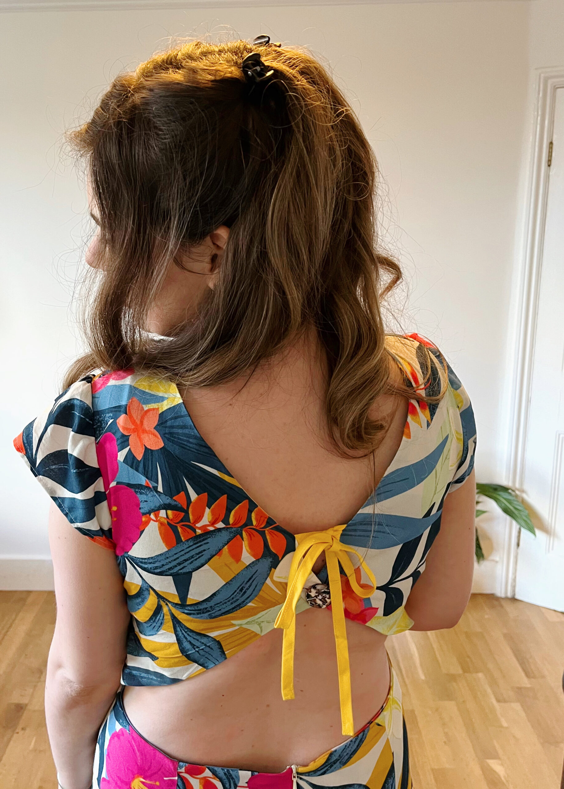 Lately I have been really gravitating towards big, bold botanical prints and this one is gorgeous — it is perfect for spring/summer and makes me daydream about Hawaii! I love the contrast between the splashy pink hibiscus flowers and golden leaves against the muted blue foliage and the cream frangipani flowers. The print is against an ivory background, which luckily isn’t sheer as this dress is unlined. I found this viscose challis to be exceptionally smooth and floaty, so I made sure to use my walking foot when sewing to avoid it slipping around too much! I used a tailor’s clapper when hemming and found that it helped this fabric to stay a lot flatter, so that is something I will definitely remember to continue to use when sewing with viscose. I ended up not using the fabric to make the tie loop at the back of the dress as it was prone to fraying and was quite fiddly, so opted to use a piece of yellow ribbon instead.