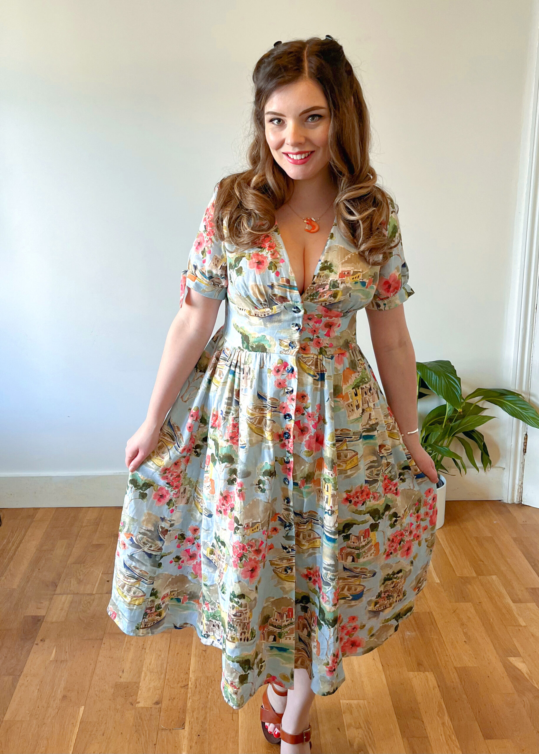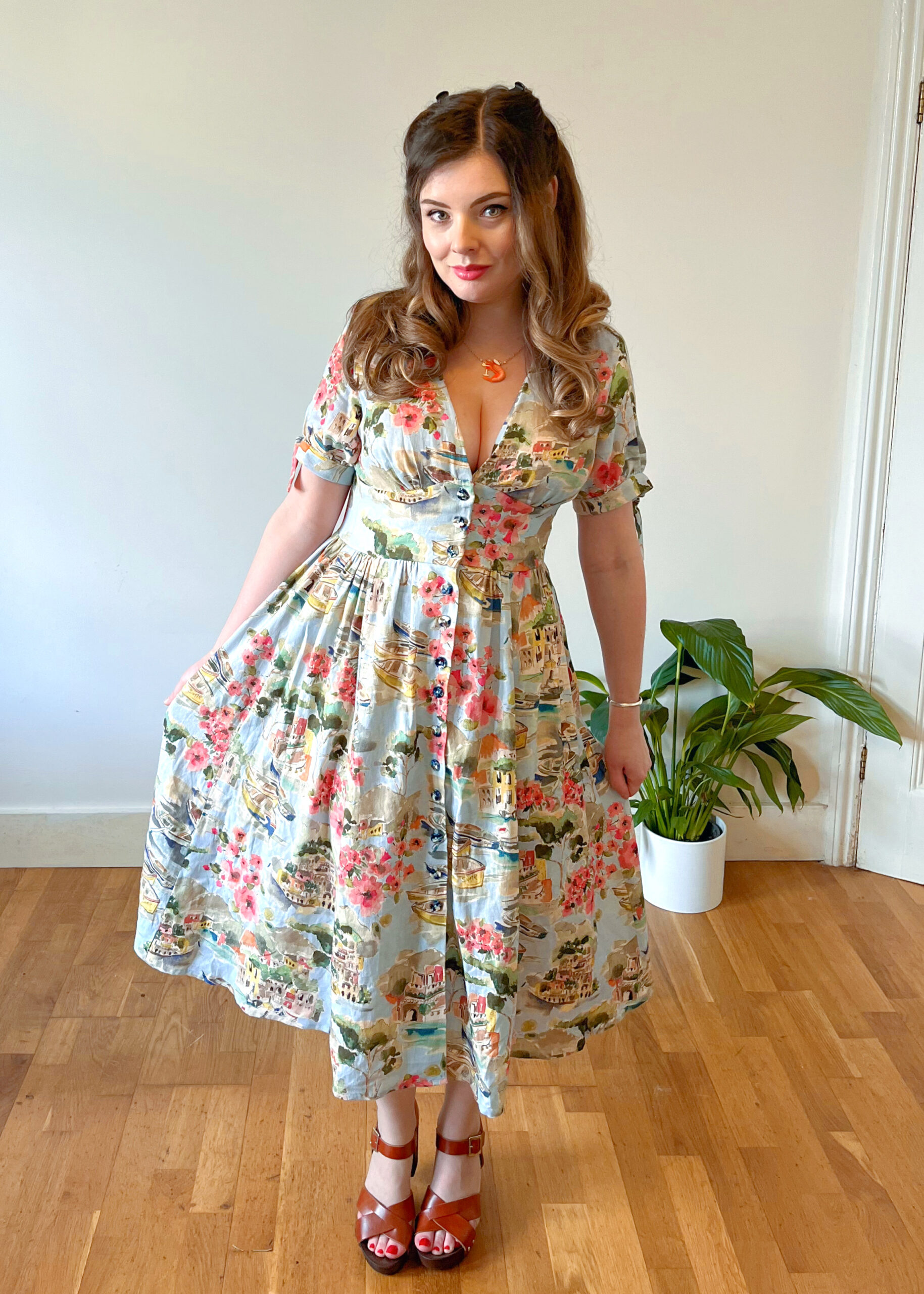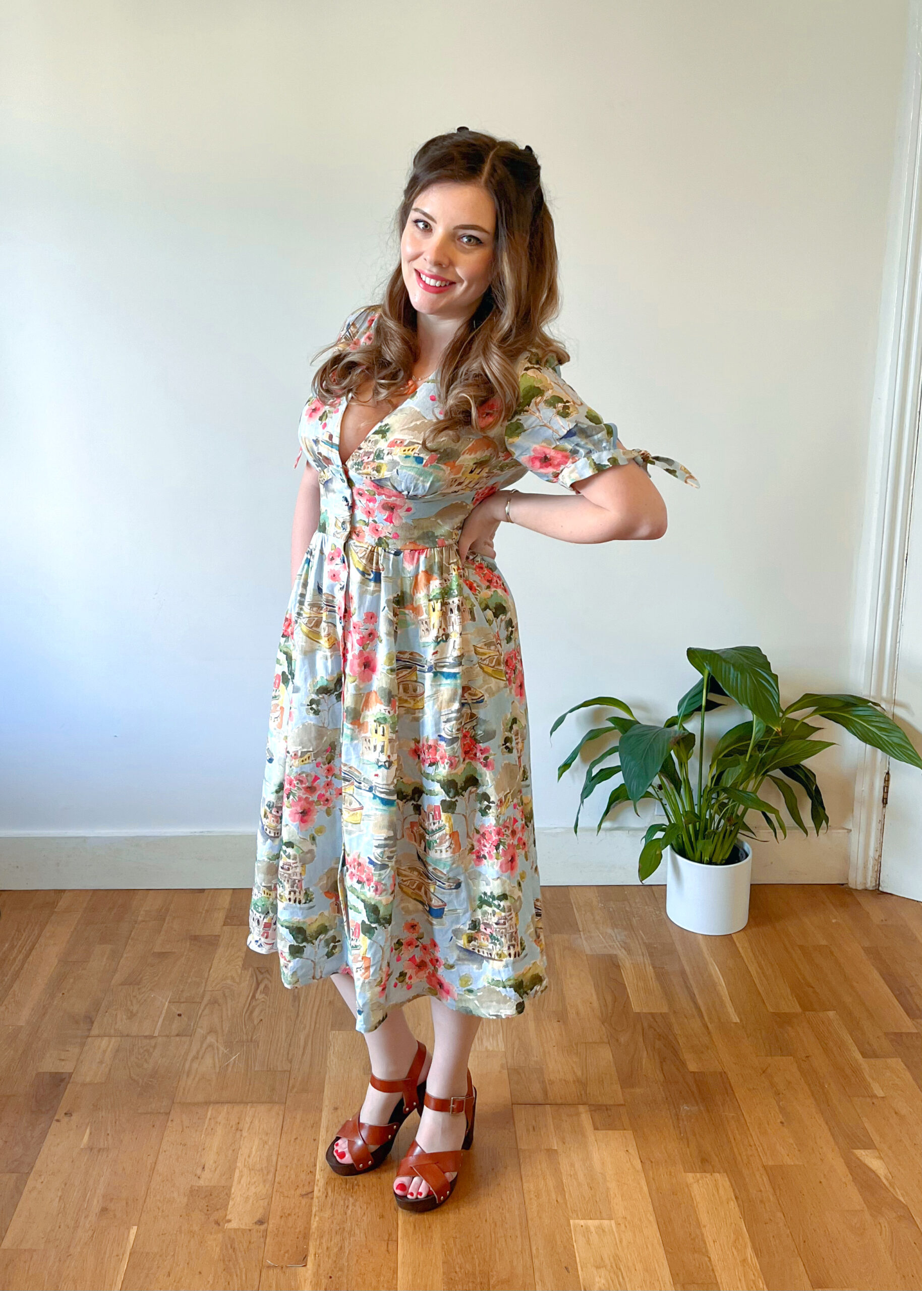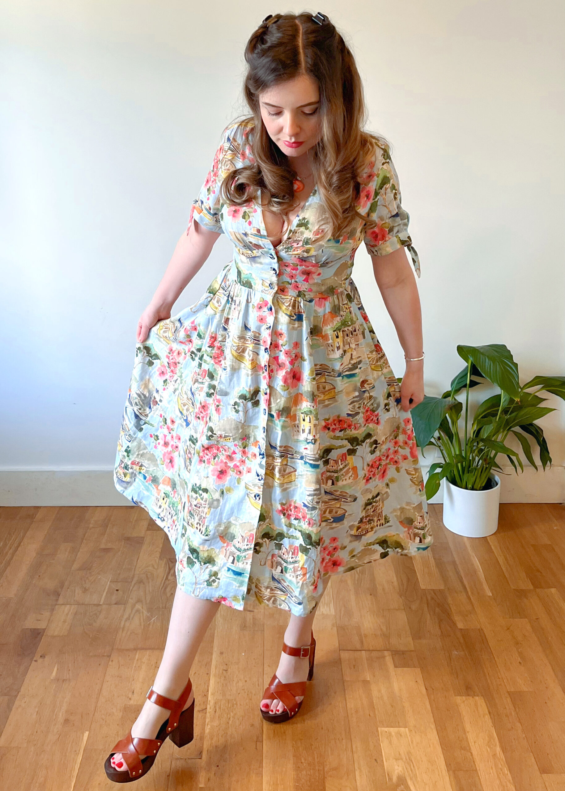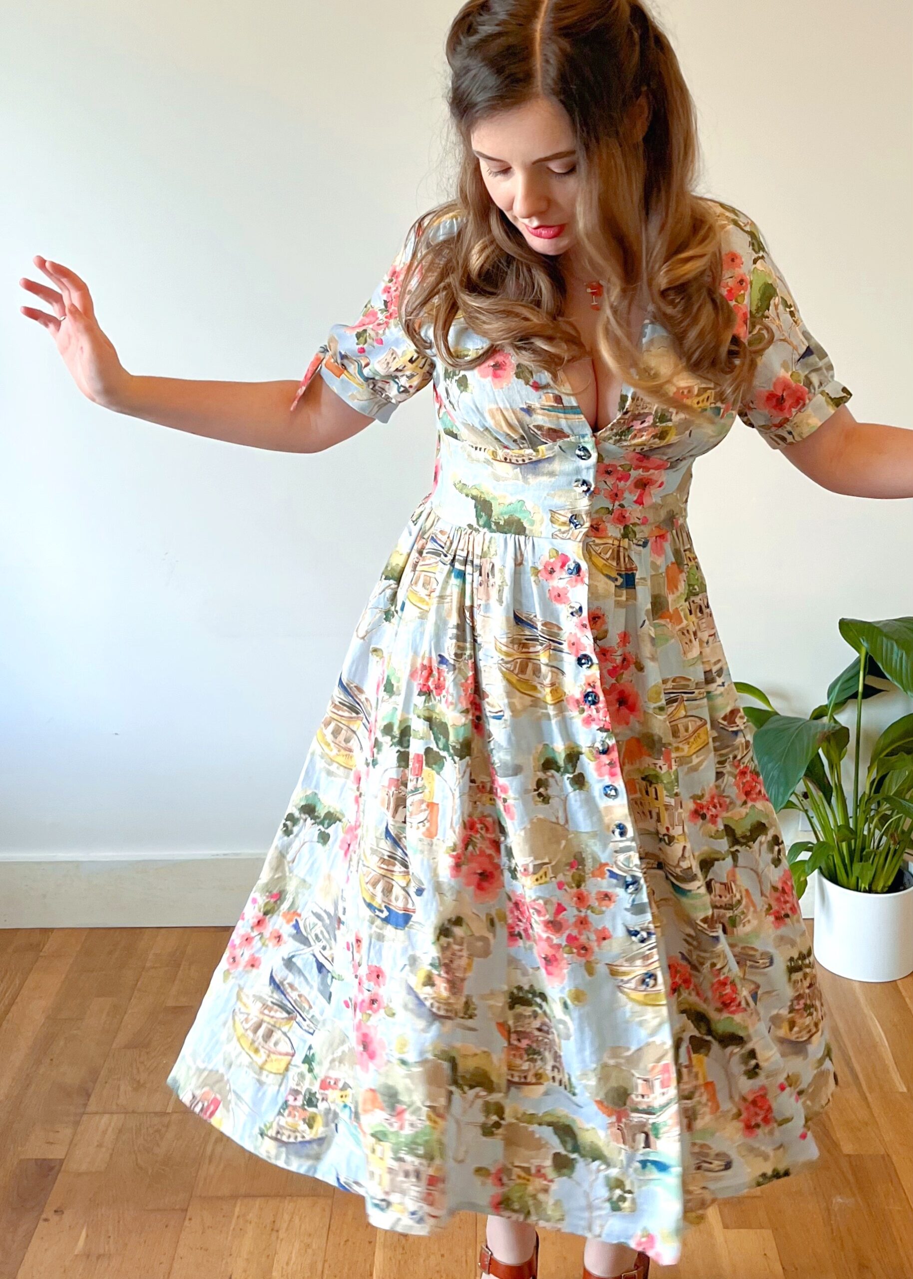 The fabric has a visible textured slub weave and the print is called ‘Life In Venice’, which has sketches of pastel Venetian houses and boats on a pale blue background, with big pink blossoms — it is so dreamy!
