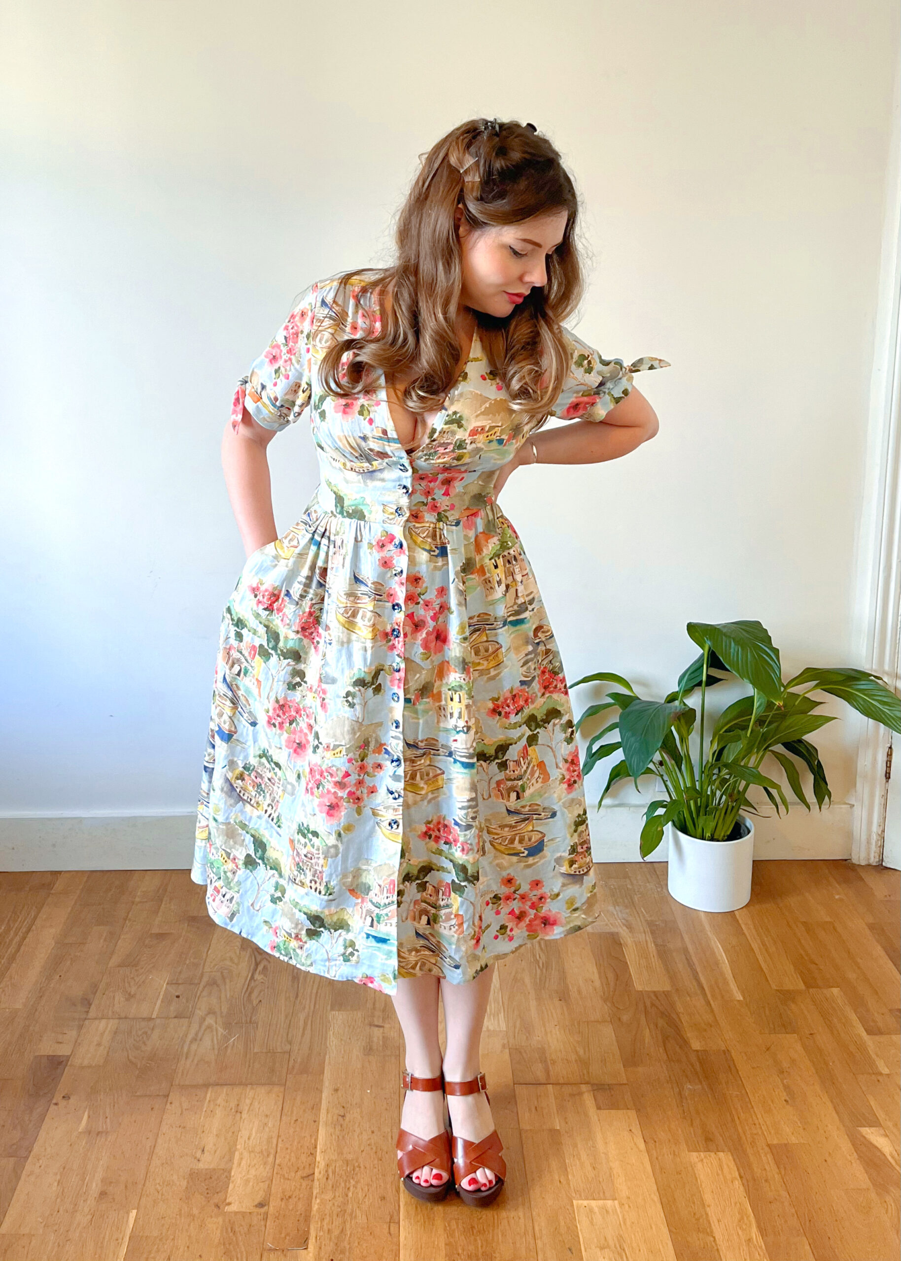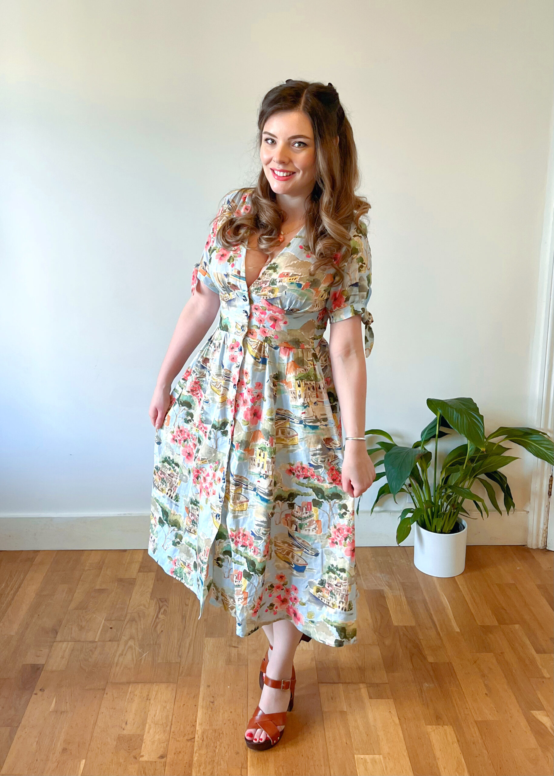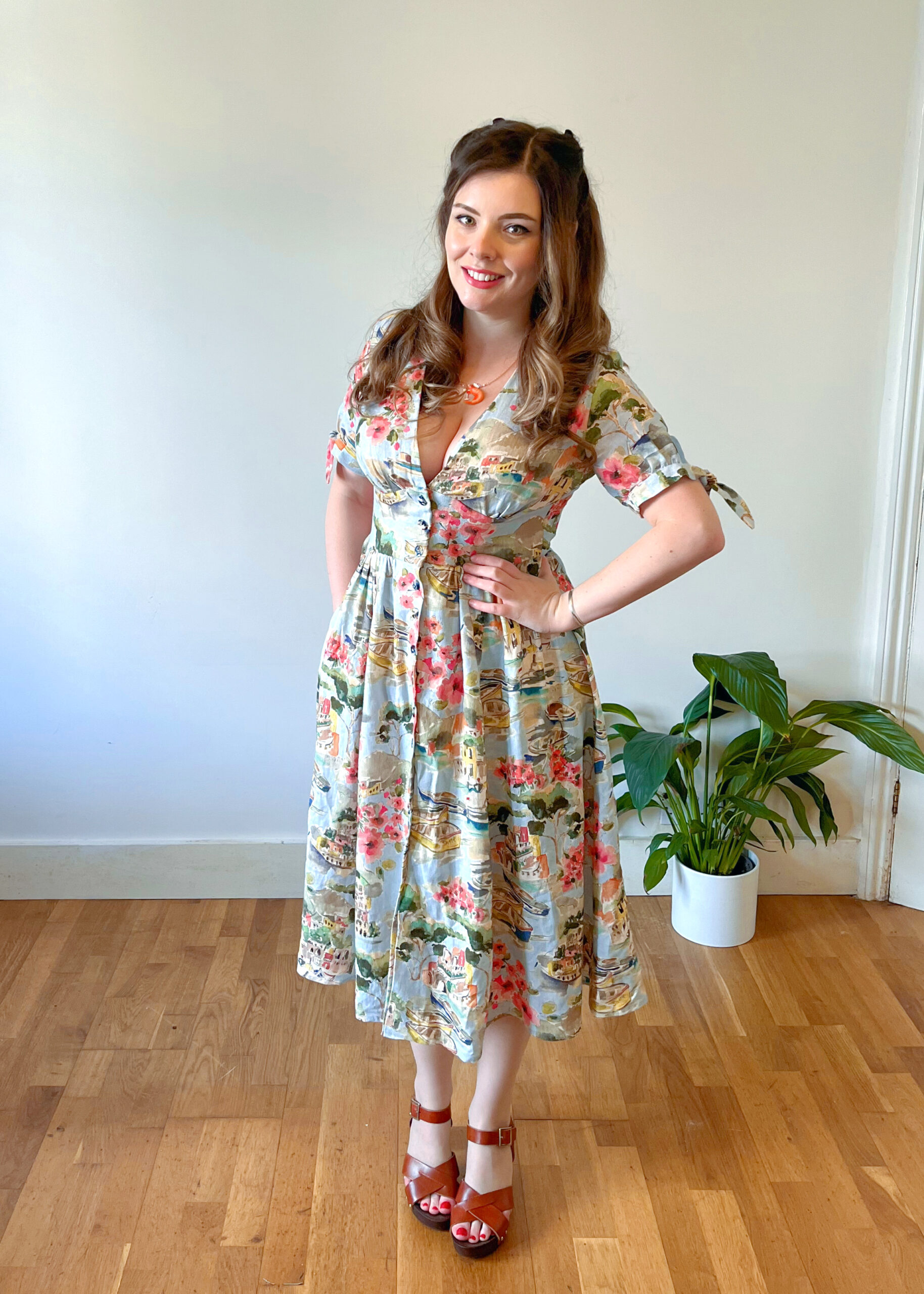 McCalls 7974 is a quintessential summer dress, with a fitted bodice with a v-neck and button-front closure, pockets, a lightly gathered panelled skirt, and different sleeve and length variations. Also, we should talk about the elephant in the room — it is quite a deep v-neck and I am très busty…! To counteract the daring low neckline, I opted for the midi length of View C to balance out my proportions (last time I made the knee-length version but raised the neckline). I also kept the cute tie-sleeve detail from View A, as I really like the design; I’ve actually incorporated this sleeve piece into other summer dresses.