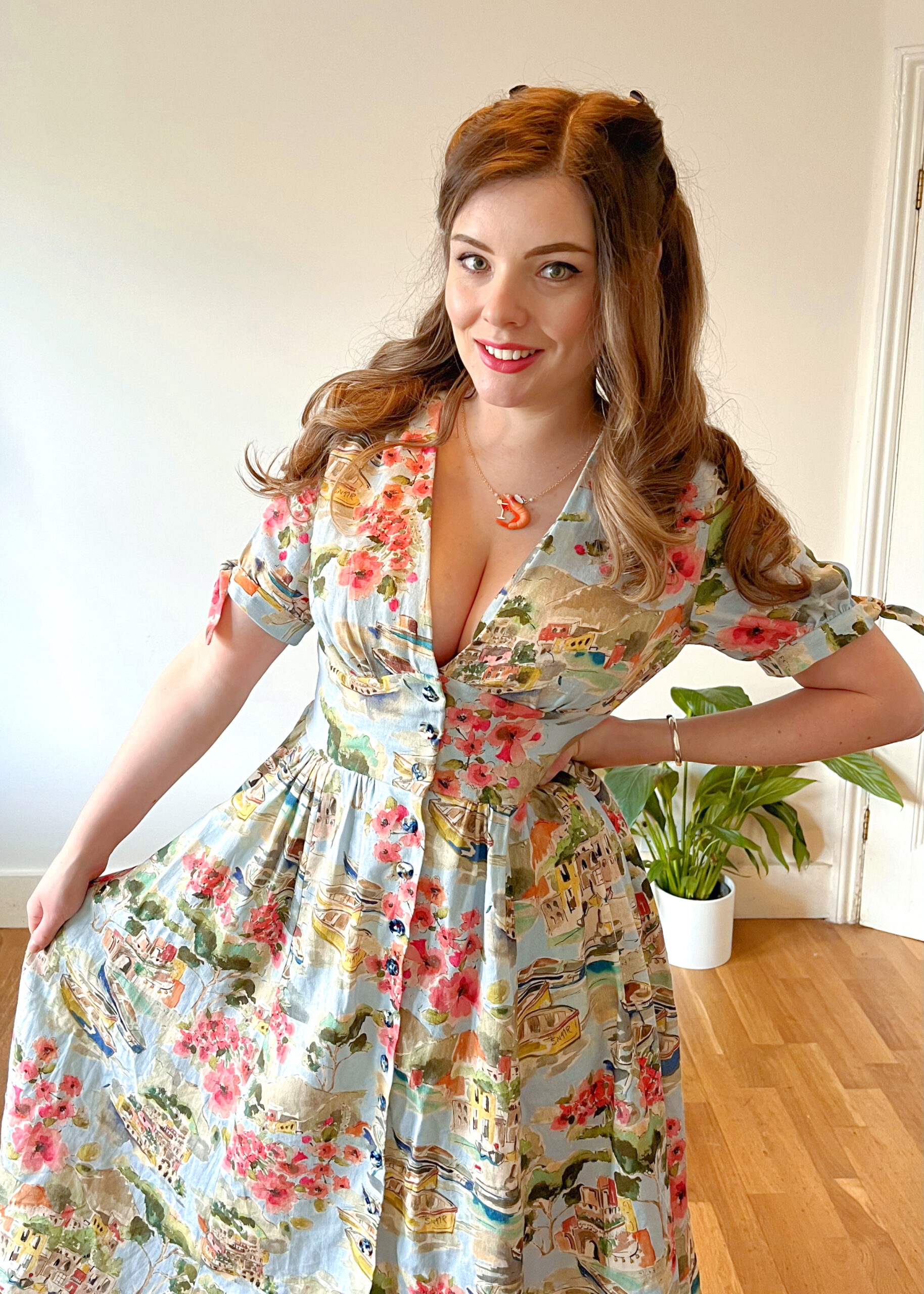 I cannot wait for the weather to get warmer so I can wear this dress out and about; I love the shades of pastel blue and pink, and the longer midi length. This dress makes me forgo my classic red lip for a bright pop of pink and dream of romantic holidays to Venice…