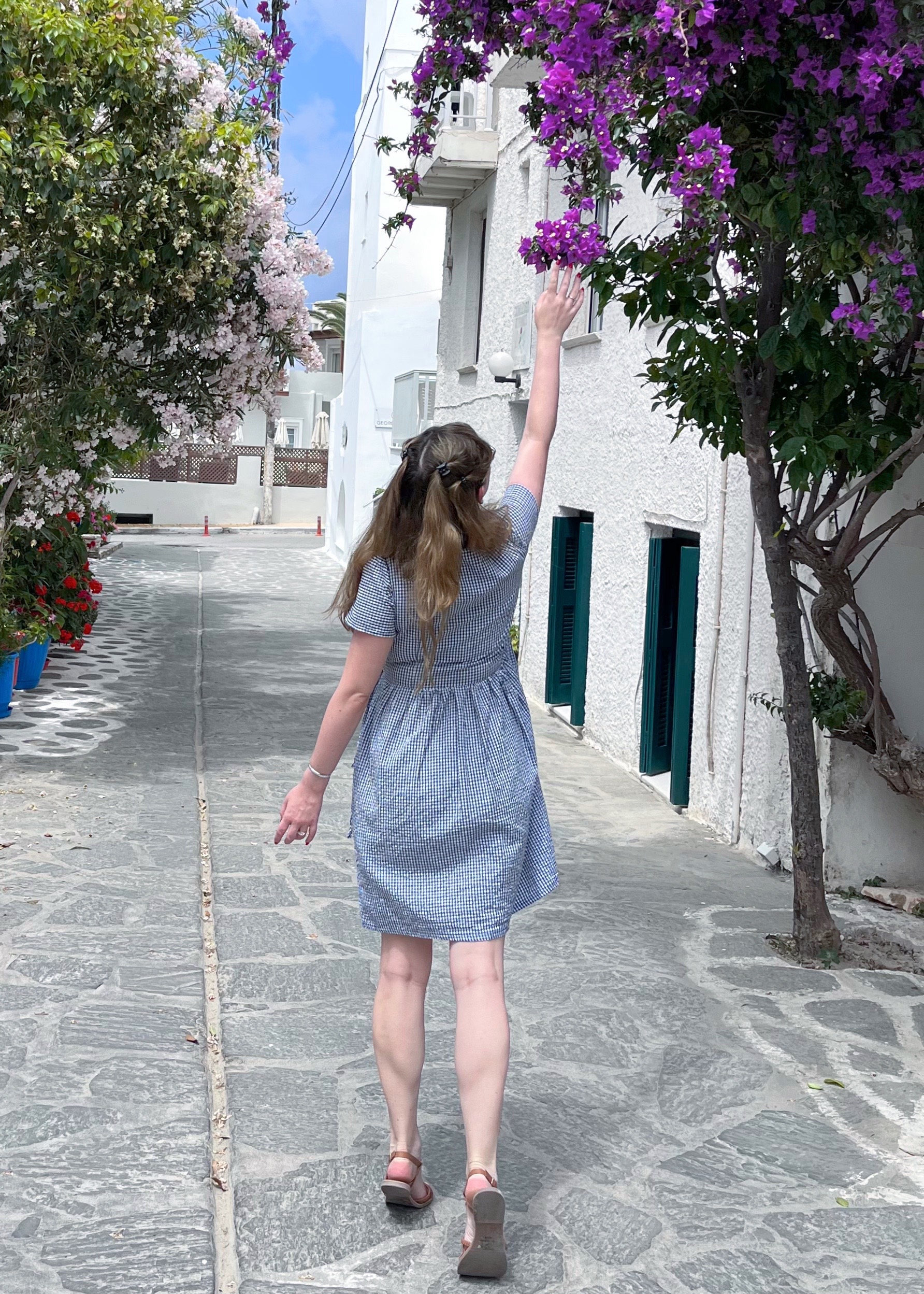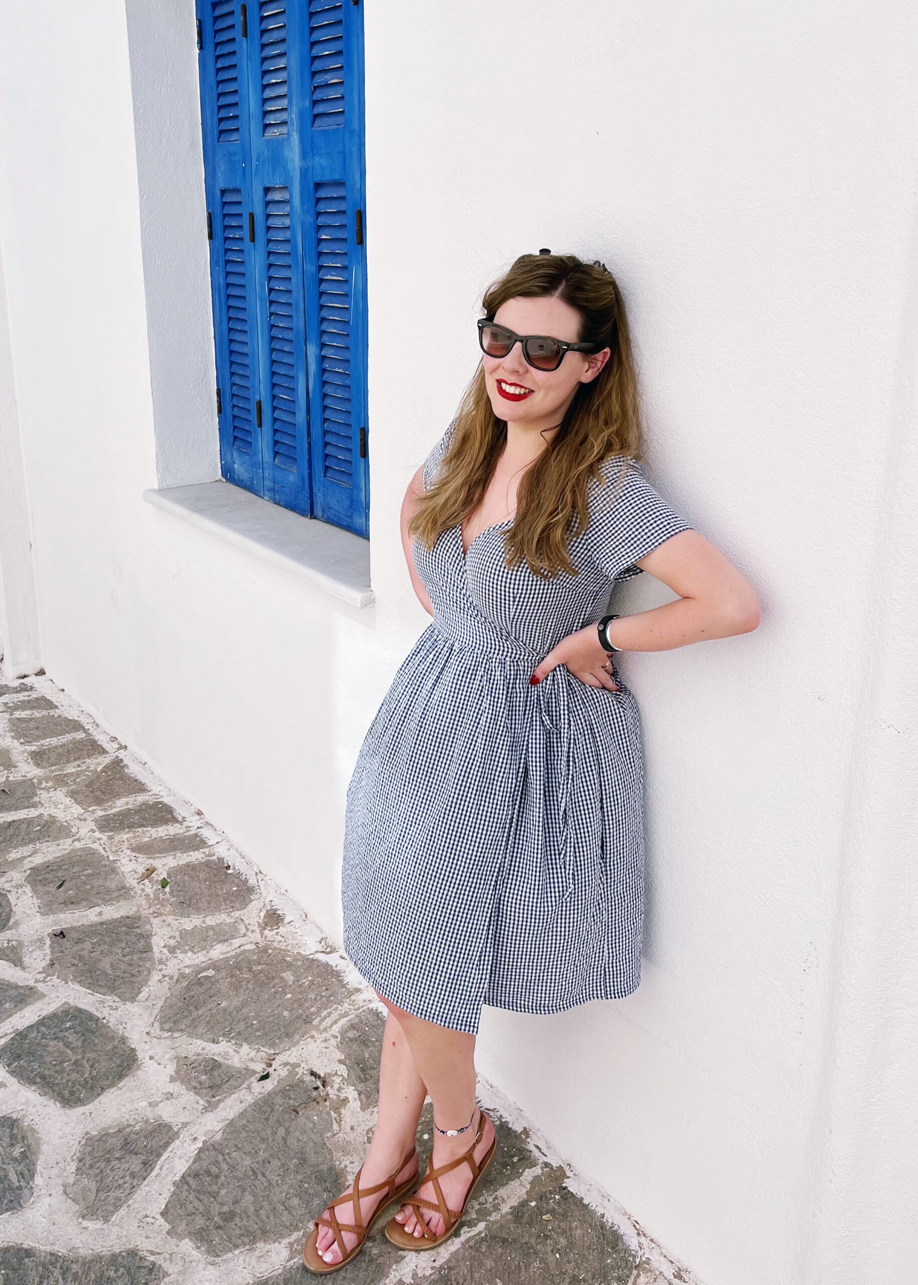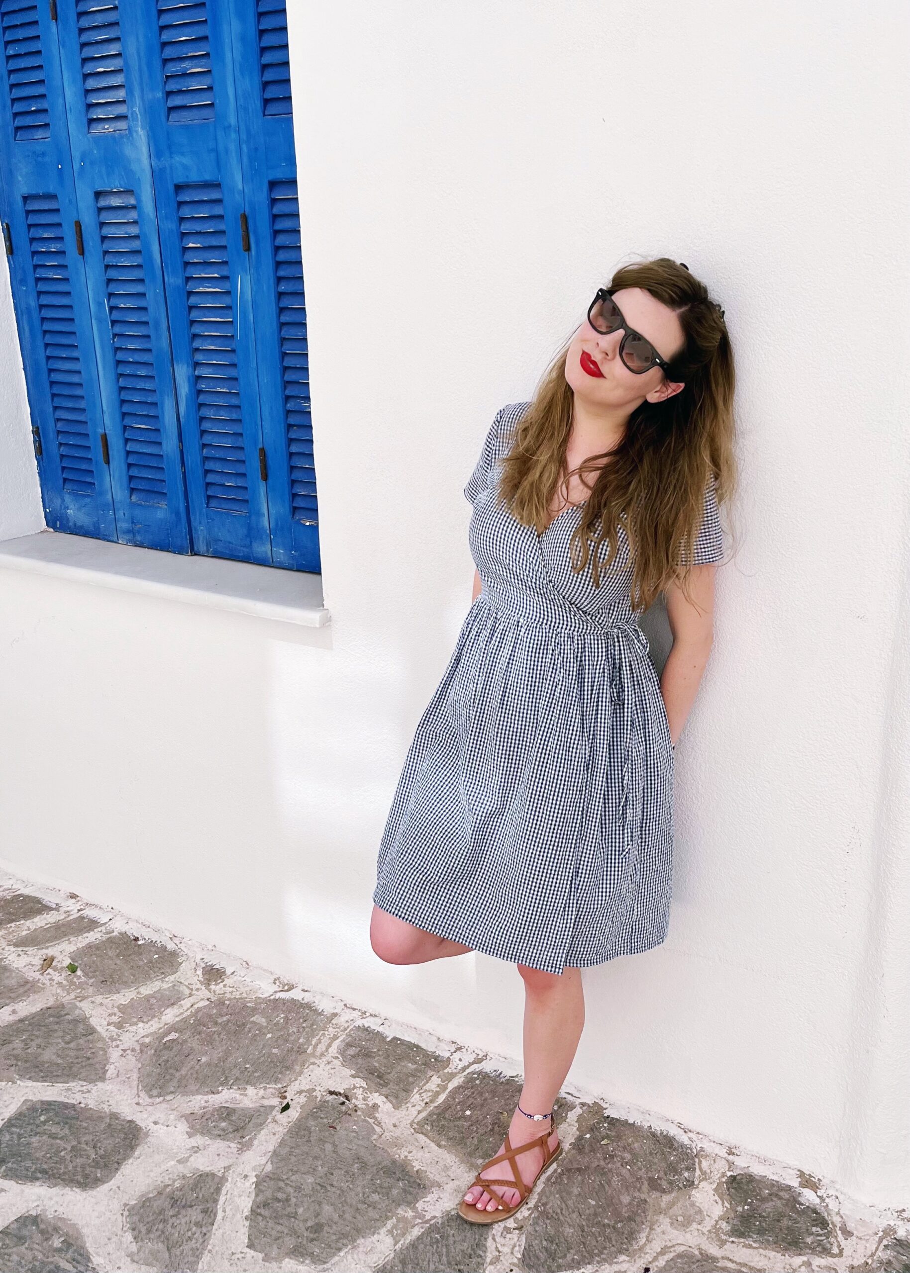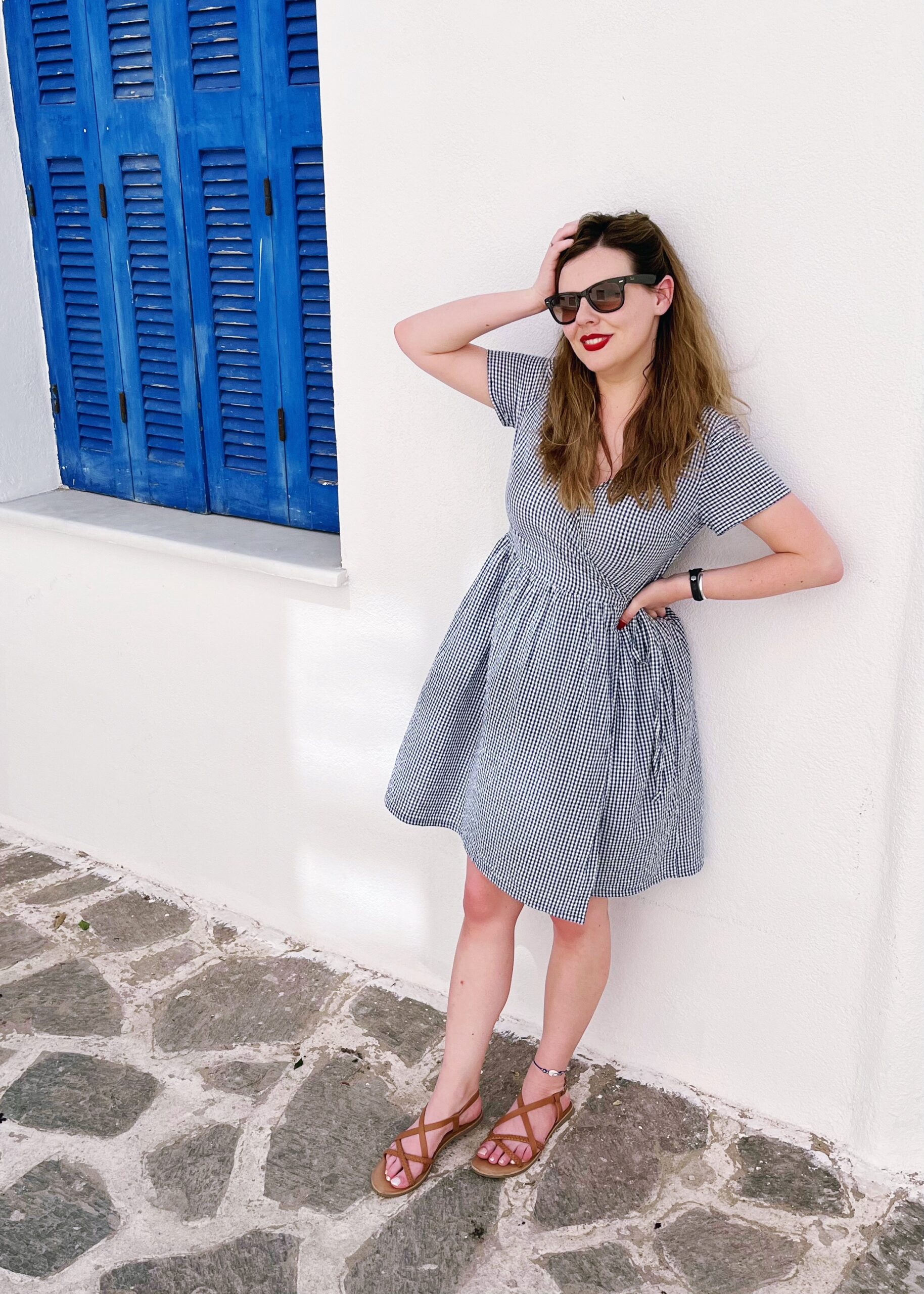 I will certainly making more Hannah wrap dresses in my future! I love the full gathered skirt and how quickly it came together — nothing quite like a super-satisfying sew 😊 This dress was perfect for my trip to Greece and looked perfect next to the white-washed walls and blue-shutters in Naxos. Next time, I think I will size down and do a FBA (instead of being lazy…) and also move the side seam pockets up by 1″ or so.