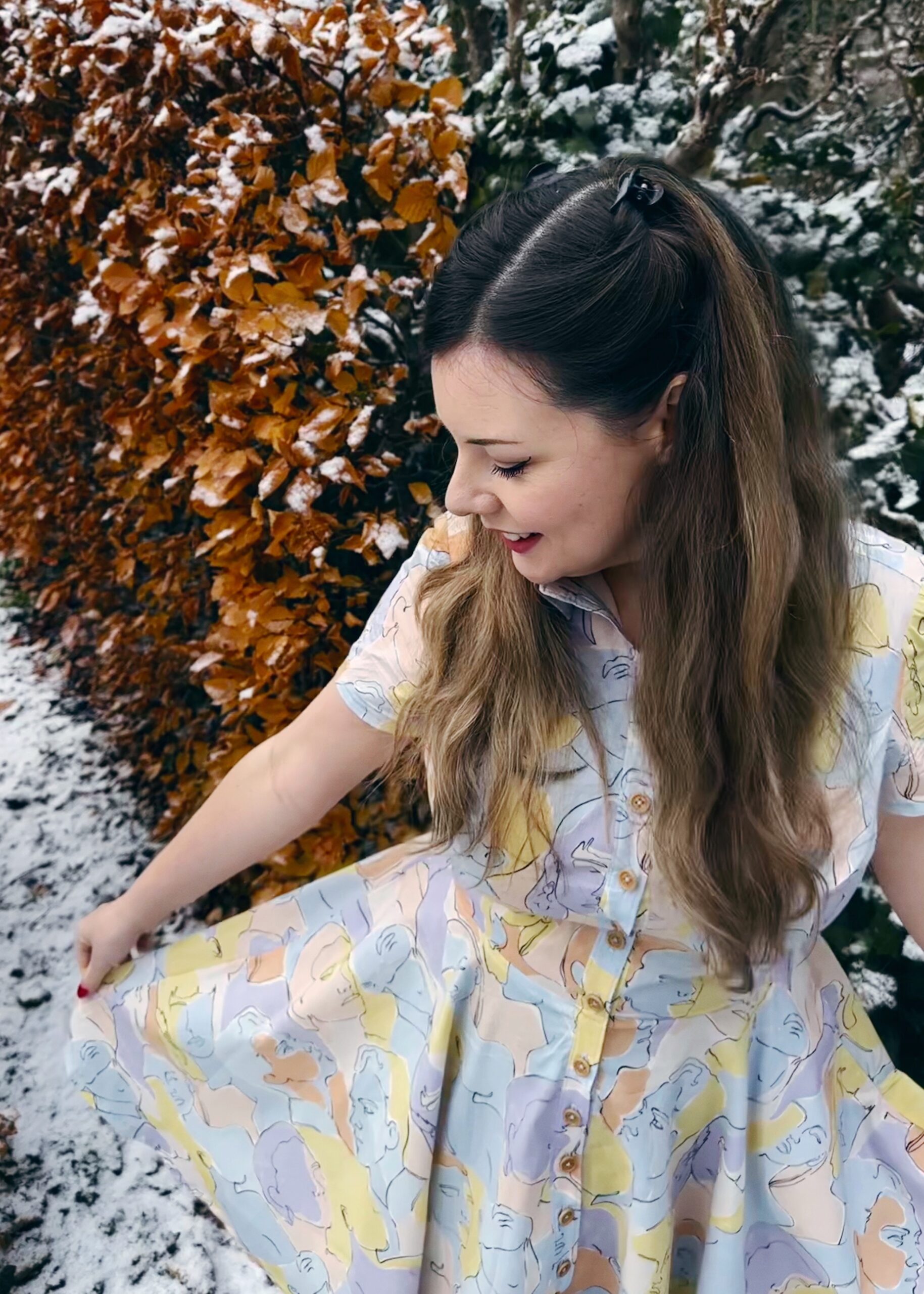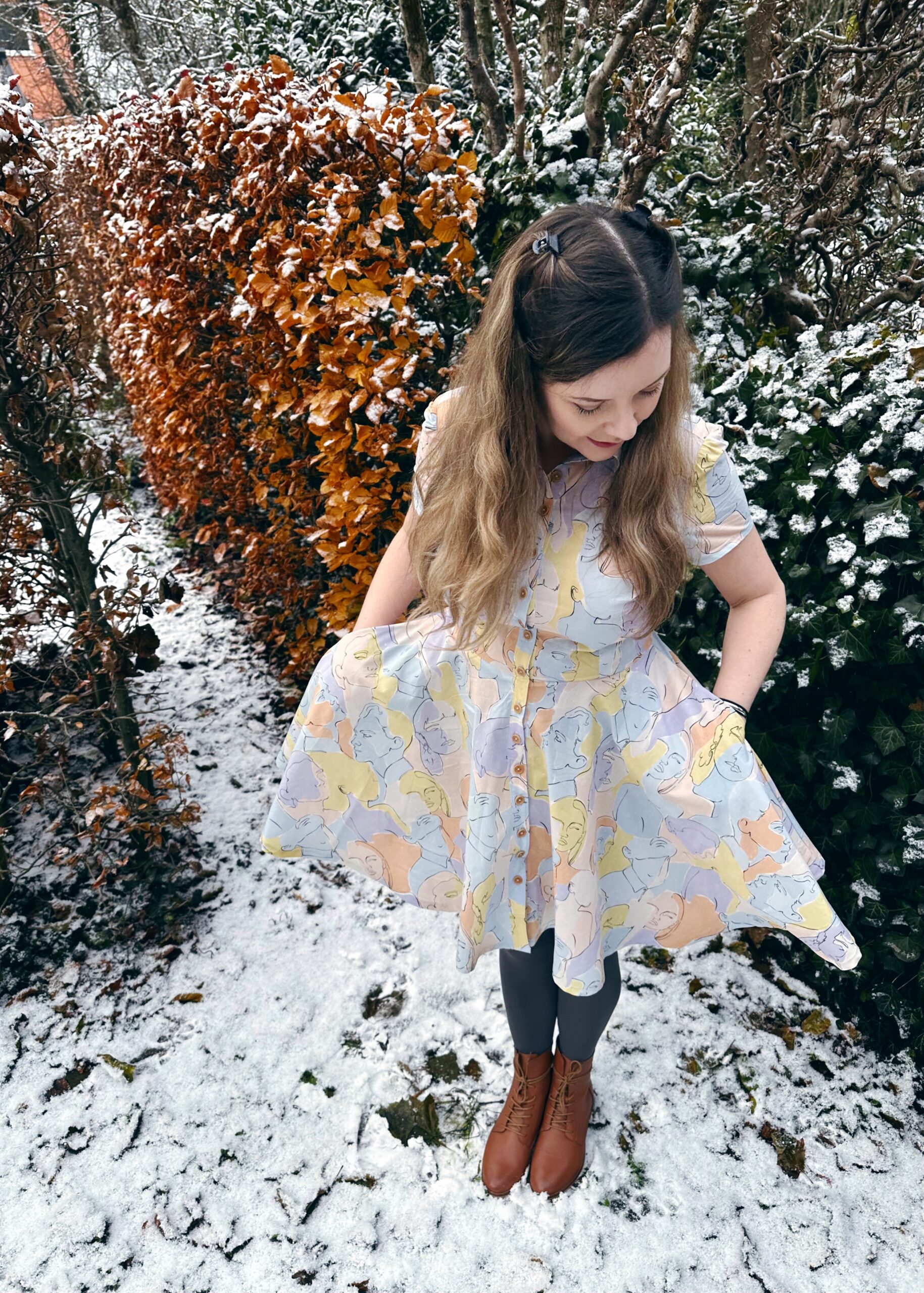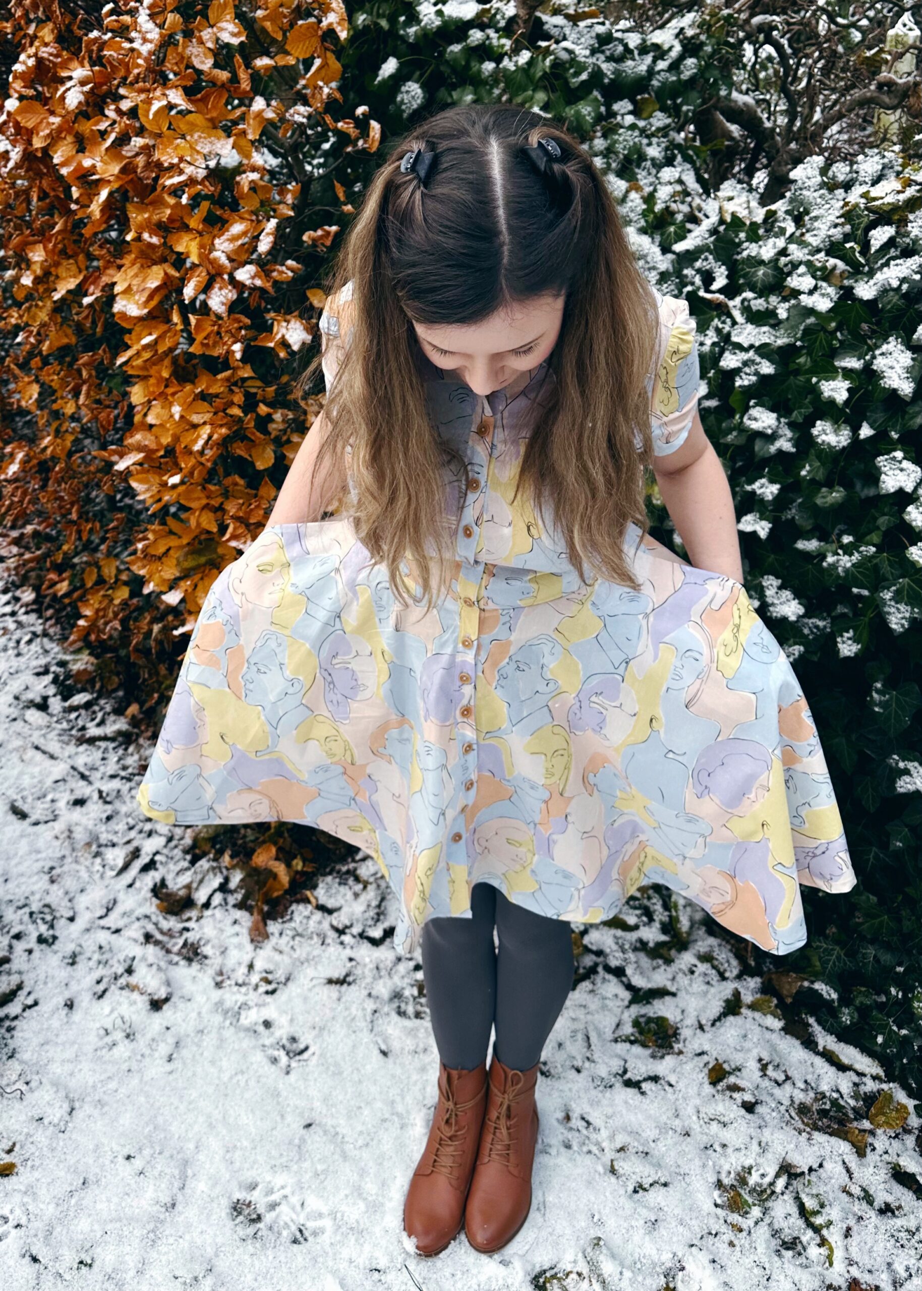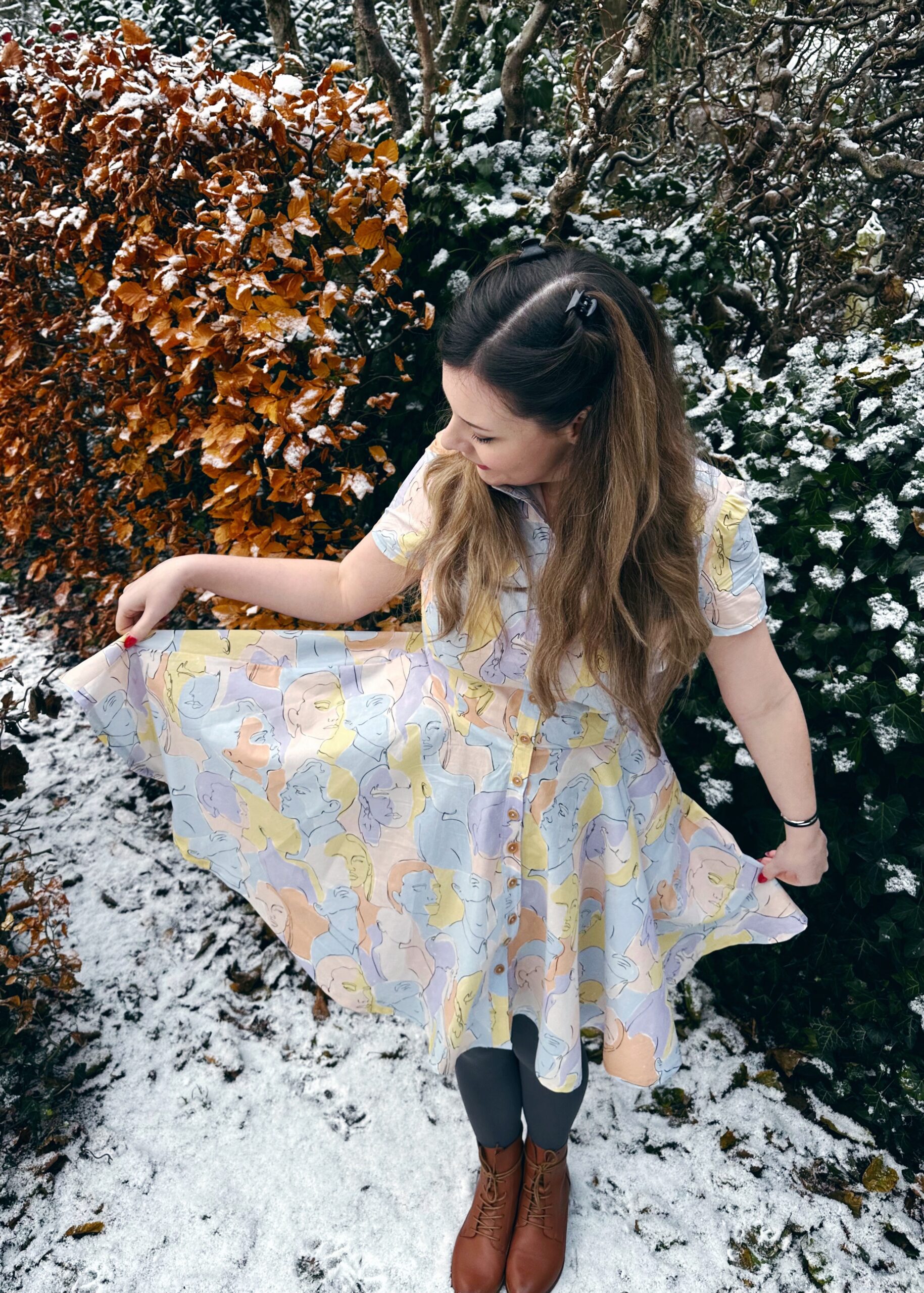 When the team reached out to me to select a fabric, I quickly chose one I have had my eye on for ages; this cotton lawn is called Deep in Thought and it is in the dreamiest shades of pastel — sky blue, peach, lavender and lemon yellow. I honestly cannot wait for spring to wear this dress, I think this palette will be perfect. The one-way design of this fabric has an abstract print of sketched faces is really unique; it takes a couple of glances before the shapes begin to become distinct. As I have previously written, I really love the Lady McElroy cotton lawns, since they are lightweight, soft to the touch, easy to work with and suit garments that have a little more fullness to them — and I usually gravitate towards a big, swingy skirt! I knew that I would want a pattern that showcases both the print and the properties of this fabric and went with a tried-and-tested favourite of mine: a button-up dress.