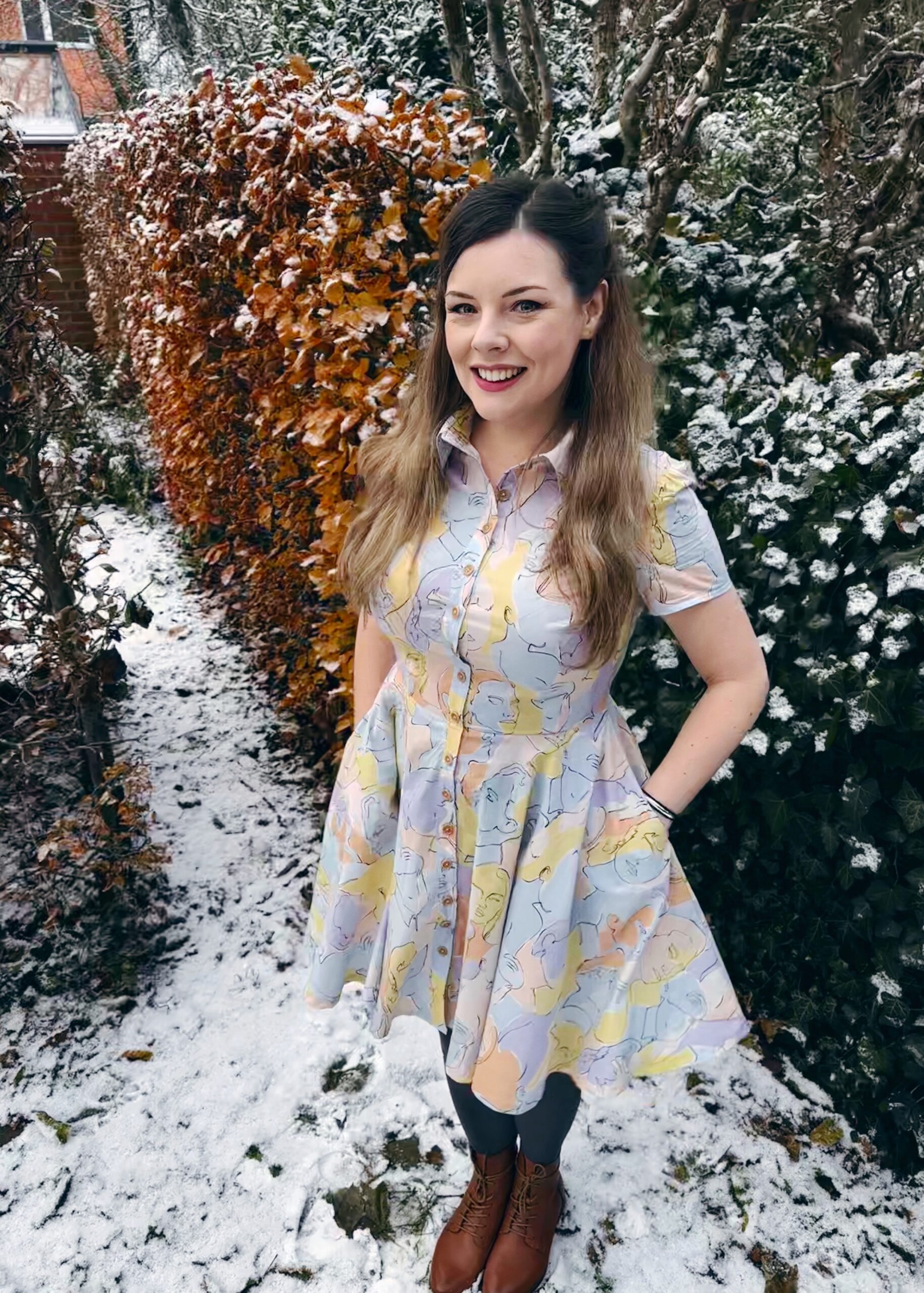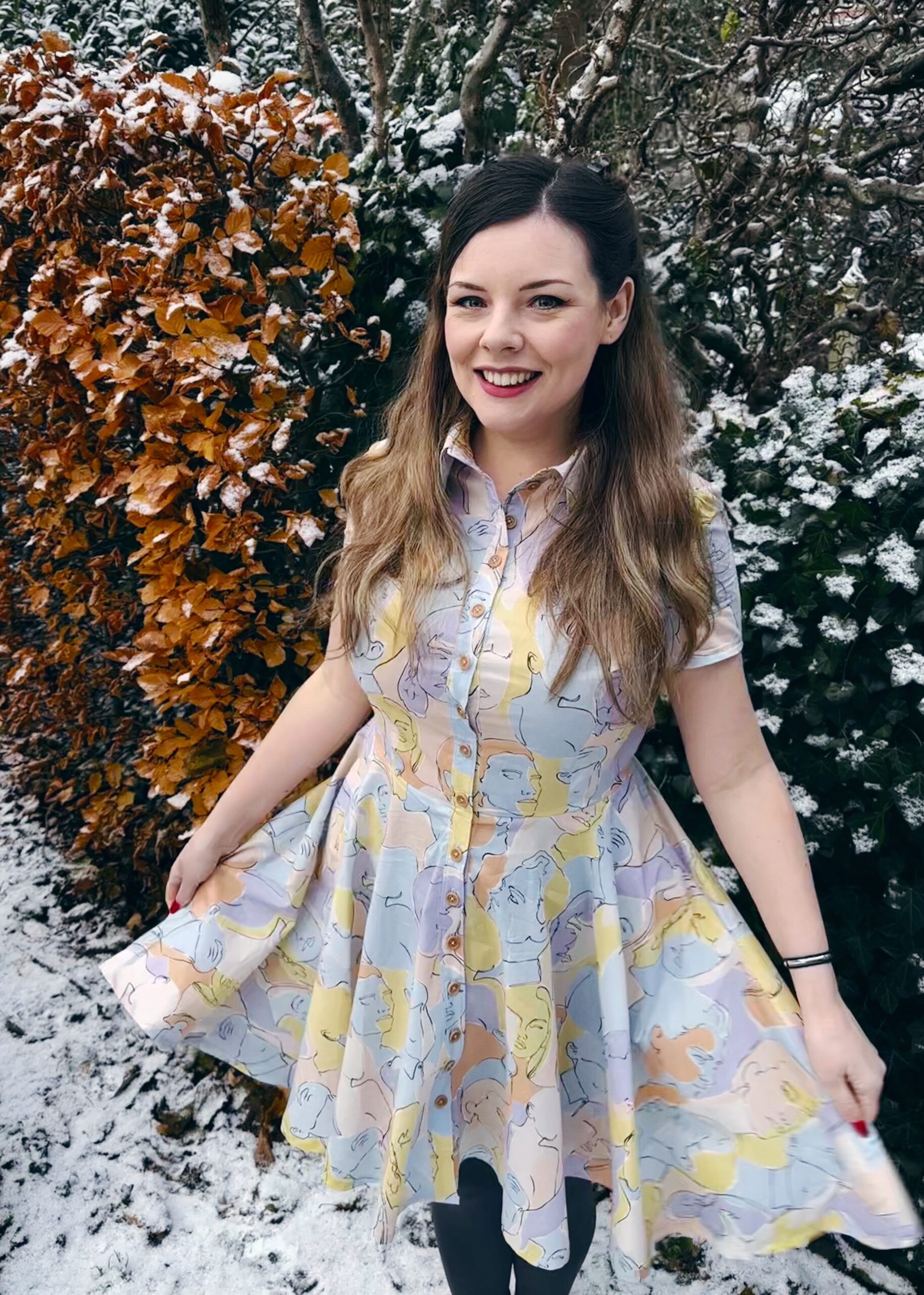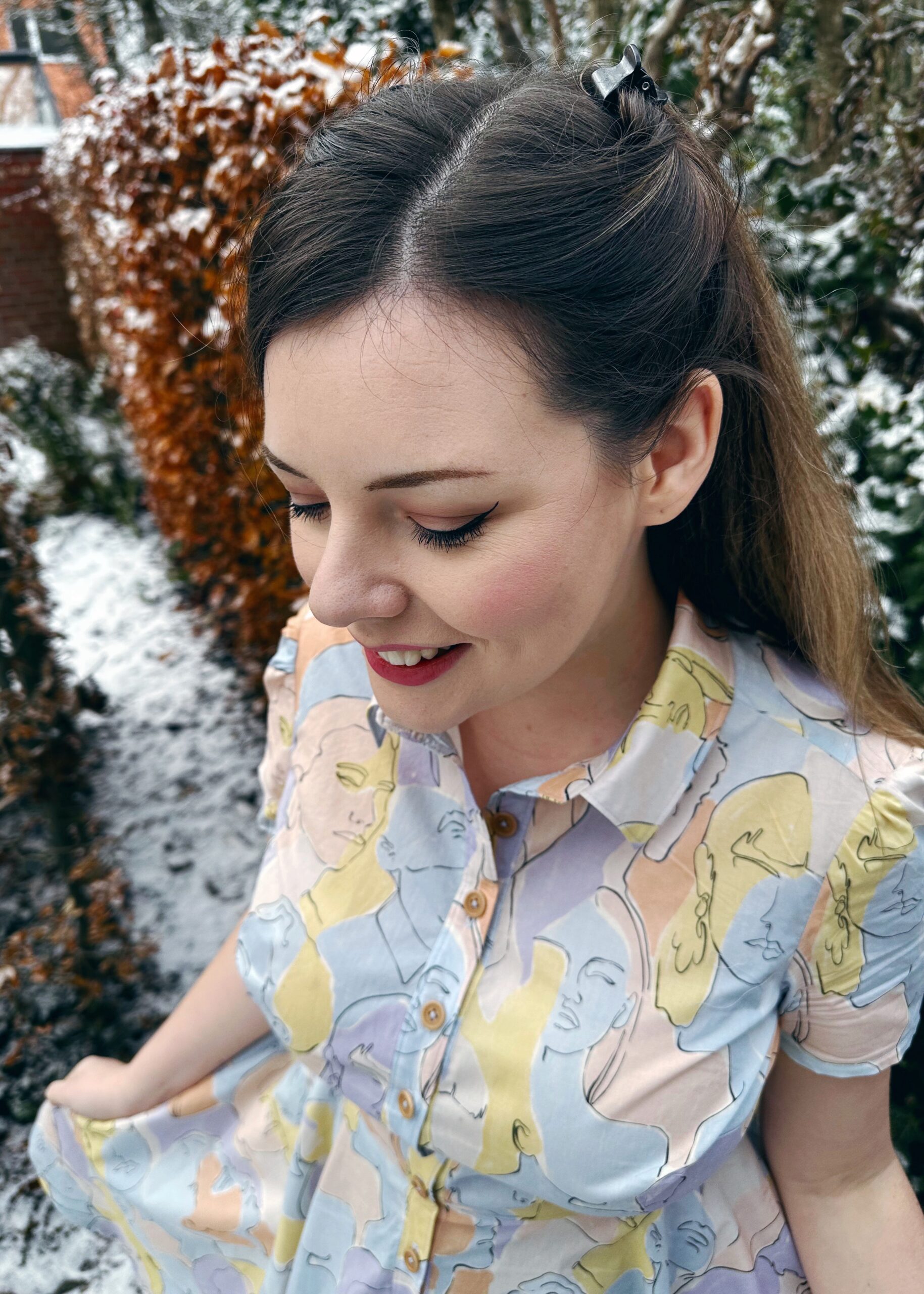 When the team reached out to me to select a fabric, I quickly chose one I have had my eye on for ages; this cotton lawn is called Deep in Thought and it is in the dreamiest shades of pastel — sky blue, peach, lavender and lemon yellow. I honestly cannot wait for spring to wear this dress, I think this palette will be perfect. The one-way design of this fabric has an abstract print of sketched faces is really unique; it takes a couple of glances before the shapes begin to become distinct. As I have previously written, I really love the Lady McElroy cotton lawns, since they are lightweight, soft to the touch, easy to work with and suit garments that have a little more fullness to them — and I usually gravitate towards a big, swingy skirt! I knew that I would want a pattern that showcases both the print and the properties of this fabric and went with a tried-and-tested favourite of mine: a button-up dress.