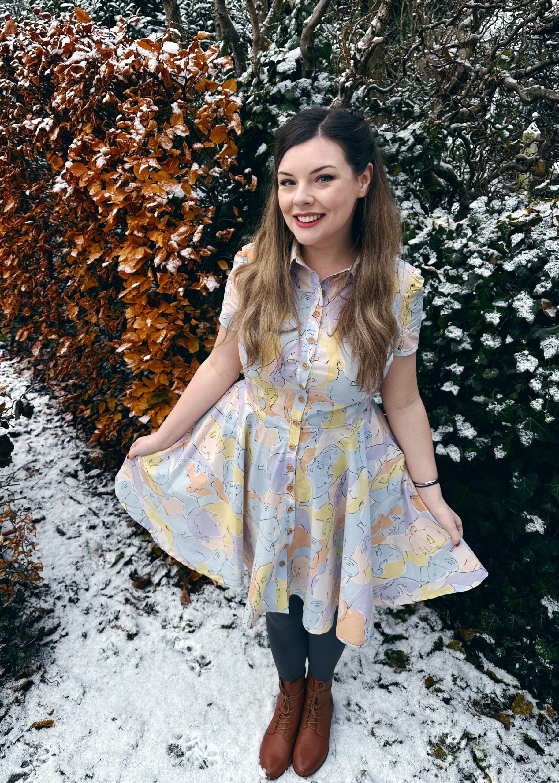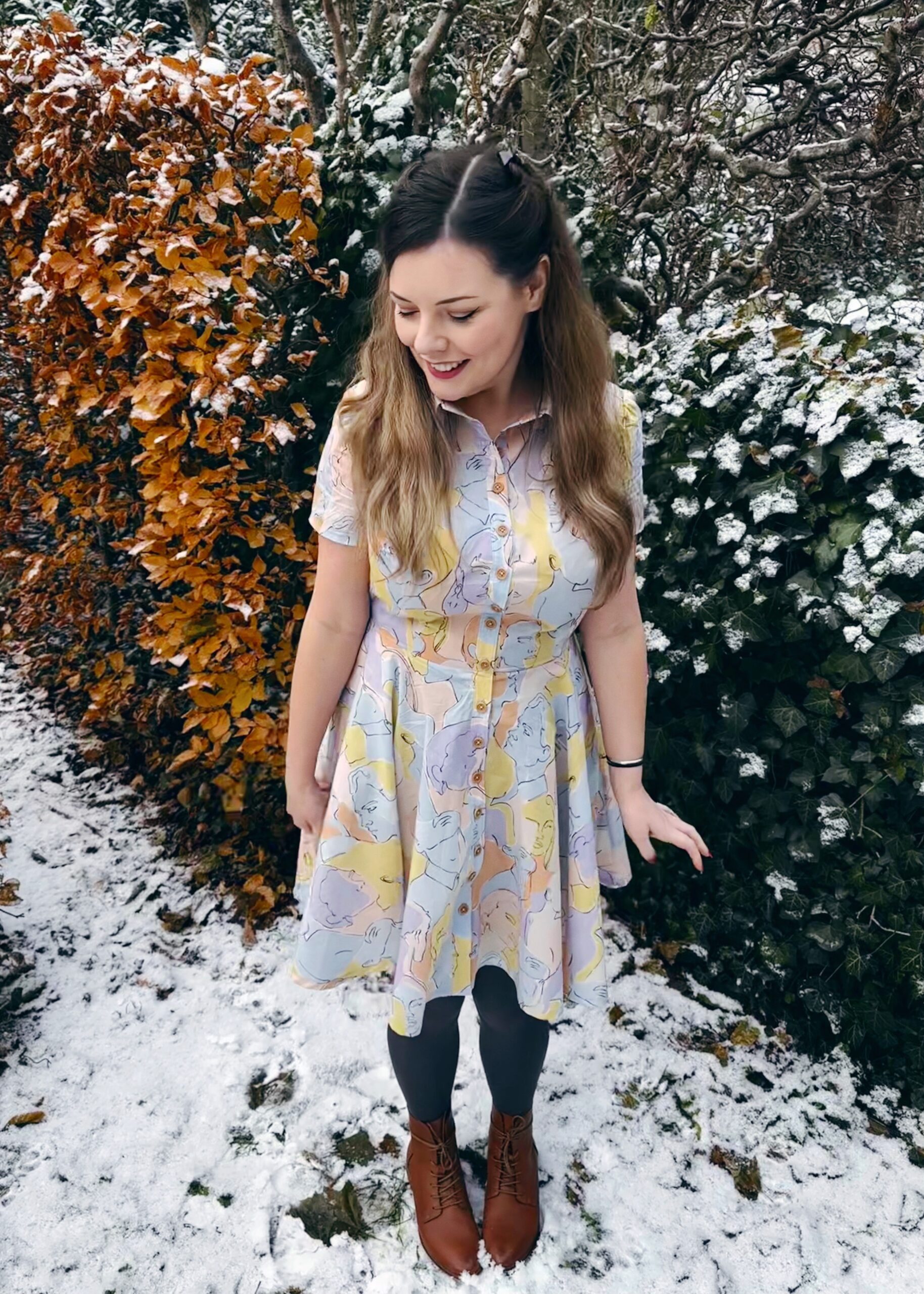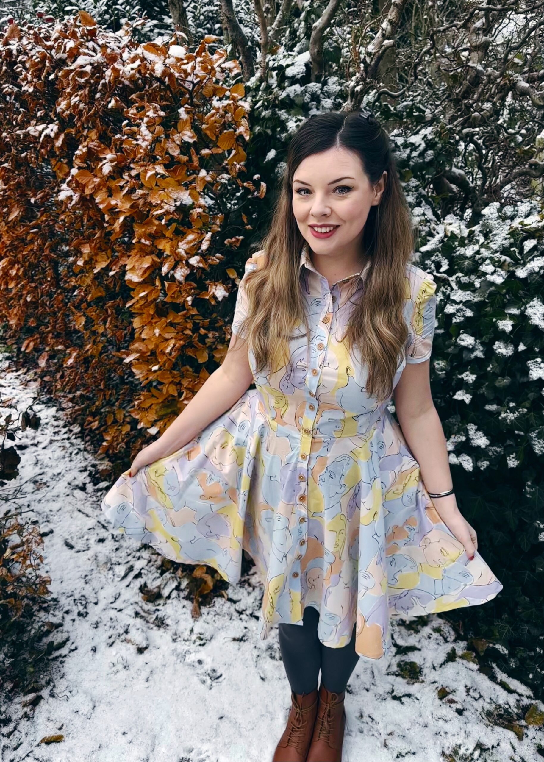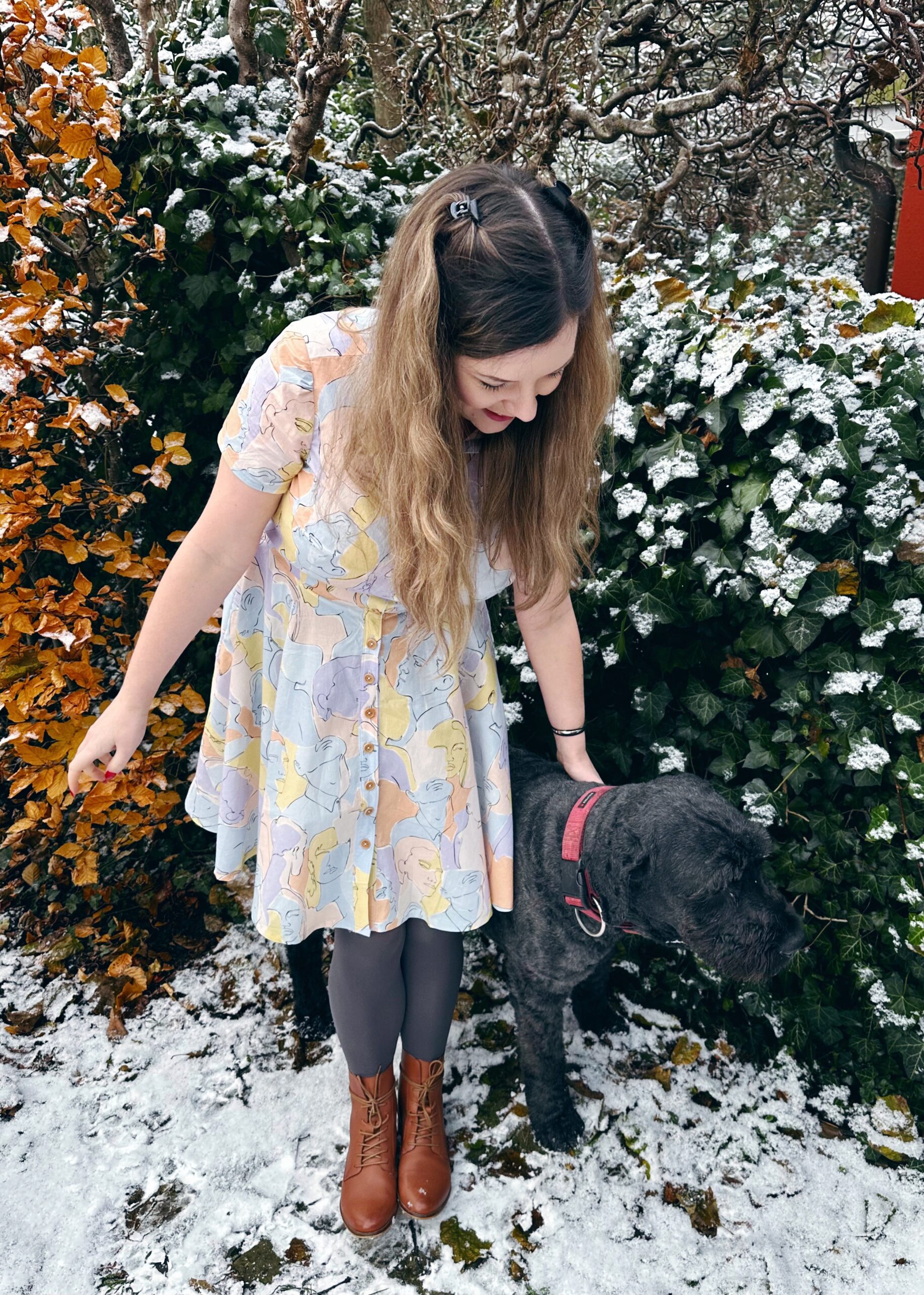 When the team reached out to me to select a fabric, I quickly chose one I have had my eye on for ages; this cotton lawn is called Deep in Thought and it is in the dreamiest shades of pastel — sky blue, peach, lavender and lemon yellow. I honestly cannot wait for spring to wear this dress, I think this palette will be perfect. The one-way design of this fabric has an abstract print of sketched faces is really unique; it takes a couple of glances before the shapes begin to become distinct. As I have previously written, I really love the Lady McElroy cotton lawns, since they are lightweight, soft to the touch, easy to work with and suit garments that have a little more fullness to them — and I usually gravitate towards a big, swingy skirt! I knew that I would want a pattern that showcases both the print and the properties of this fabric and went with a tried-and-tested favourite of mine: a button-up dress.