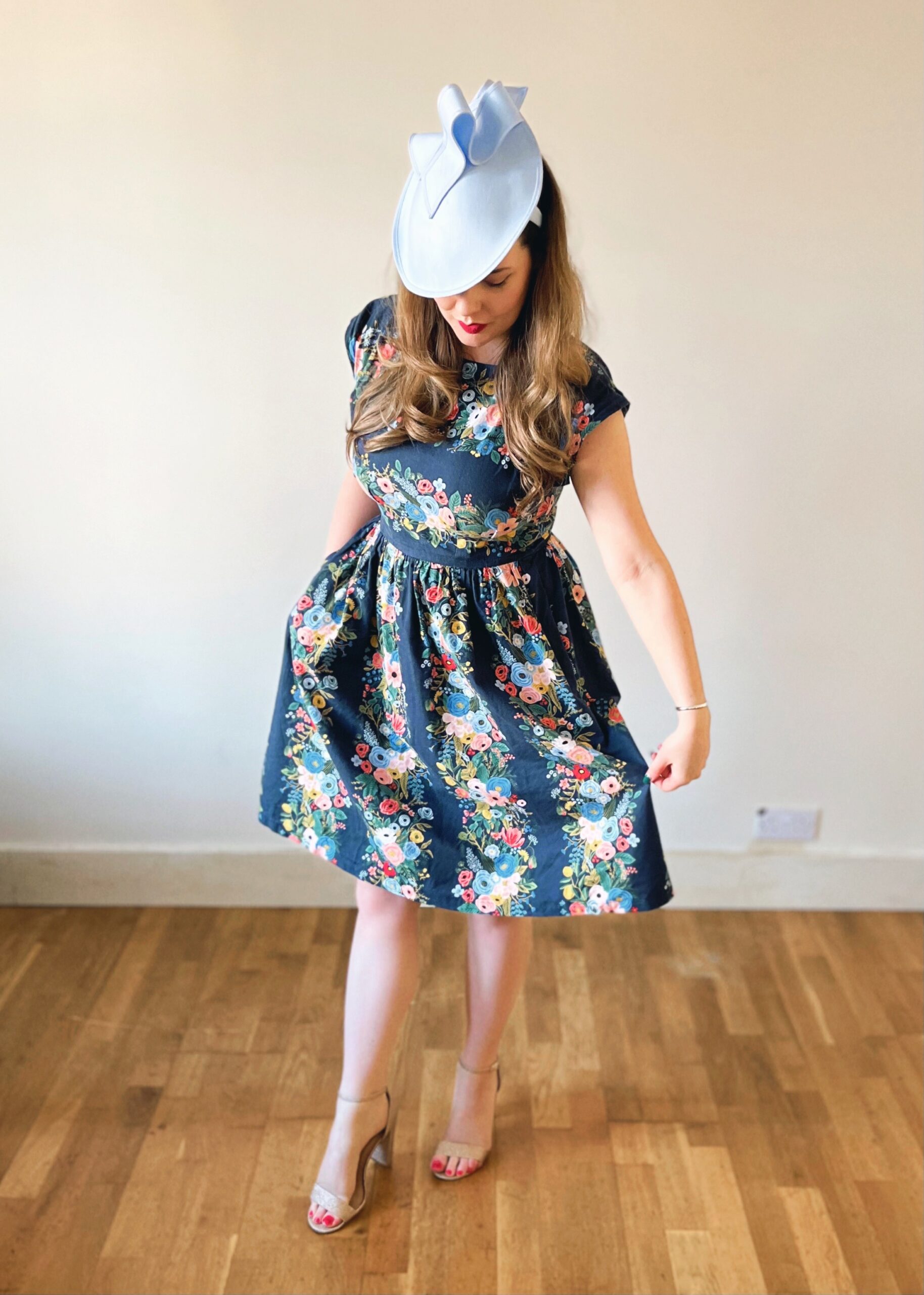 Before I cut out this dress, I spent some time thinking about the stripe placement on both the bodice and the skirt. I put a poll up on my Instagram on whether to have the stripes running vertically or horizontally on the skirt, with opinion very firmly pro-vertical stripes! For the bodice, I wanted to carefully place the floral stripes, so that it would look balanced between the plain navy portions. By having the navy portion concentrated at both the waistline and slightly above my bust point, the eye goes there, which creates a nice visual balance between the full gathered skirt.