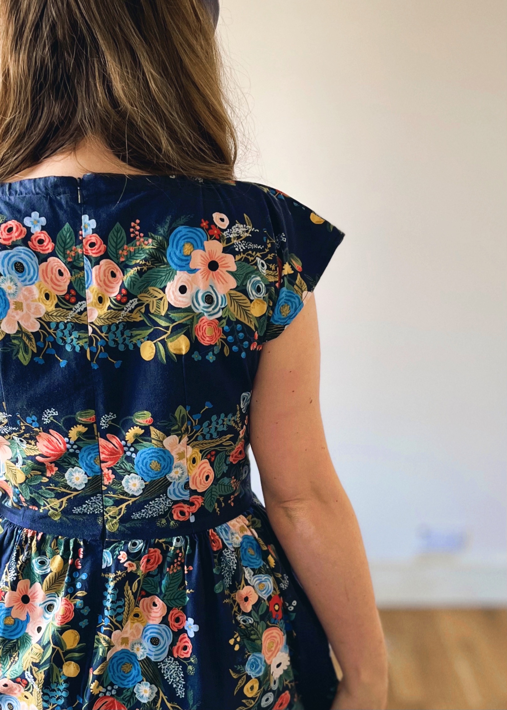 Construction of this dress was super quick, as there was no fiddling around setting in sleeves or lining up multiple skirt panels! I switched out the neckline facing with bias binding instead, as I usually prefer that finish on an unlined garment. I am so chuffed with my invisible zip — this may be my best attempt yet. Practice truly does make perfect, and sewing is a great hobby for seeing evidence on how you improve over time. I wish I had more fabric, so I could have patterned-matched across the back bodice, but alas it was not feasible 😅