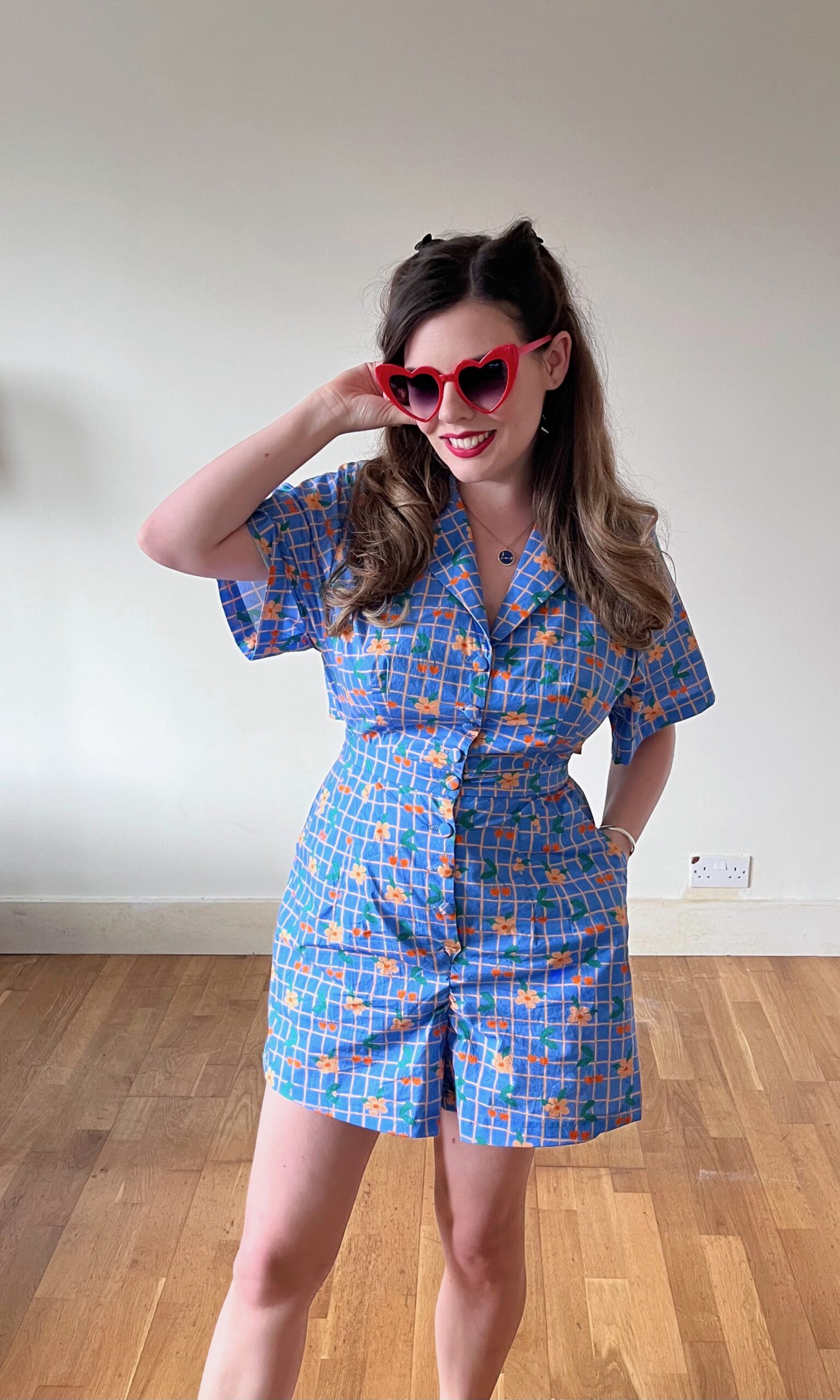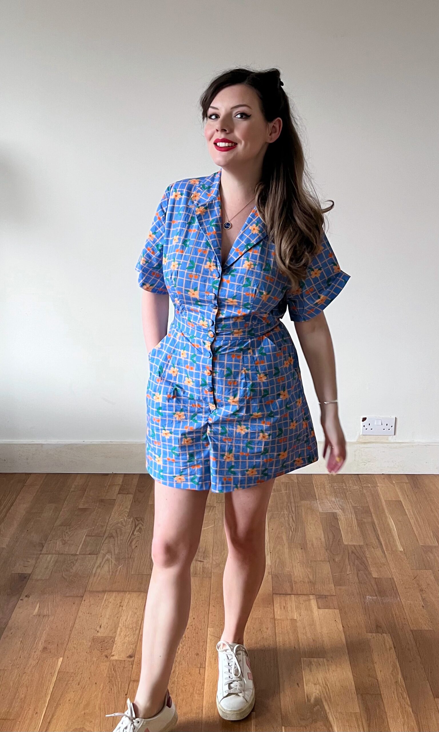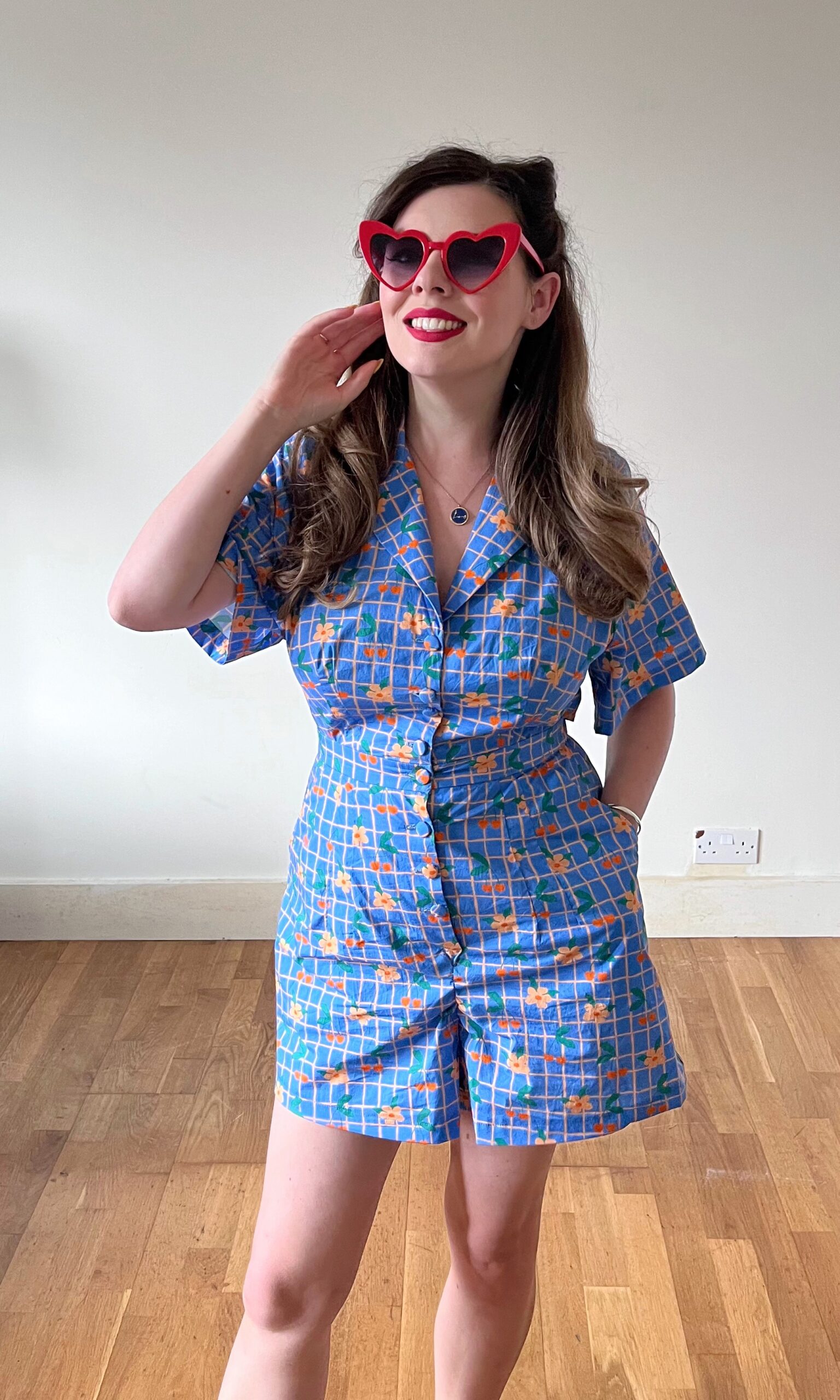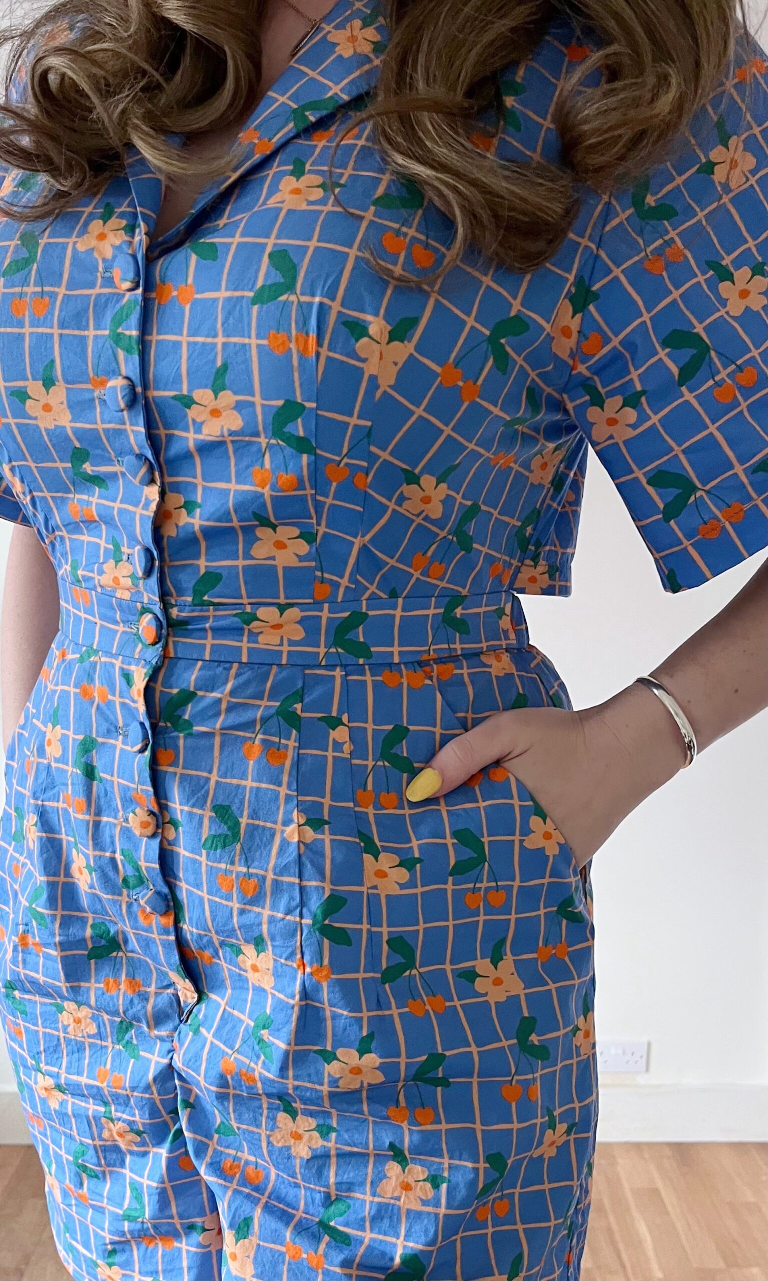 Ever since I found this gorgeous Pigeon Wishes deadstock cotton poplin from Sew Me Sunshine, I have been thinking about how this fabric needed to become a vintage-style playsuit. This poplin is lightweight but with a very crisp hand, which means it is very suited for designs with structured elements like collars and buttonholes. I love the azure shade of bright blue for the background, and the slightly lopsided peach grid design with peach flowers and orange-y cherries overlaid. I just could not shake the feeling that a playsuit would be the best fit for this fabric for me! I had been musing about various 1940s playsuit sewing pattern designs, and trying to either find a vintage pattern or modern pattern that was exactly what I wanted was proving quite difficult…