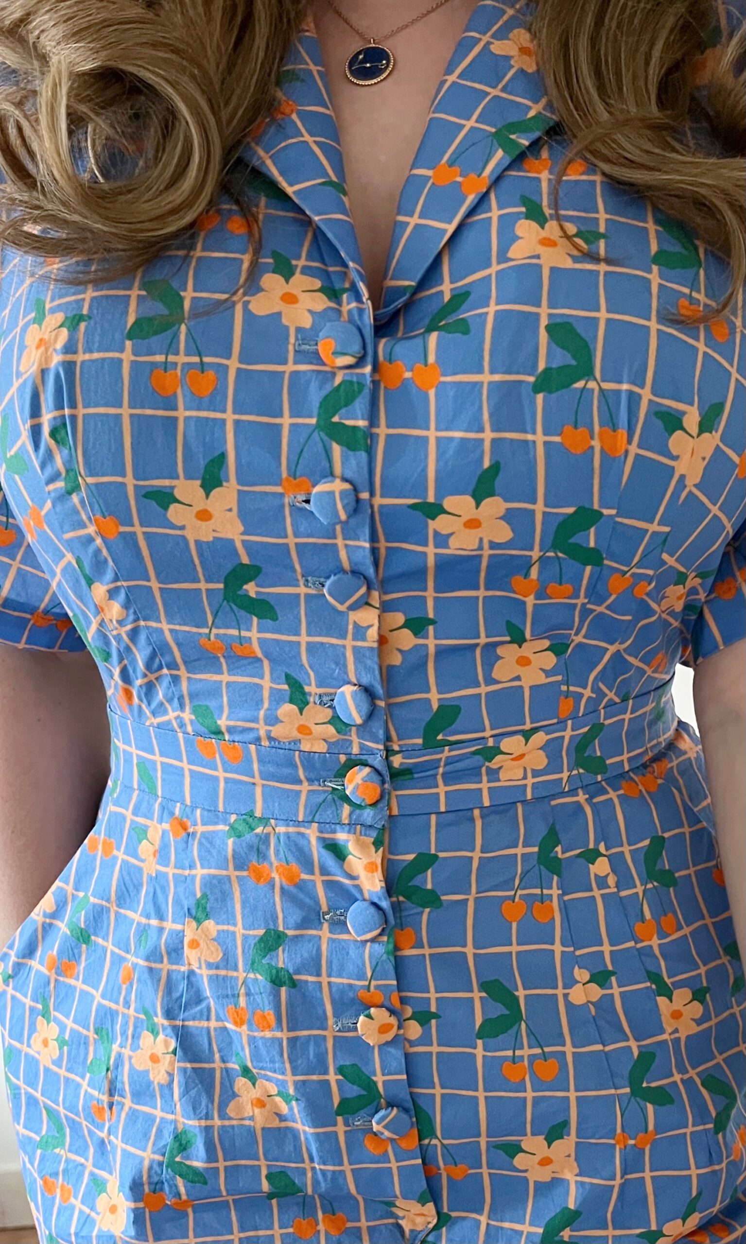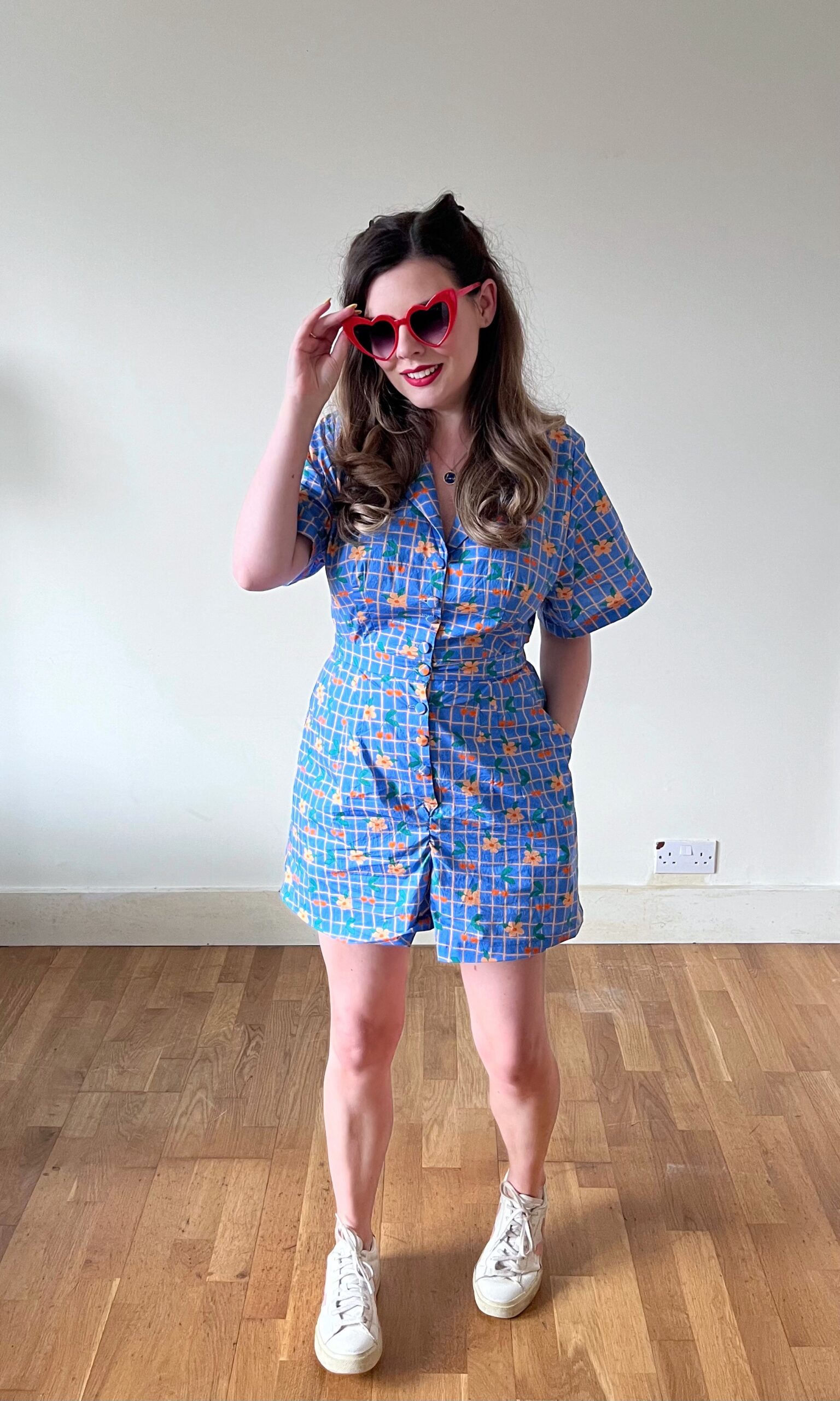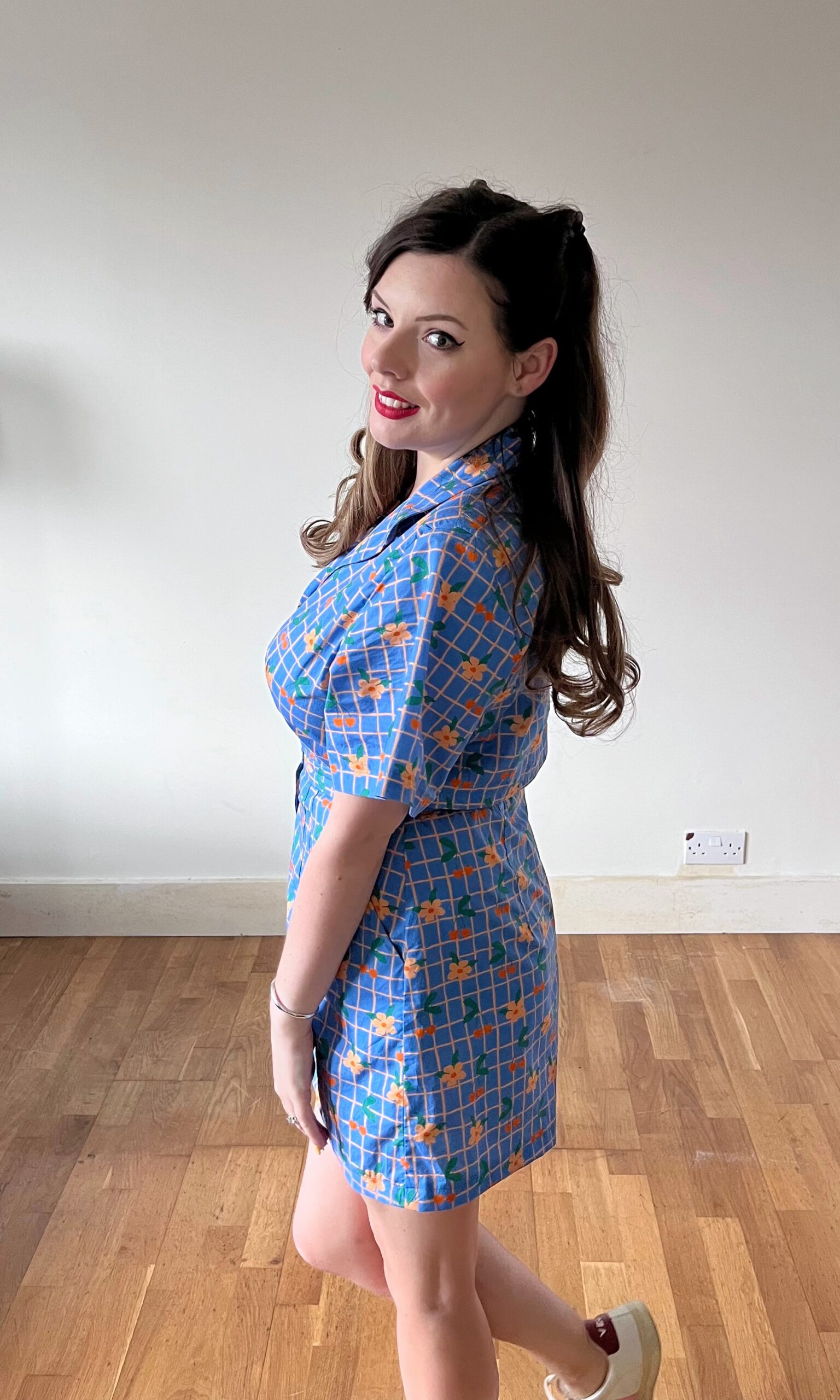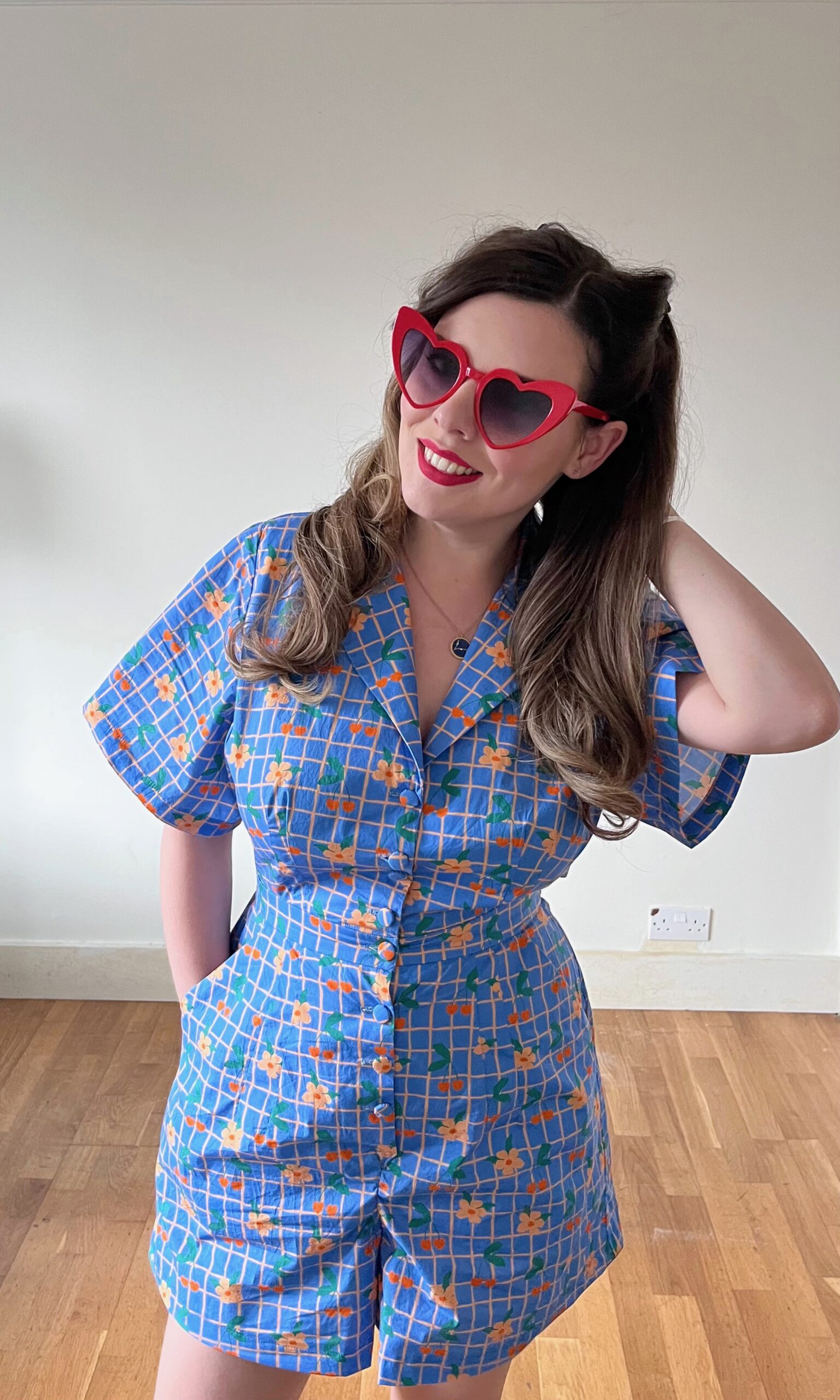 Ever since I found this gorgeous Pigeon Wishes deadstock cotton poplin from Sew Me Sunshine, I have been thinking about how this fabric needed to become a vintage-style playsuit. This poplin is lightweight but with a very crisp hand, which means it is very suited for designs with structured elements like collars and buttonholes. I love the azure shade of bright blue for the background, and the slightly lopsided peach grid design with peach flowers and orange-y cherries overlaid. I just could not shake the feeling that a playsuit would be the best fit for this fabric for me! I had been musing about various 1940s playsuit sewing pattern designs, and trying to either find a vintage pattern or modern pattern that was exactly what I wanted was proving quite difficult…