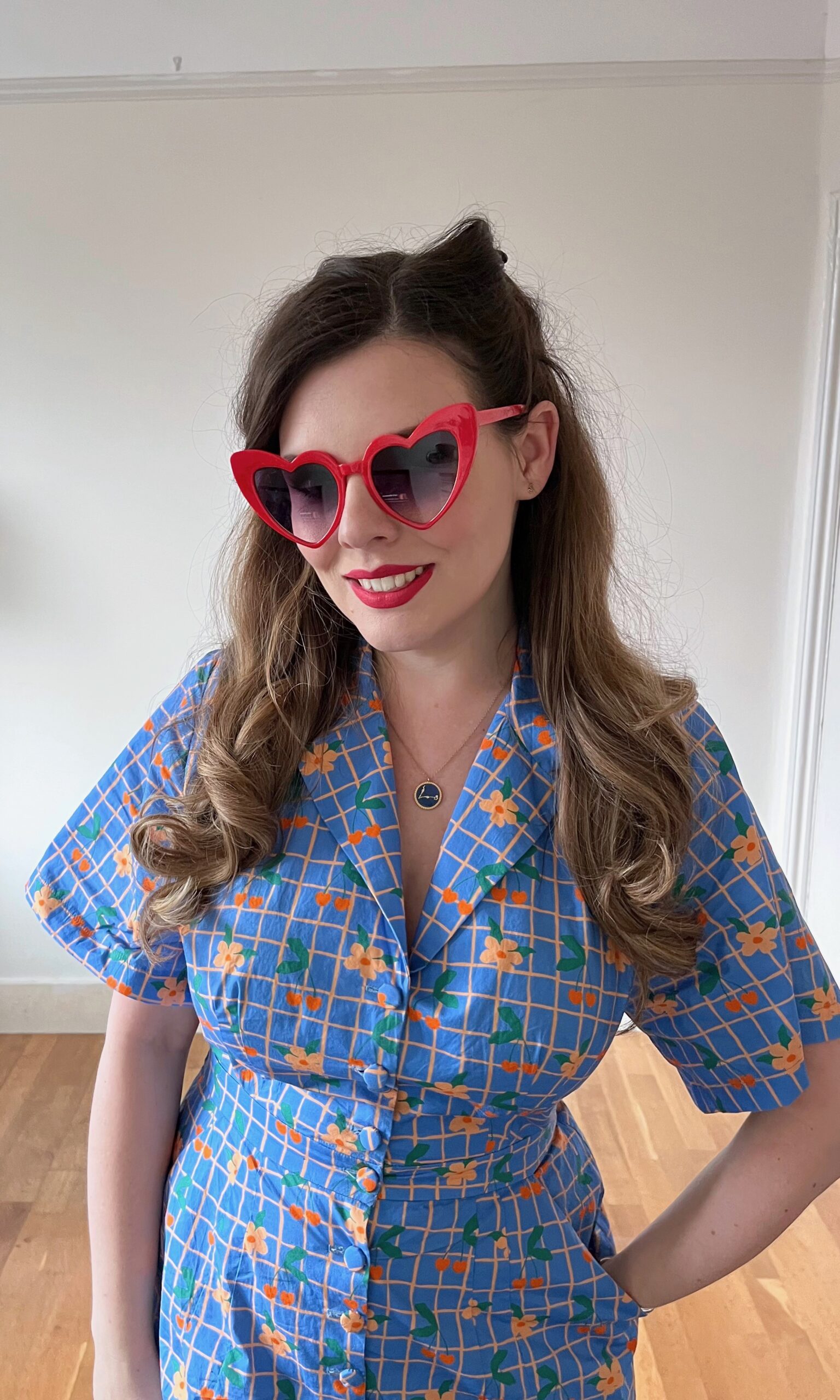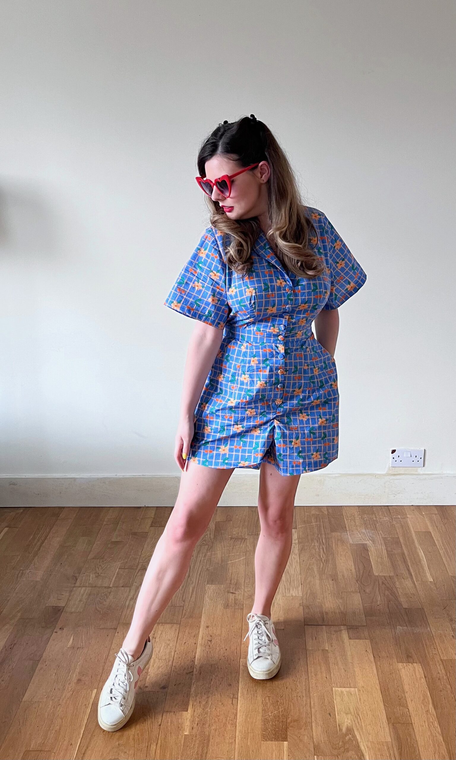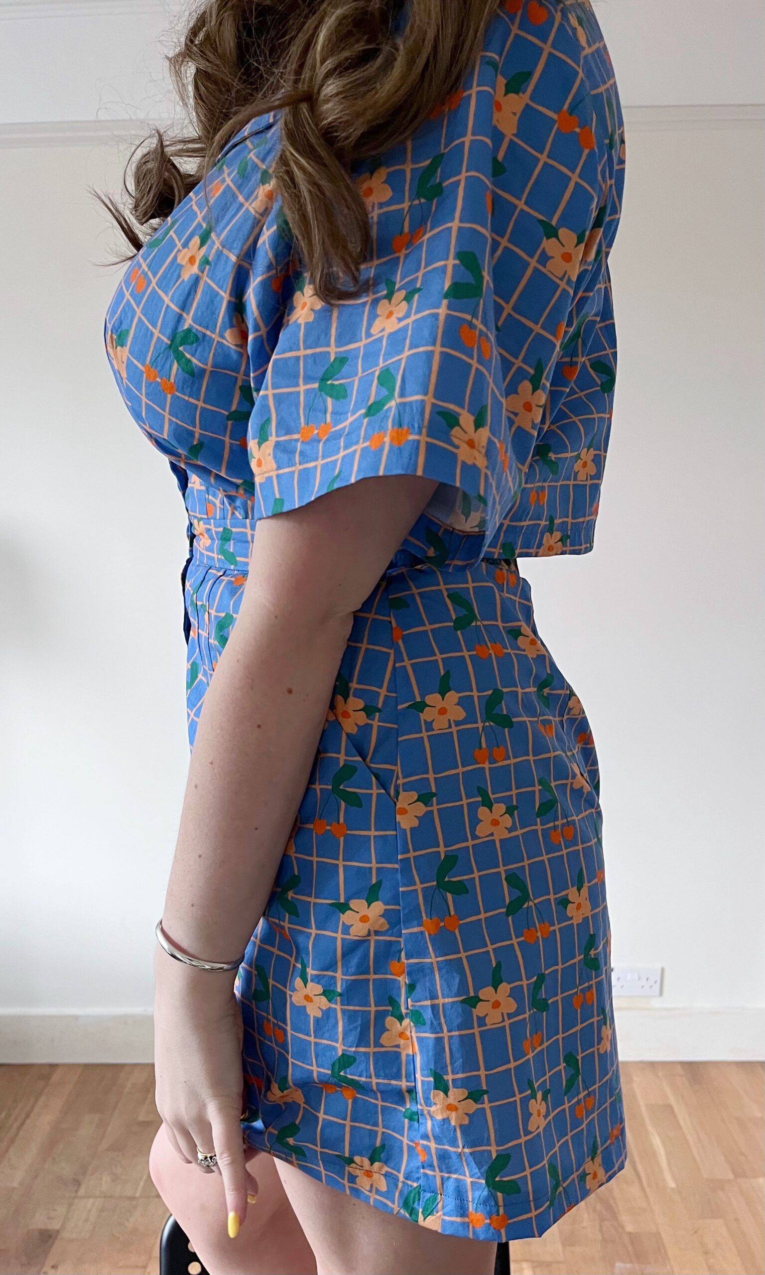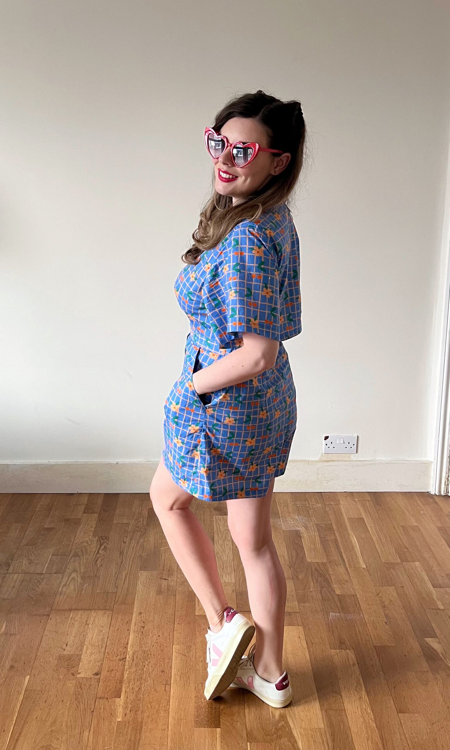 Ever since I found this gorgeous Pigeon Wishes deadstock cotton poplin from Sew Me Sunshine, I have been thinking about how this fabric needed to become a vintage-style playsuit. This poplin is lightweight but with a very crisp hand, which means it is very suited for designs with structured elements like collars and buttonholes. I love the azure shade of bright blue for the background, and the slightly lopsided peach grid design with peach flowers and orange-y cherries overlaid. I just could not shake the feeling that a playsuit would be the best fit for this fabric for me! I had been musing about various 1940s playsuit sewing pattern designs, and trying to either find a vintage pattern or modern pattern that was exactly what I wanted was proving quite difficult…