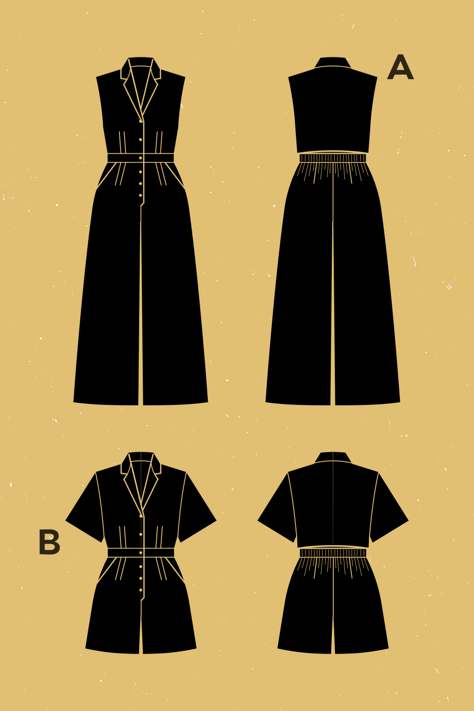 The Eucalyptus Jumpsuit has a slightly relaxed fit, with a notched lapel collar, double darts at the waist, slant pockets, and a button-front. The jumpsuit is sleeveless with culotte-style trousers, whereas the playsuit has wide sleeves and cropped shorts. My favourite element of this design is the peek-a-boo back — it immediately takes the 1940s vintage styling into the modern day.