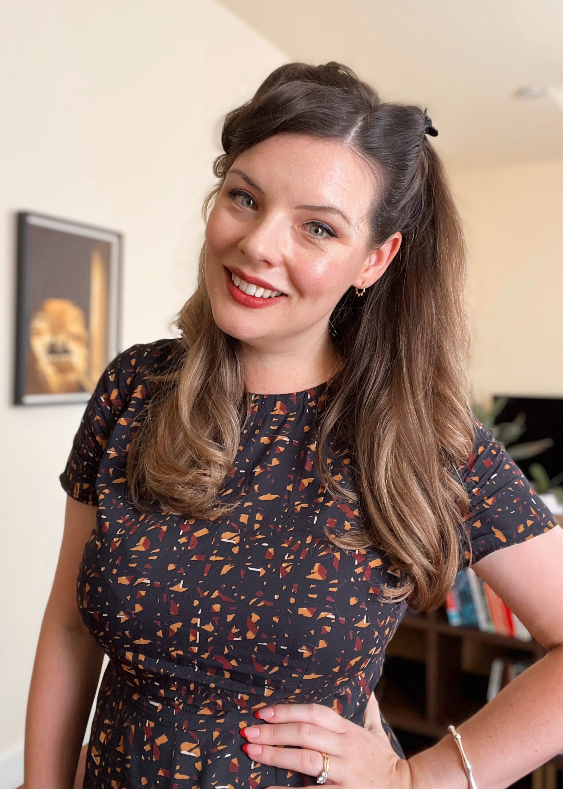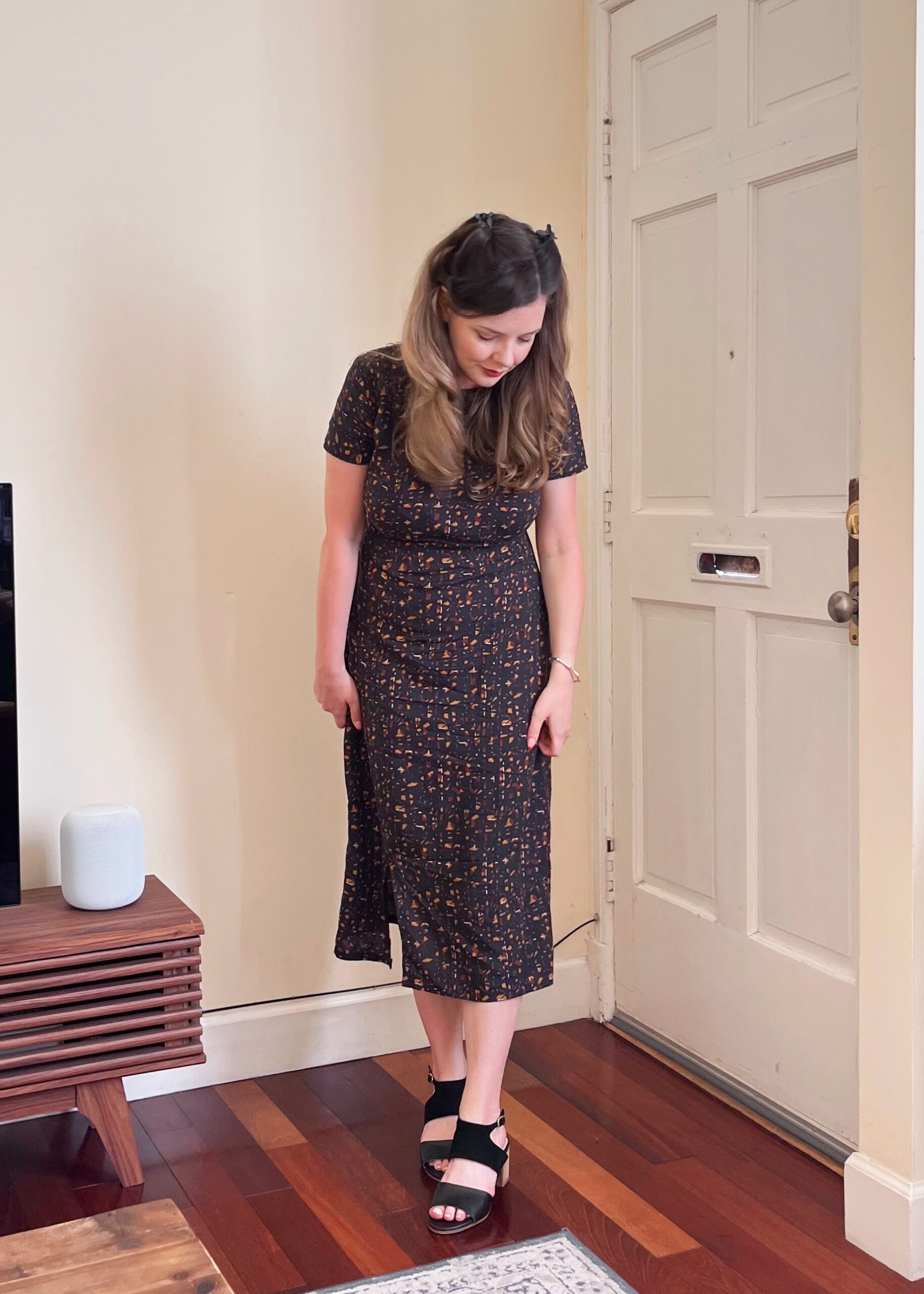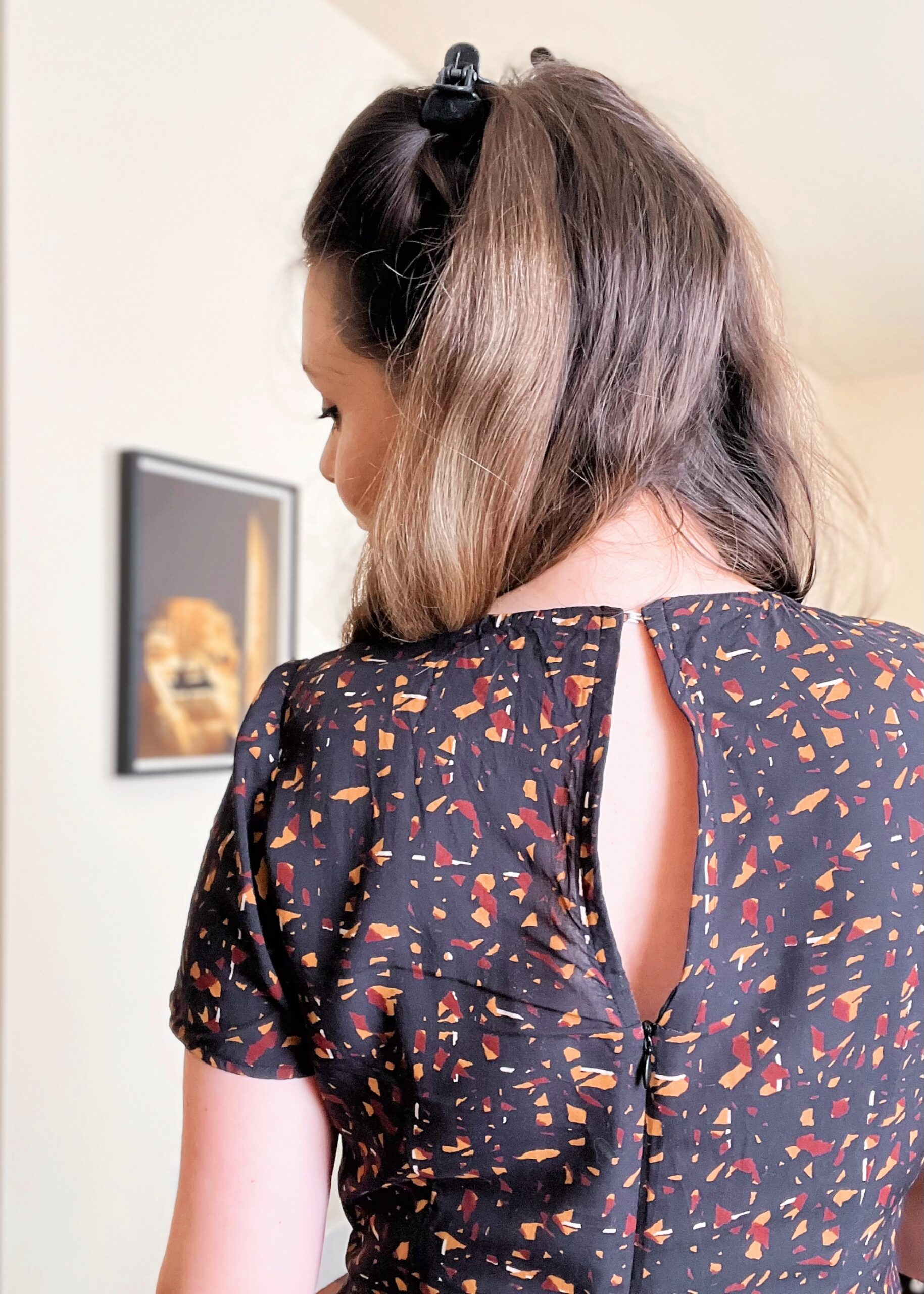 First up, let’s talk about this gorgeous fabric that Minerva kindly sent me! It is a Viscose Modal designed by Atelier Brunette, in the “Tender Toffee” colourway. This fabric is Oeko-Tex certified and woven from Lenzing™️ EcoVero™️ certified fibres, meaning that sustainability is at the core of the production of this fabric. I love the all-over abstract print of shards of light toffee brown and deep mocha brown on the black background; it really does feel very autumnal, like a kaleidoscope of falling leaves. I made sure to pre-wash this fabric, as I am always cautious about any shrinkage with viscoses. I must admit, this was a pretty unusual viscose to sew with, as it has a very smooth hand and crisp drape. It was not at all like a flowy viscose challis… this viscose modal behaved itself during cutting out and was very stable to sew 😄