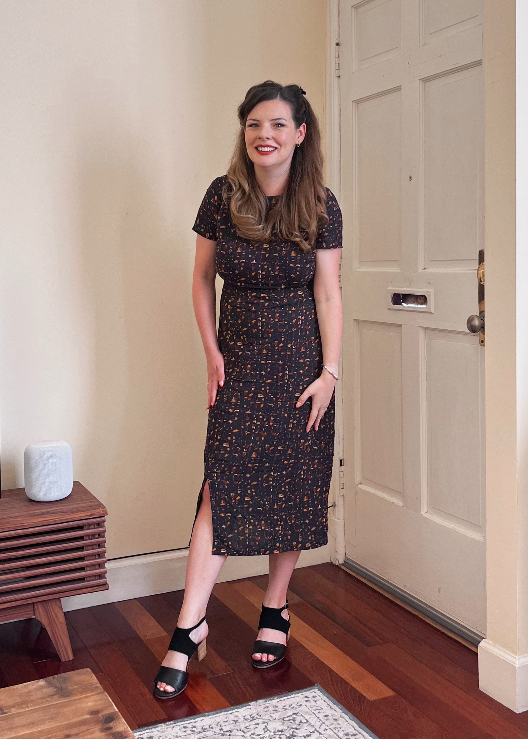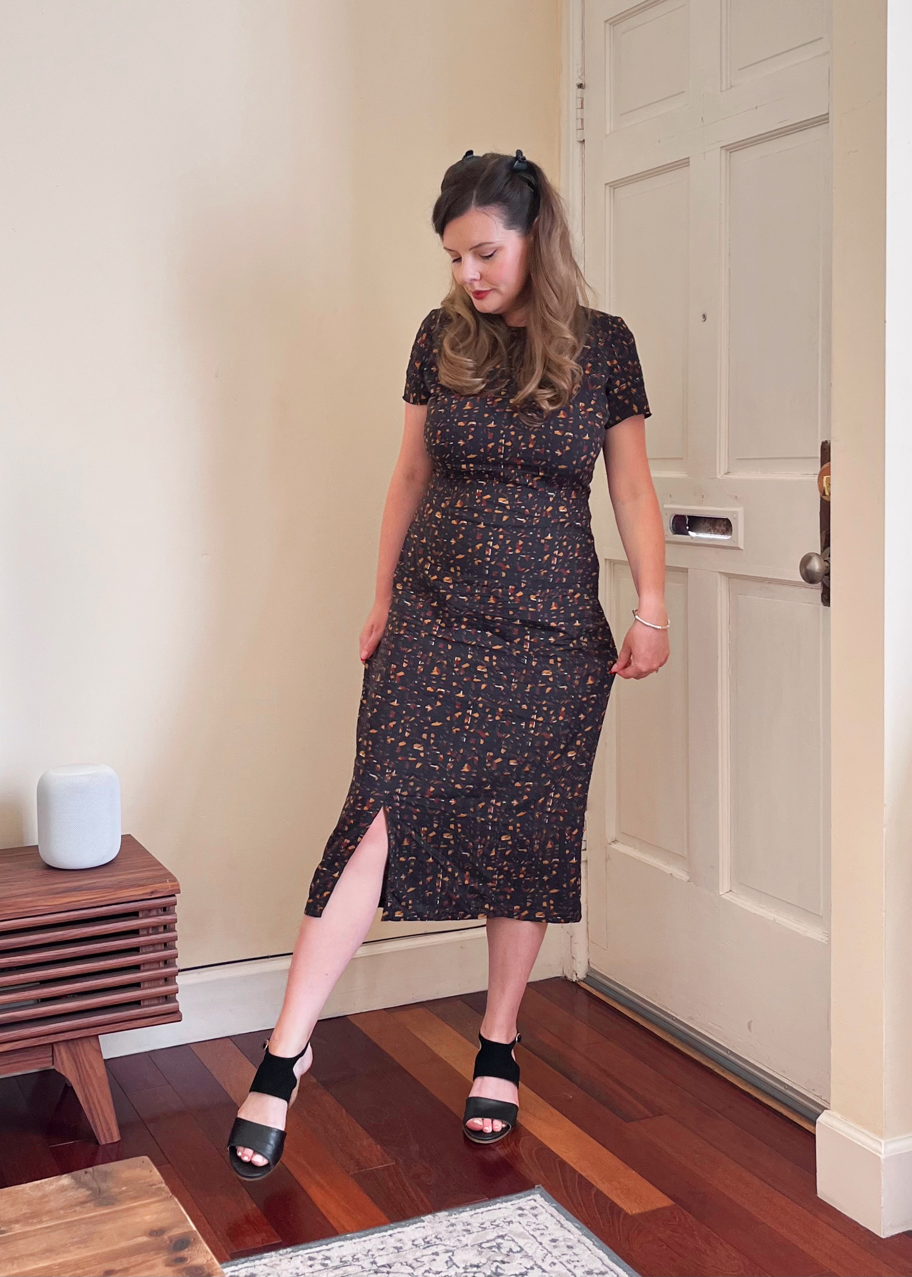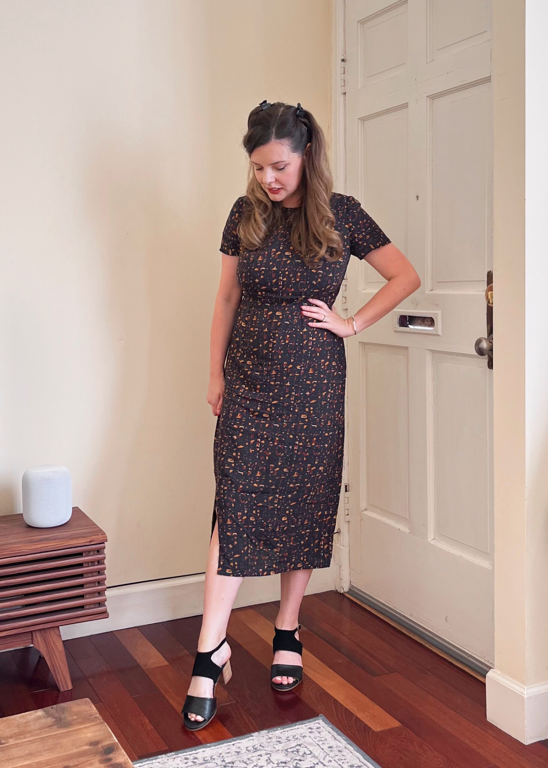 Finding the right pattern for this fabric was a bit of a journey, truth be told. I toyed with several ideas, even cutting out a different bodice for a different pattern initially, before I landed on the Sew Over It Giselle Dress. The Giselle Dress is a semi-fitted sheath dress, with a panelled midi-length skirt with an optional knee-high split, short sleeves, and a round neckline. The back closes with an invisible zip and keyhole opening, and the neckline is finished with self-made bias tape. It is a real versatile pattern with elegant style lines that would be great for hacking — I am already imagining adding billowy bishop sleeves or a twirly circle skirt — but I went for keeping it original this time! I bought the PDF pattern several months back at 50% off and decided now would be the time to take the plunge on it. I spent one evening taping together multiple sheets of paper and making up a toile, before learning the hard way that A4 is not the standard paper size in America *facepalm*. After another evening of taping, tracing and toiling but using the right configurations this time, I was happy to cut into my modal and finally make something from it 😊