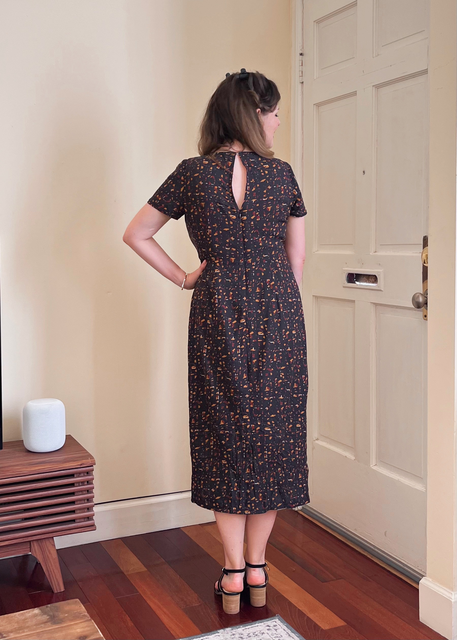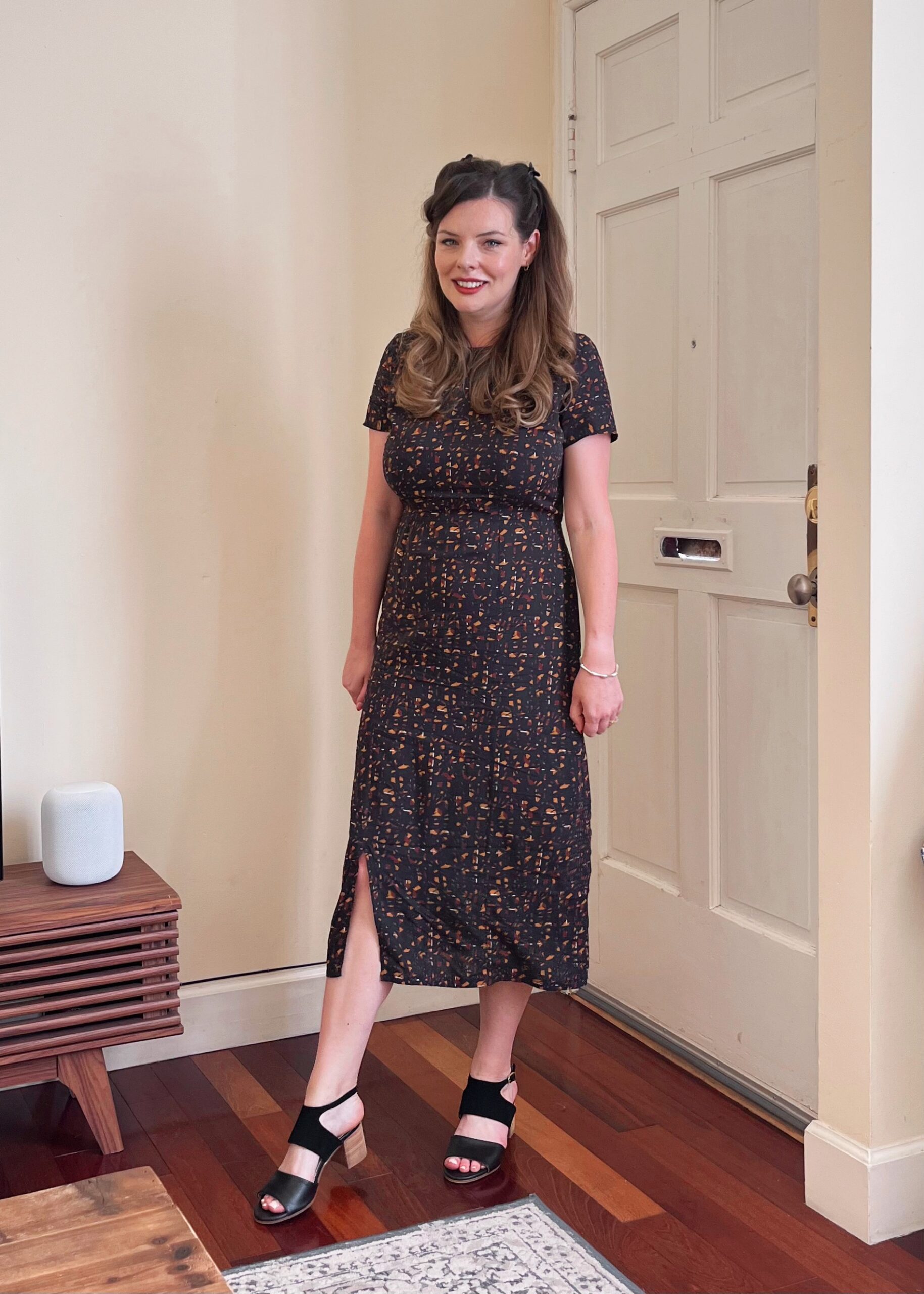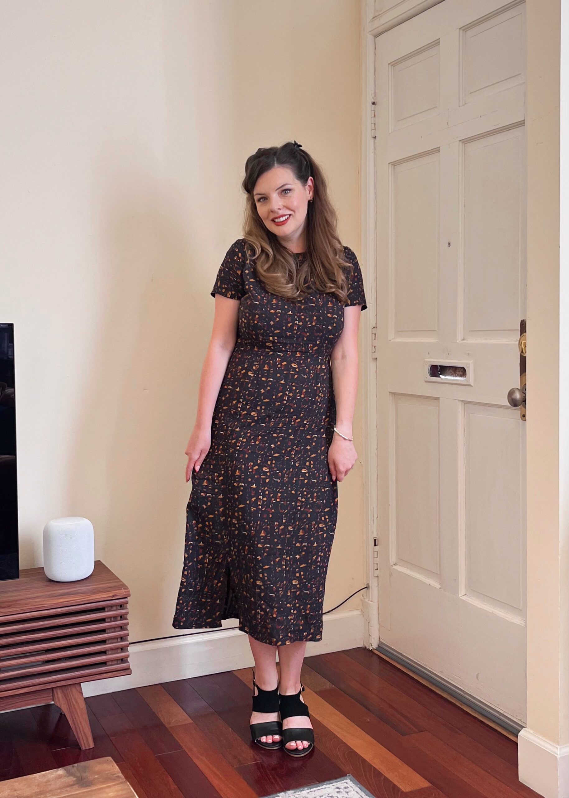 Finding the right pattern for this fabric was a bit of a journey, truth be told. I toyed with several ideas, even cutting out a different bodice for a different pattern initially, before I landed on the Sew Over It Giselle Dress. The Giselle Dress is a semi-fitted sheath dress, with a panelled midi-length skirt with an optional knee-high split, short sleeves, and a round neckline. The back closes with an invisible zip and keyhole opening, and the neckline is finished with self-made bias tape. It is a real versatile pattern with elegant style lines that would be great for hacking — I am already imagining adding billowy bishop sleeves or a twirly circle skirt — but I went for keeping it original this time! I bought the PDF pattern several months back at 50% off and decided now would be the time to take the plunge on it. I spent one evening taping together multiple sheets of paper and making up a toile, before learning the hard way that A4 is not the standard paper size in America *facepalm*. After another evening of taping, tracing and toiling but using the right configurations this time, I was happy to cut into my modal and finally make something from it 😊