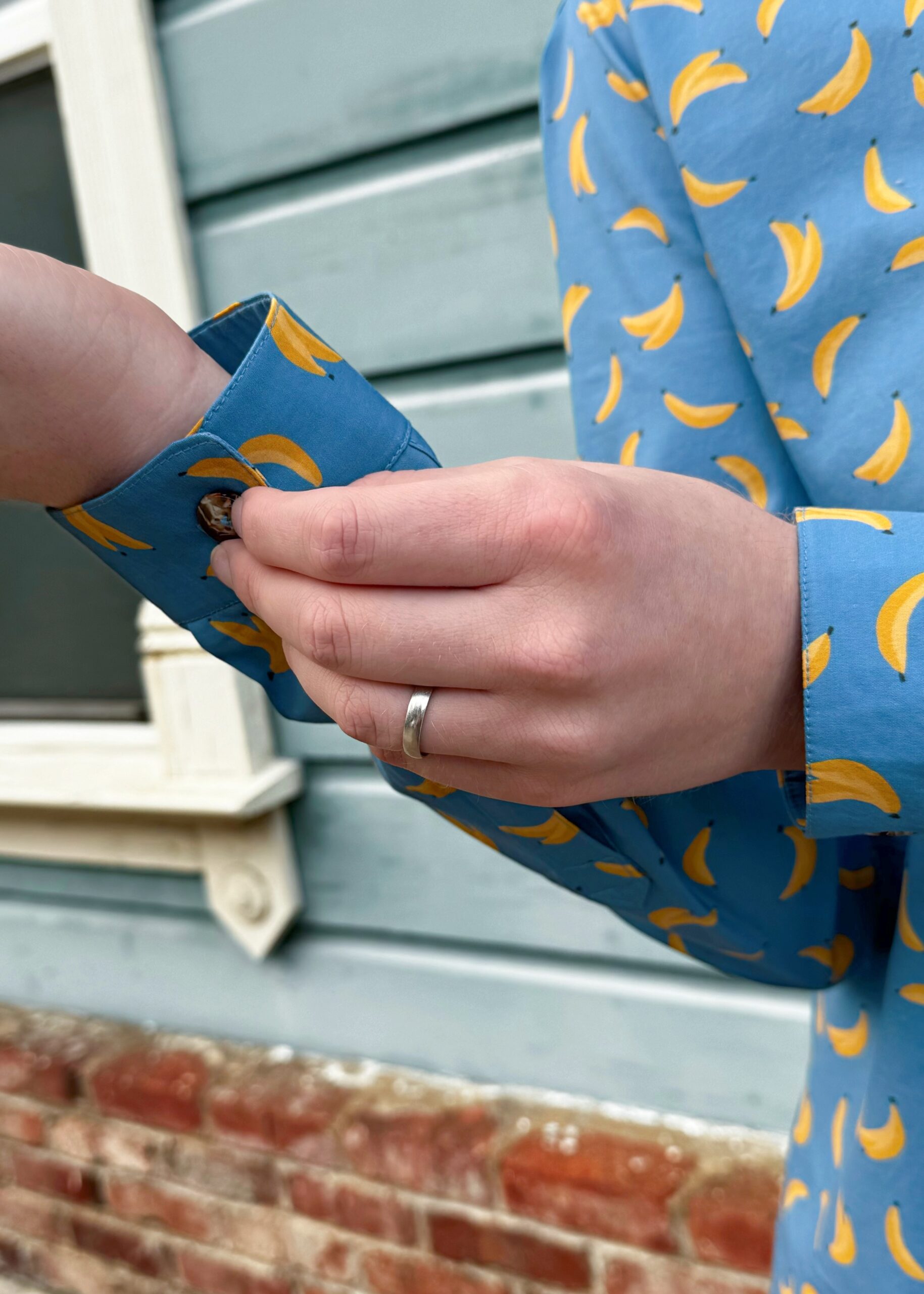 The fabric is a design from Hawthorne Supply Co., and you get to select what substrate you want to use; I chose cotton poplin for a proper crisp shirt, but they also sell this print in various jersey weights, cotton lawn or heavy cotton twills. I lowkey kinda want to make myself another baseball tee with this banana fabric; however, I am genuinely afraid that this will open the floodgates and suddenly everything that Simon and I wear will be banana-themed… but I digress. This poplin is great quality — it was very stable to sew, easy to cut without a huge amount of fraying, and the colours stayed vibrant after pre-washing. I do find that cotton poplins seem to magically hoover up every stray offcut of thread though… Is this just me?! I also used my favourite Pigeon Wishes resin buttons in the shade ‘Chai Latte’, which is the perfect finishing touch — the swirls of warm browns and cream are muted enough to not compete for attention against the zany fabric.