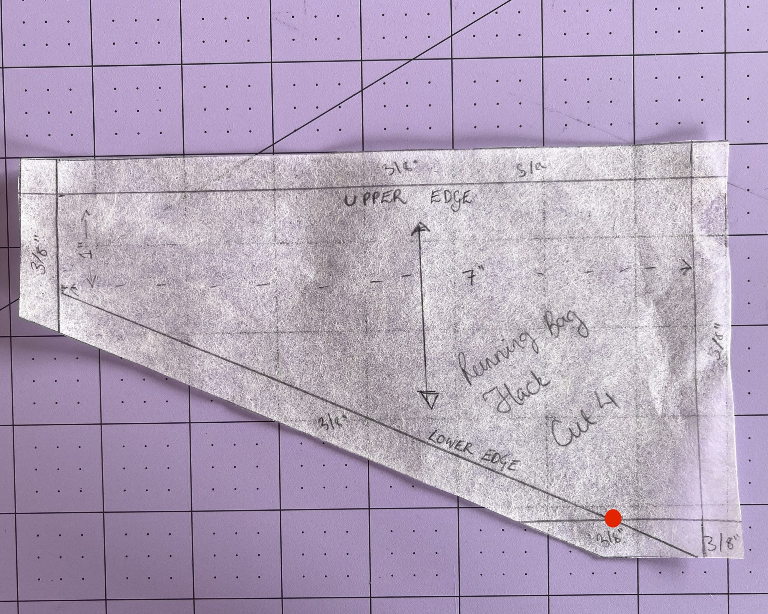 Using the Main Bag pattern piece, mark the 3/8″ seam allowance on the upper notched edge and the 3/8″ seam allowance on the lower unnotched edge.