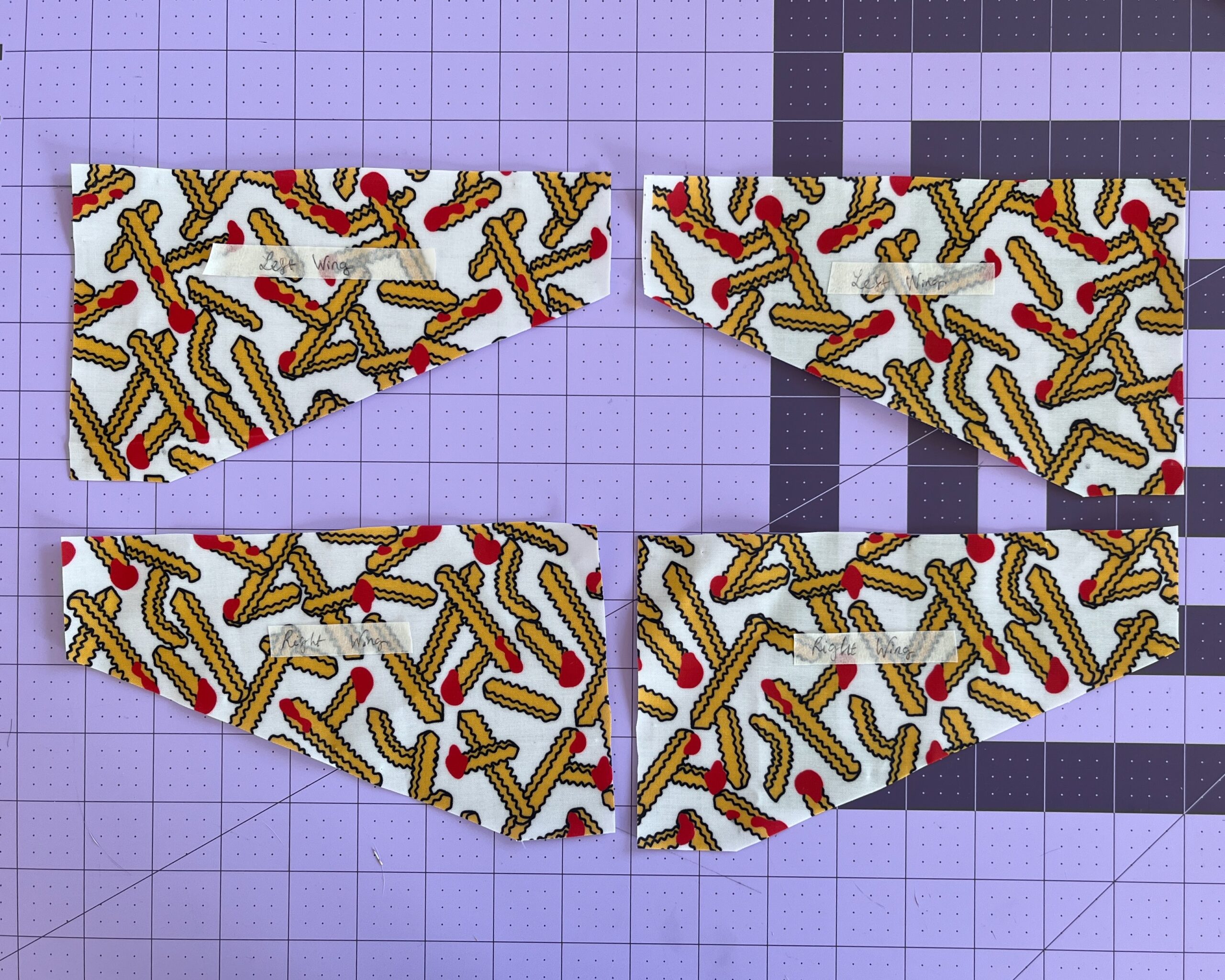 - Wing extensions: cut 4 in your waterproof fabric and label 2 “Left Wing” and 2 “Right Wing”
