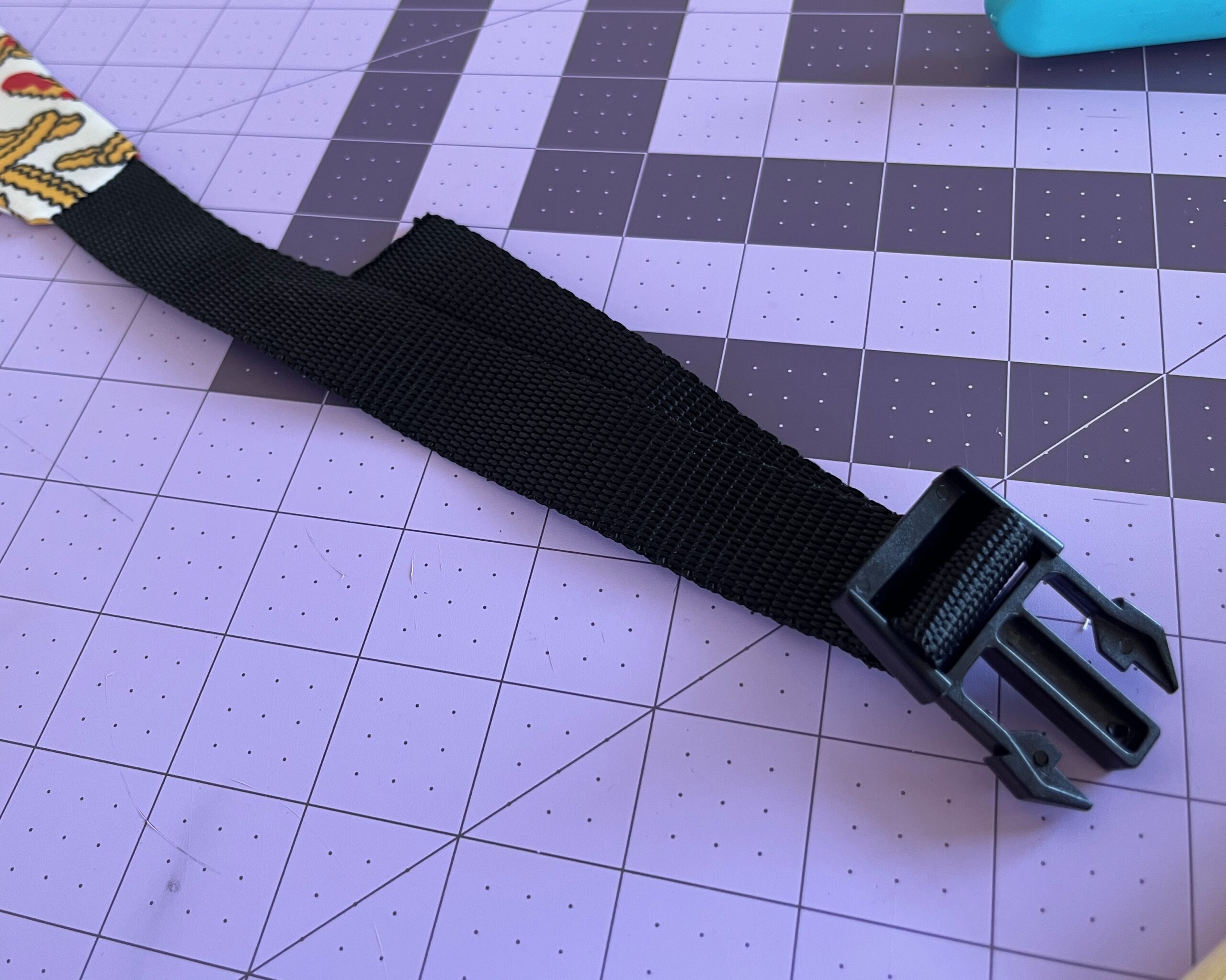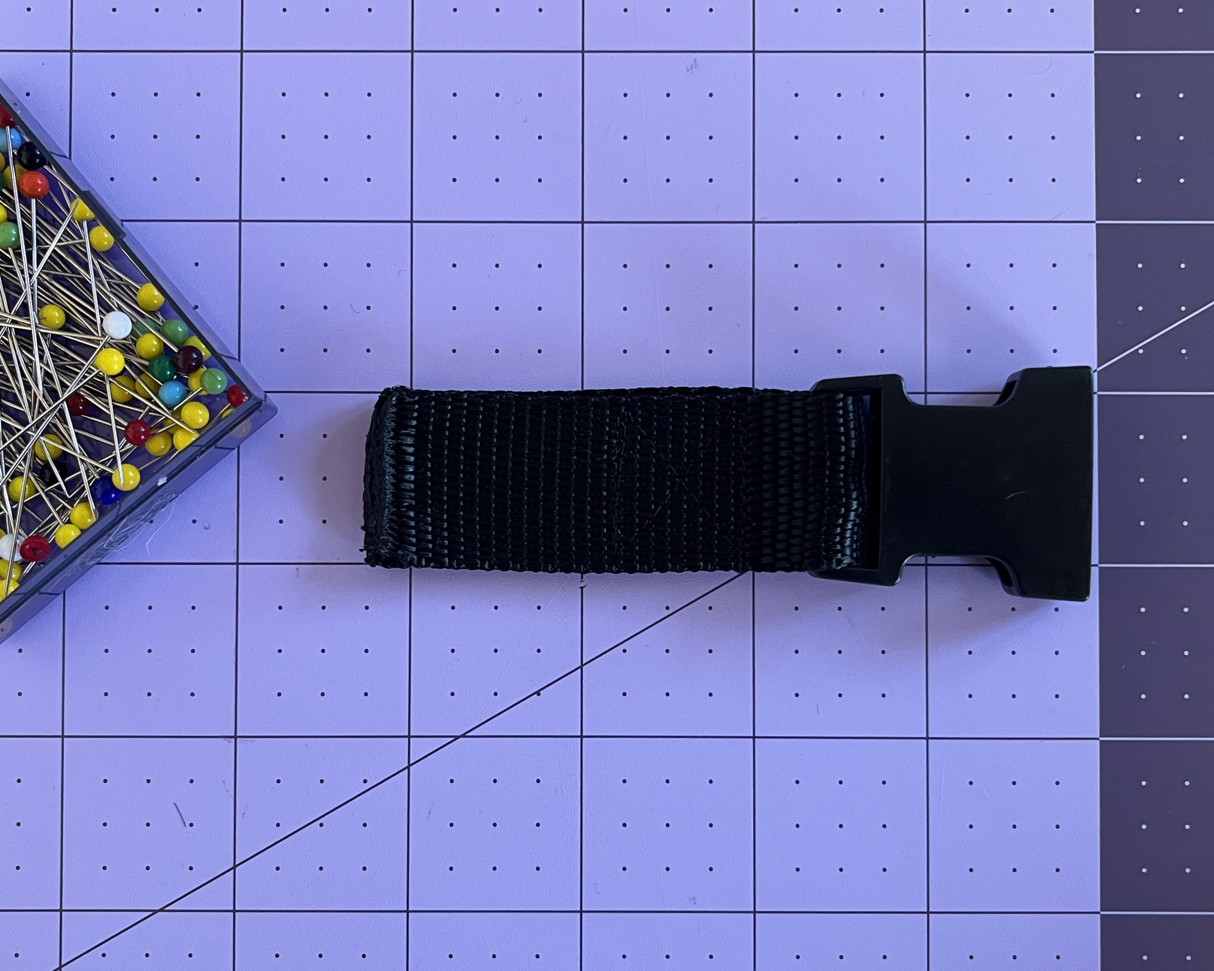 - Cut a 6” section of webbing and loop the female side of the buckle onto the webbing at exactly halfway. Fold the strap back on itself and reinforce stitching to keep the buckle in place.