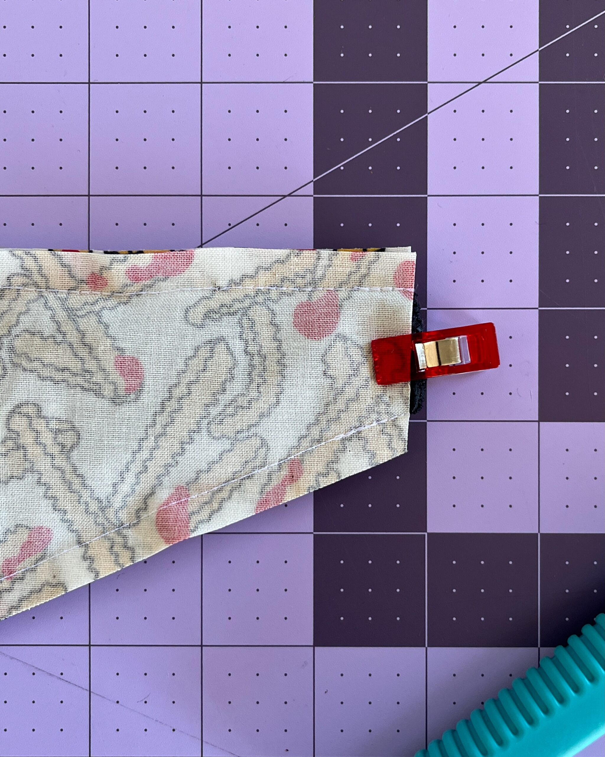 - Clip and trim the seam allowance and turn the right side out. Baste the unstitched edge wrong sides together using a 1/4″ seam allowance. This is to help secure the layers from shifting around when later sewing the bag up.