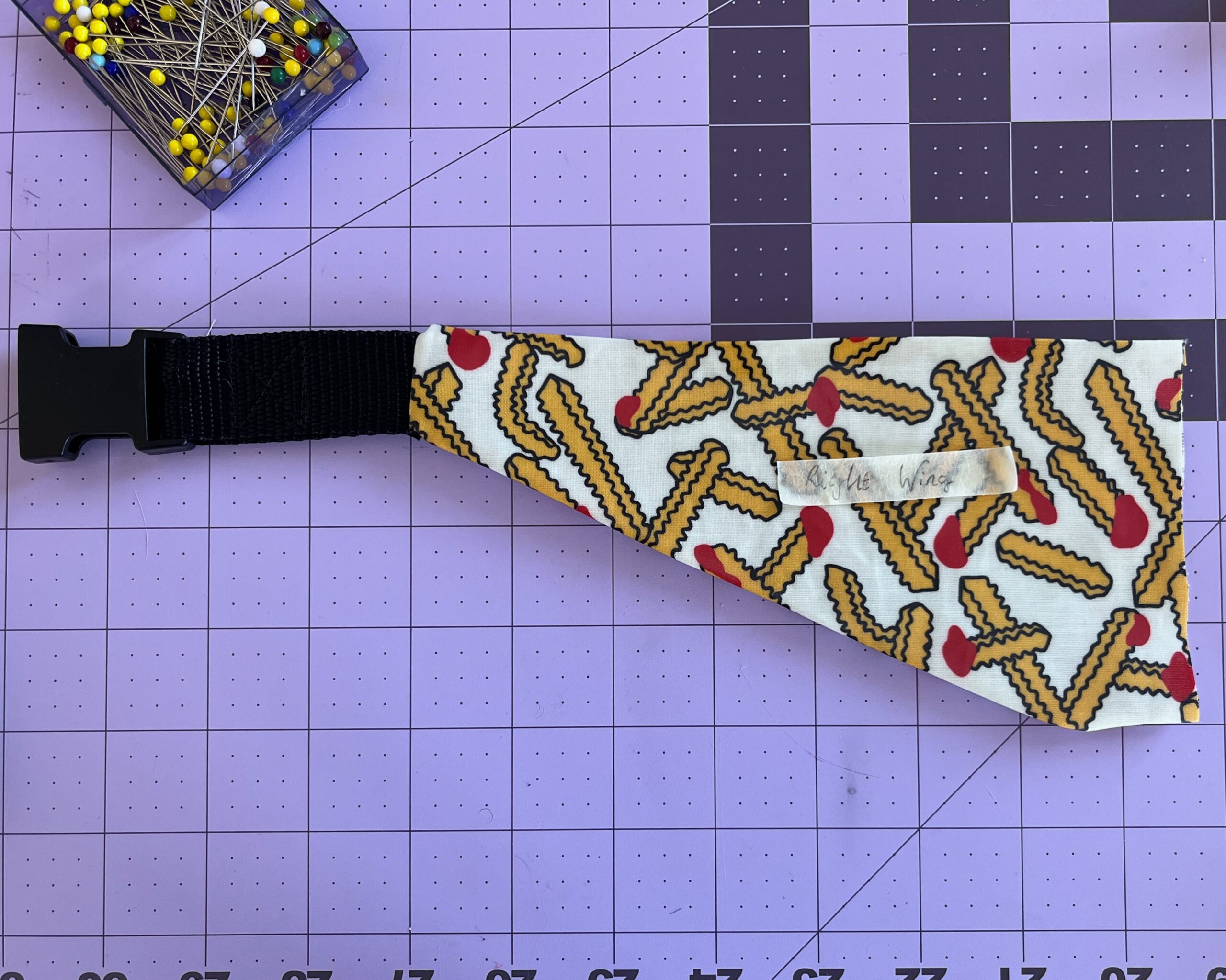 - Slide the webbing and buckle into the Right Wing Extension, between your previous two lines of stitching. With the raw edge of the webbing aligning with the raw short edge of the extension, stitch into place using a 3/8” seam allowance. Reinforce stitching.