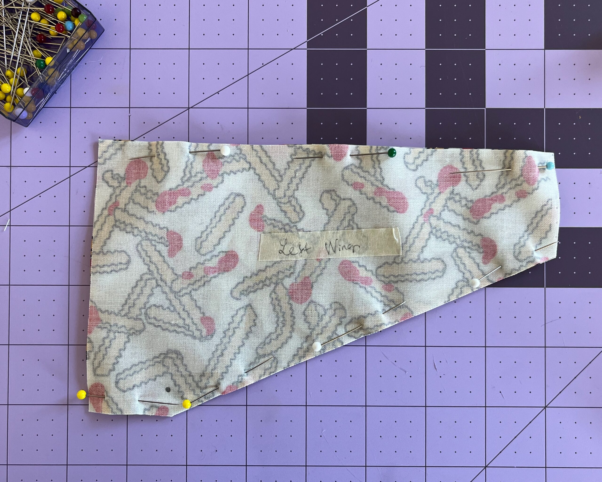 - Next, let’s move on to the Left Wing Extension! Place the two pieces right sides together. Stitch the upper edge using a 3/8” seam allowance. Stitch the lower edge using a 3/8″ seam allowance, pivoting at the dot.