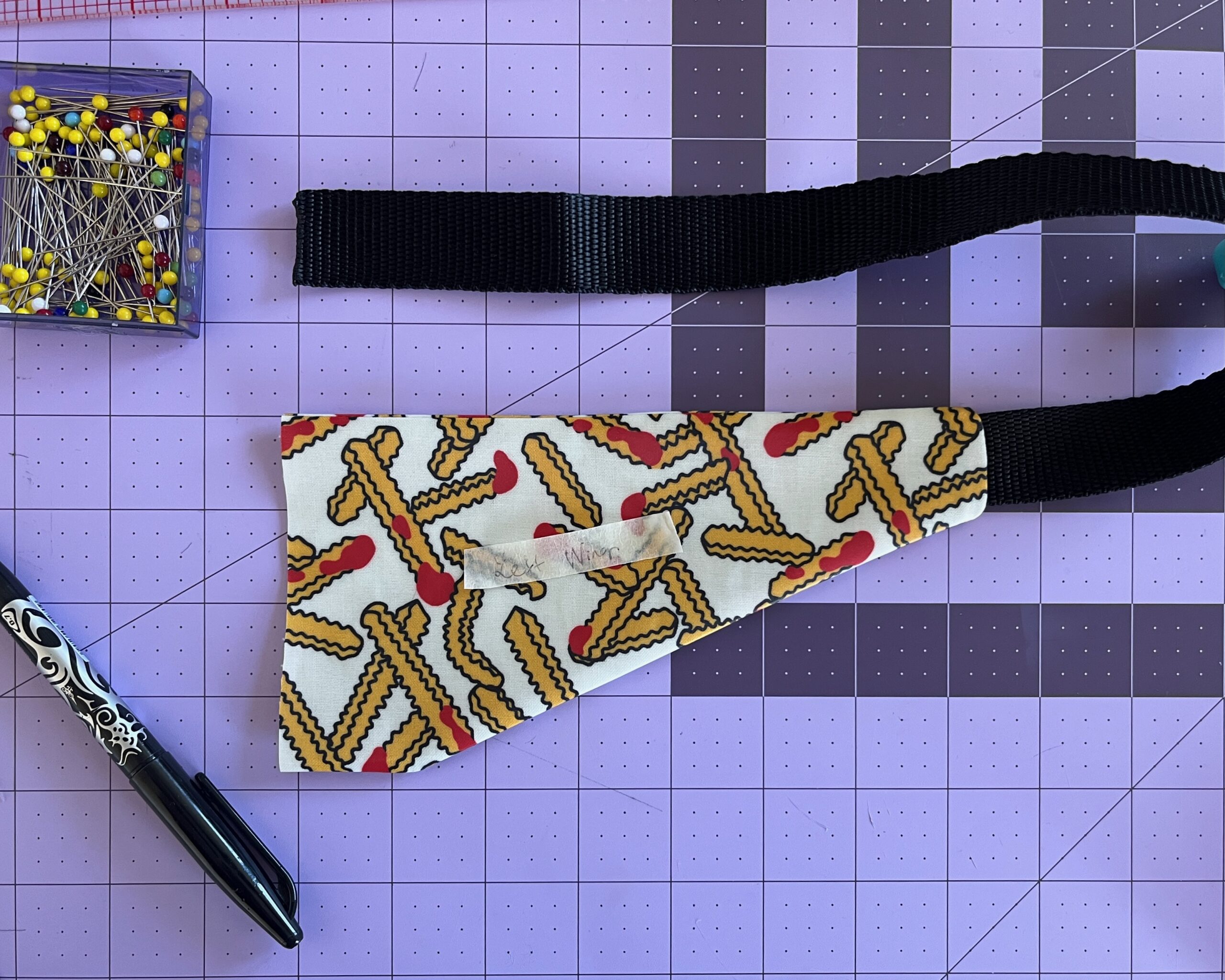 - Cut a piece of webbing which is approximately half of your total waist measurement. Slide the webbing into the Left Wing Extension, between your previous two lines of stitching. You shouldn’t create a loop this time; instead, keep the webbing flat. With the raw edge of the webbing aligning with the raw short edge of the extension, stitch into place using a 3/8” seam allowance. Reinforce stitching.