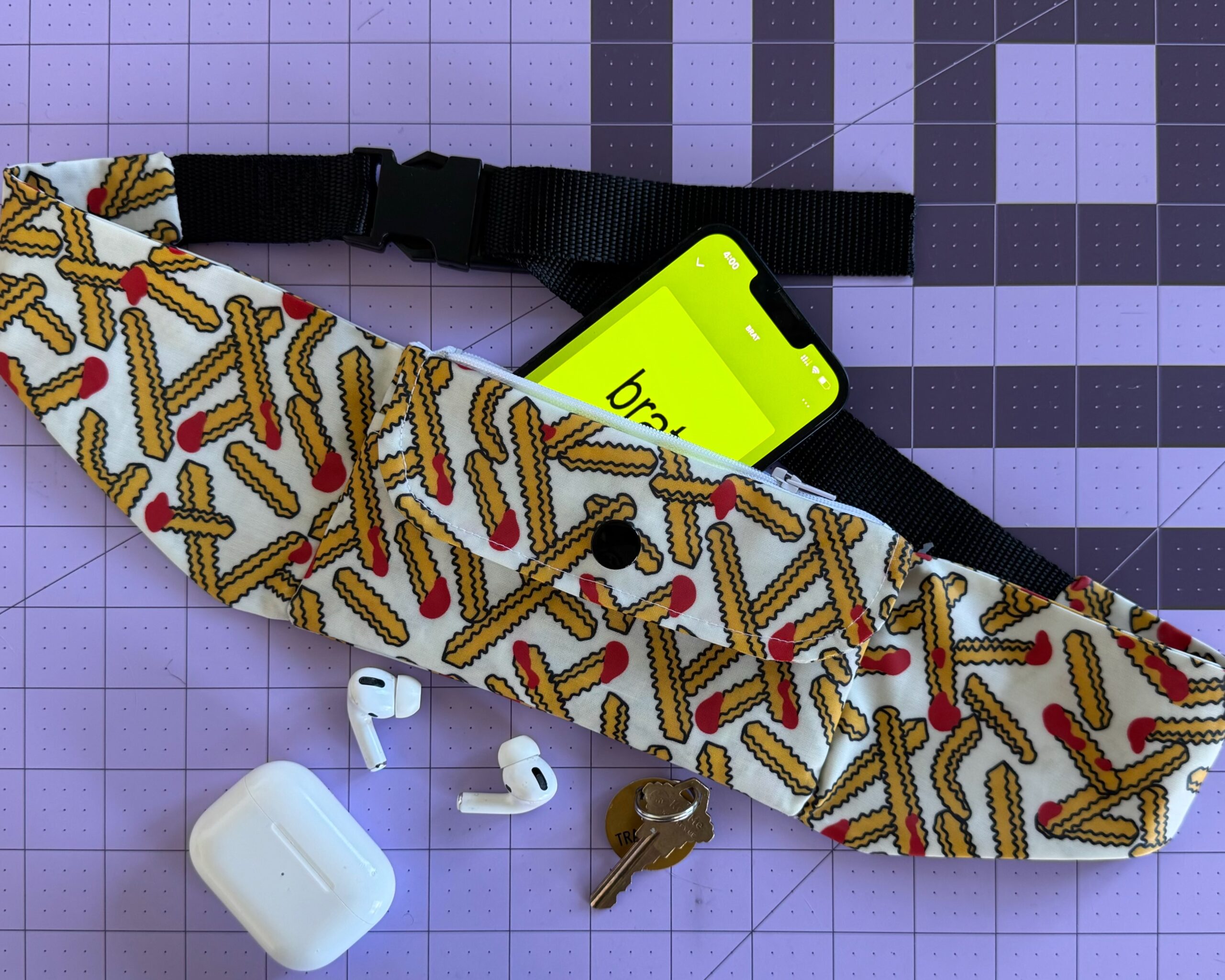 Since moving to San Francisco in the summer, Simon and I have been going on runs along the coast, which have been on occasion rather misty and damp! I decided to make a handy running belt to keep my phone, headphones and keys safe, so I hacked the basic shape of the Friday Pattern Co Bernie Bag to create this version. I used this laminated cotton from Stonemountain & Daughter Fabrics, which encapsulates my “I would much prefer to be eating fries right now” attitude to exercise 😅