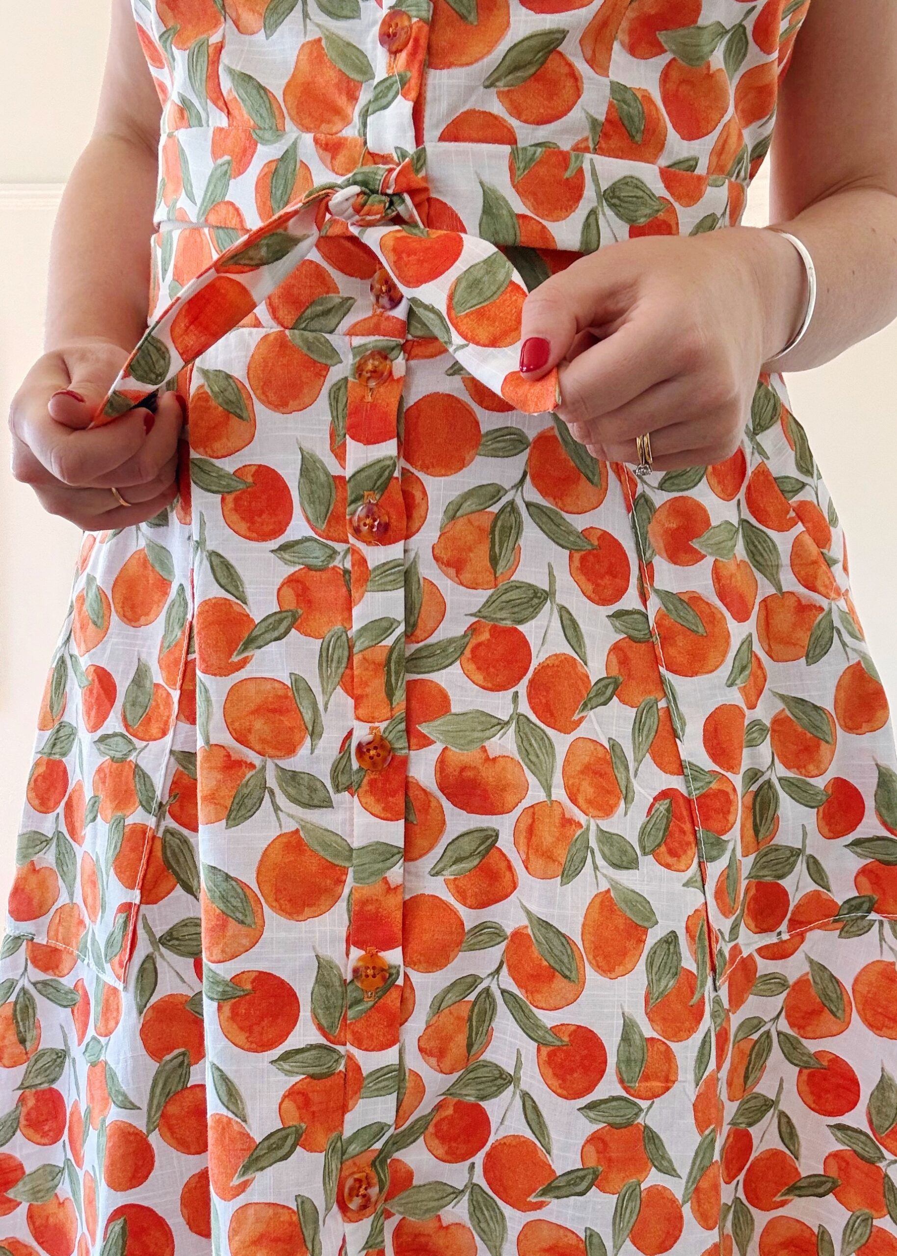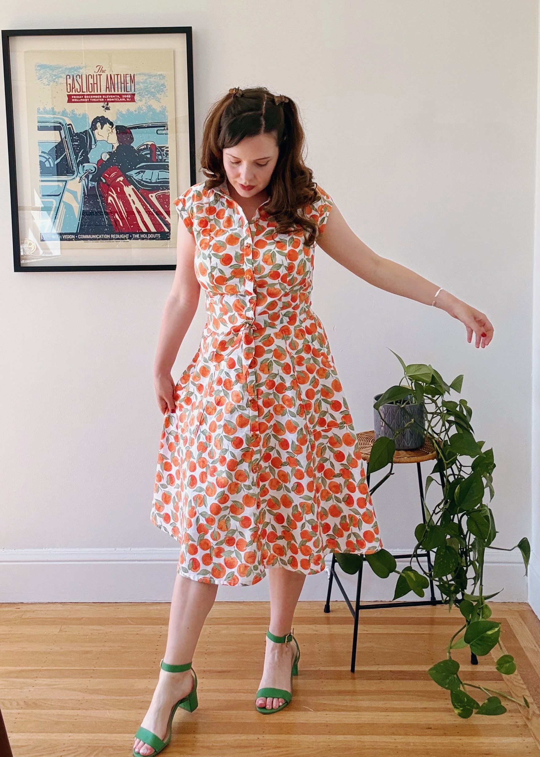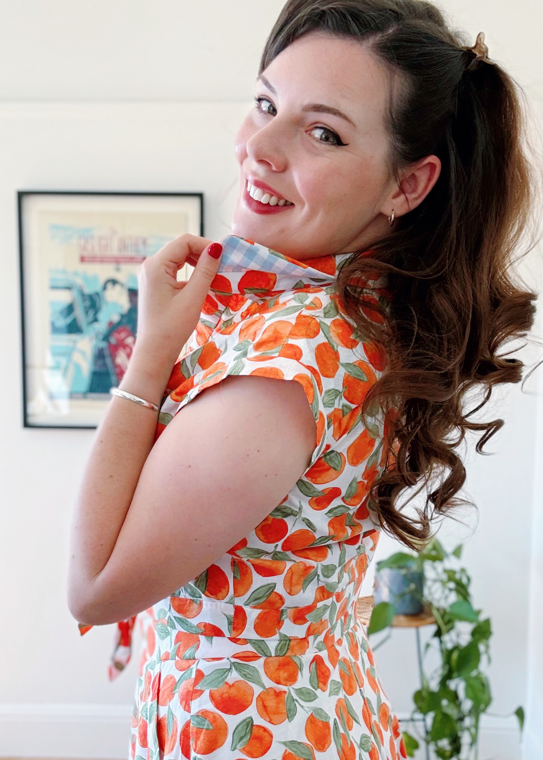 I am someone who loves having a fabric stash; I find just looking at the fabrics I already own can help spark my creativity, for it all to just suddenly click into place, and then I know what I want to sew next. But I really don’t like my fabrics to stay in the stash for too long, as then they begin to feel like they are too special, too precious, too risky to cut into. This juicy linen-look cotton wasn’t particularly expensive, but I had kept it in my ‘precious fabrics’ stash for a while, as the print is so cheerful and pretty much perfect. When I was writing up my seasonal sewing plan, I took out lots of different fabrics from my stash and draped them on me to help me decide what to include. I realised the lightweight nature of this fabric would be so lovely for warm weather, and I decided I had waited on it long enough. I added this fabric to my summer sewing plans, as I really wanted to finally make something up in it. I finished this dress just in time to take part in the #SewFruity25 challenge on Instagram, which was such a fun time and so inspiring for ideas of future garments. I am so glad I took scissors to this fabric and made something I can now wear!