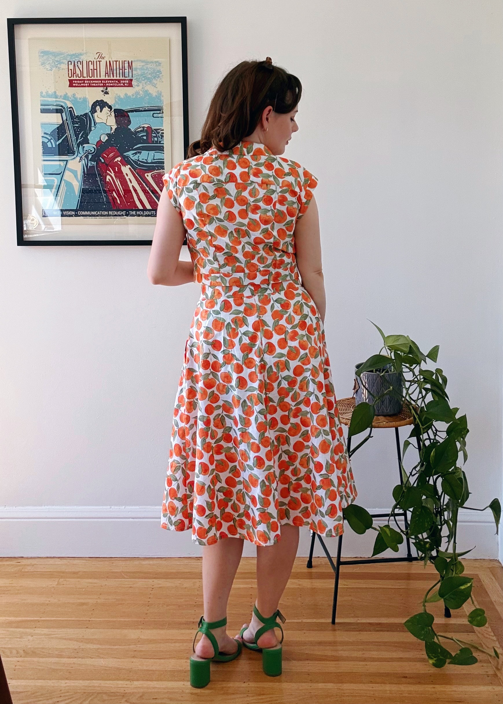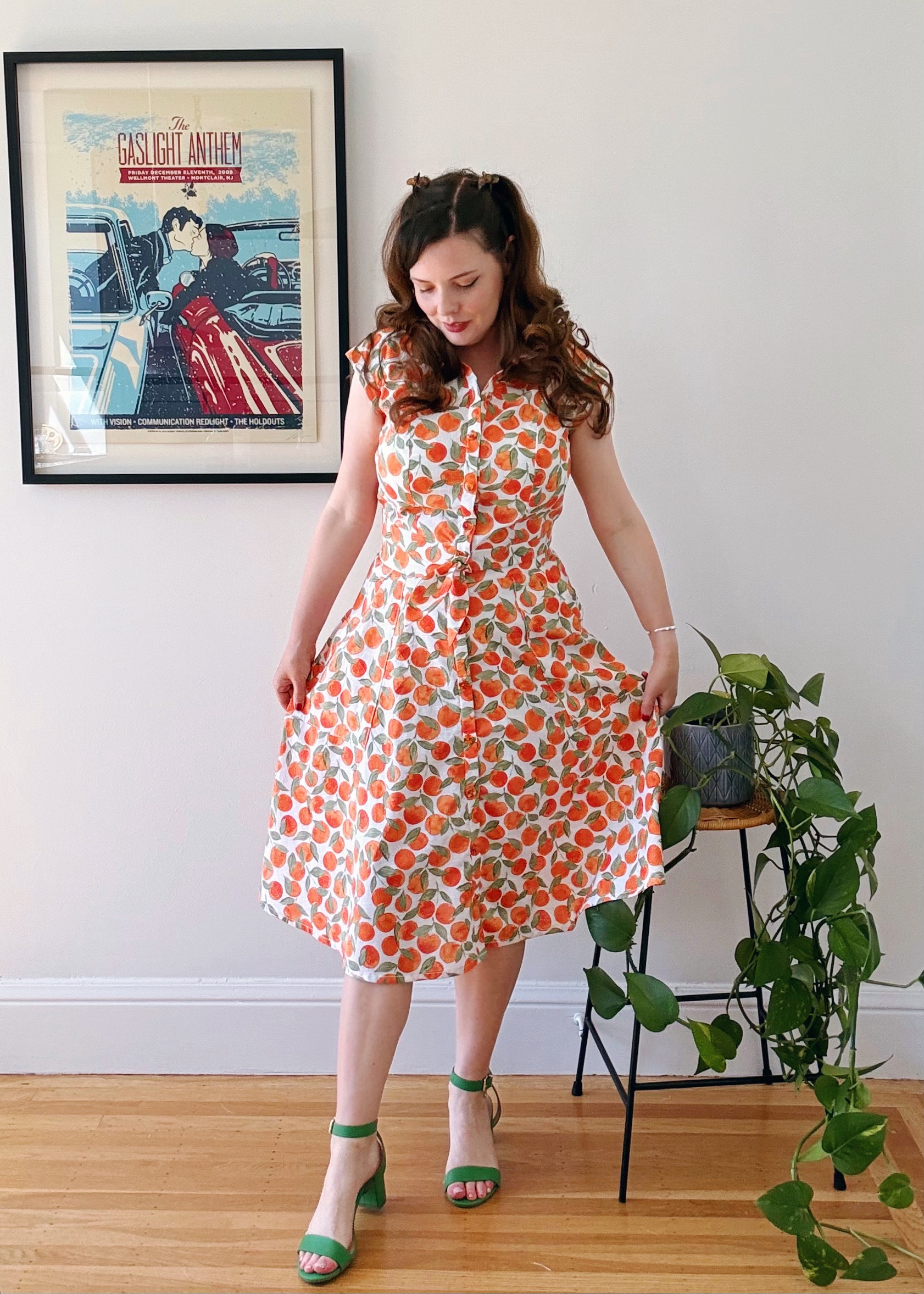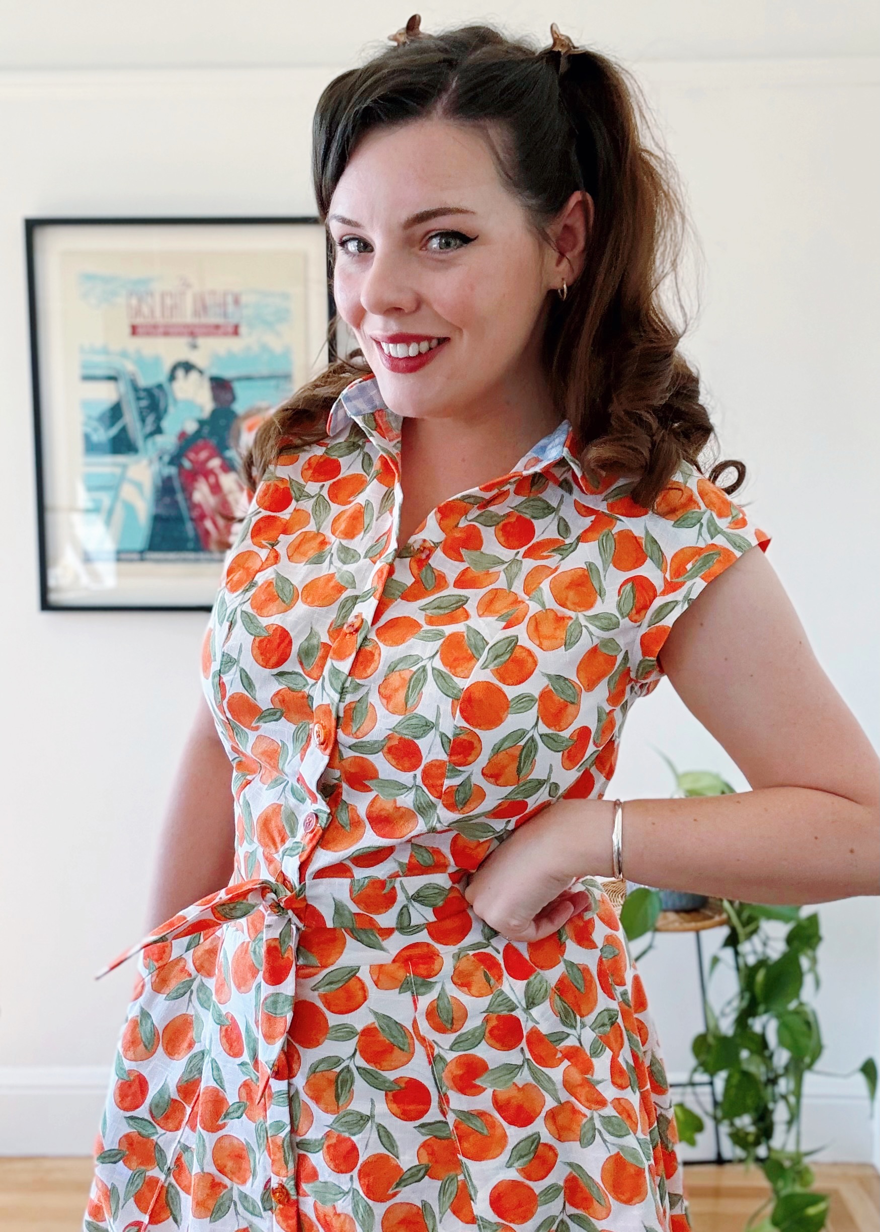 I am someone who loves having a fabric stash; I find just looking at the fabrics I already own can help spark my creativity, for it all to just suddenly click into place, and then I know what I want to sew next. But I really don’t like my fabrics to stay in the stash for too long, as then they begin to feel like they are too special, too precious, too risky to cut into. This juicy linen-look cotton wasn’t particularly expensive, but I had kept it in my ‘precious fabrics’ stash for a while, as the print is so cheerful and pretty much perfect. When I was writing up my seasonal sewing plan, I took out lots of different fabrics from my stash and draped them on me to help me decide what to include. I realised the lightweight nature of this fabric would be so lovely for warm weather, and I decided I had waited on it long enough. I added this fabric to my summer sewing plans, as I really wanted to finally make something up in it. I finished this dress just in time to take part in the #SewFruity25 challenge on Instagram, which was such a fun time and so inspiring for ideas of future garments. I am so glad I took scissors to this fabric and made something I can now wear!