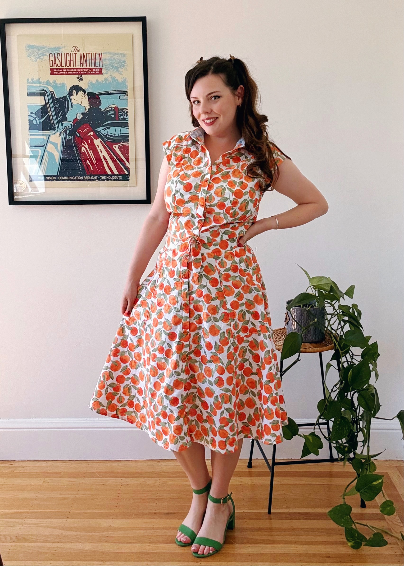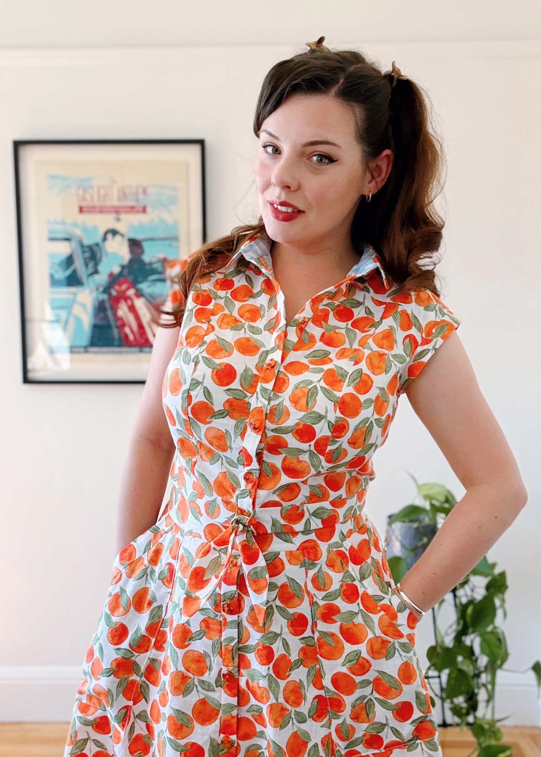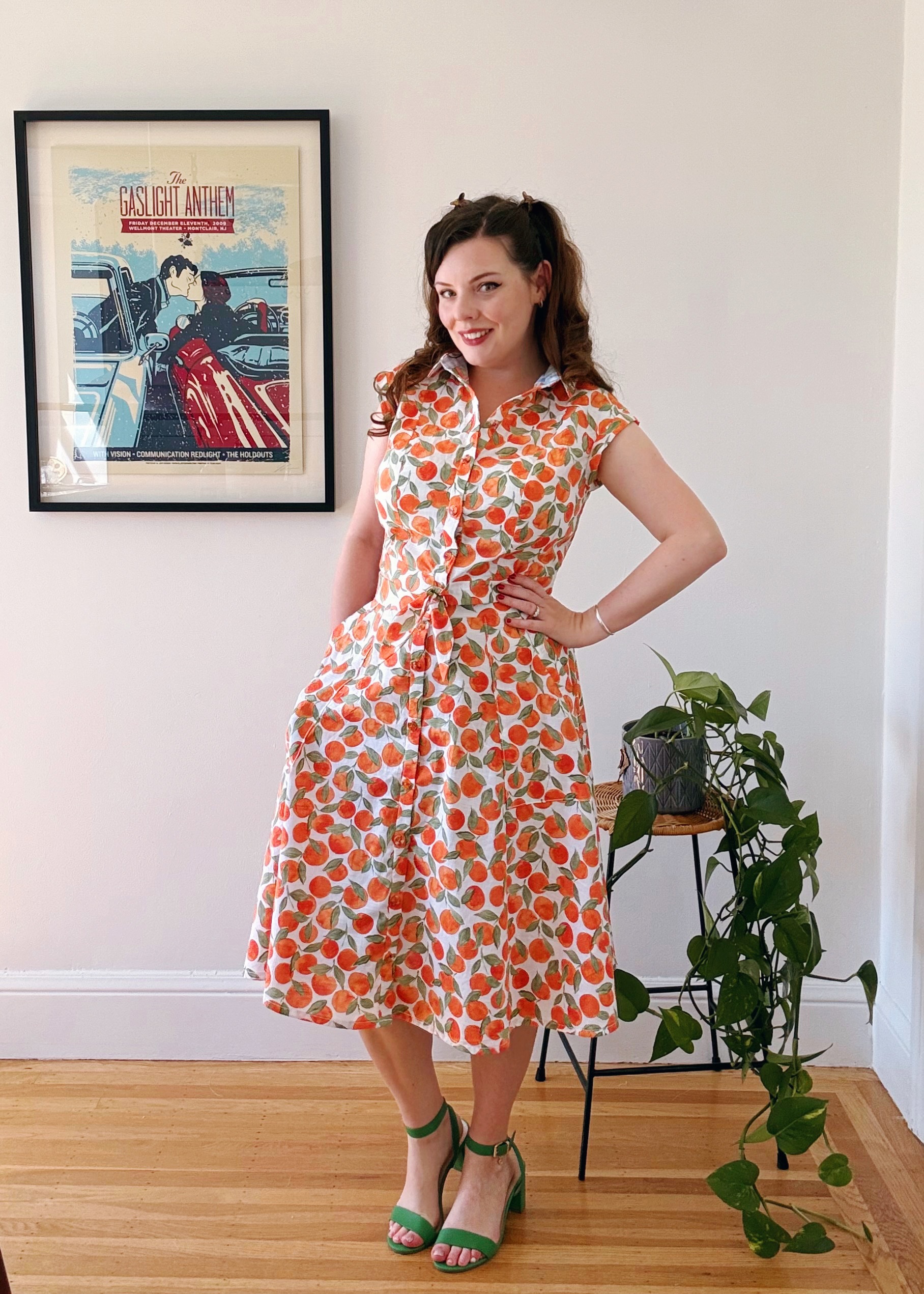This clementine print cotton is soft and flowy, with a slight, natural textured hand — there is a slub in the weave that makes the cotton look like linen (but a lot less wrinkly!). I adore the painted watercolour design of the clementines, there is something about it that feels slightly vintage. It was a dream to sew with — cutting, pressing, pinning, and stitching were all easy. As I mentioned earlier, this fabric had been in my stash for quite a while, as I bought 3m from Stitch Fabrics back in 2022. At the time, I knew I wanted to pair this fabric with a pattern with a more vintage feel, but I hadn’t exactly worked out what that would be. A shirt dress felt like the most likely choice, but I didn’t feel like making a muslin to work out the fitting needed for Simplicity 8014, plus I wanted something with a different style: more utilitarian, with clean lines.