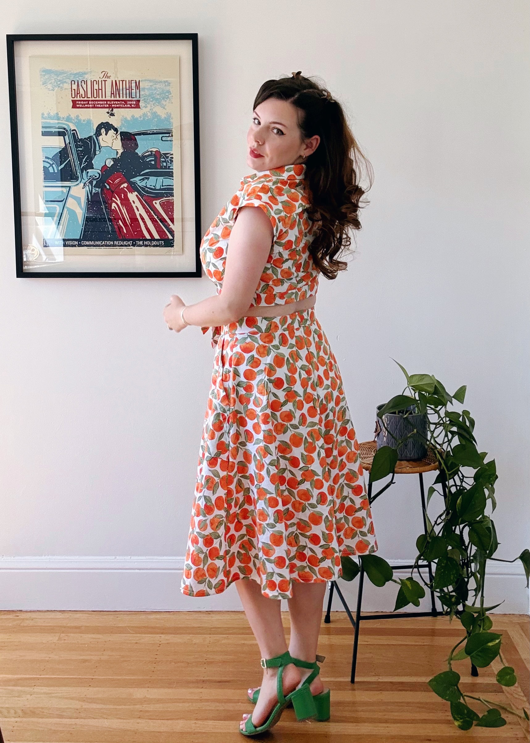 This finished co-ord has been lovely and light during the recent warm weather. Making a co-ord was the right call, as it has been really versatile; I have been wearing the shirt with high-waisted jeans, the skirt with slouchy striped tees, and then wearing them together for a matchy-matchy style. I am planning to make a pair of orange linen shorts to also coordinate with the shirt, but I still need to seek out the right fabric weight. I would definitely make the Matilda dress again — I would opt for the bodice with sleeves and then use contrast piping to highlight all the style lines.